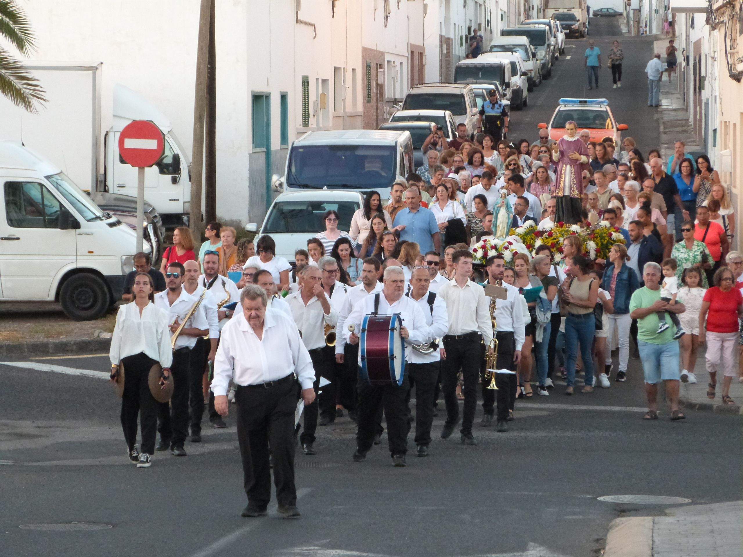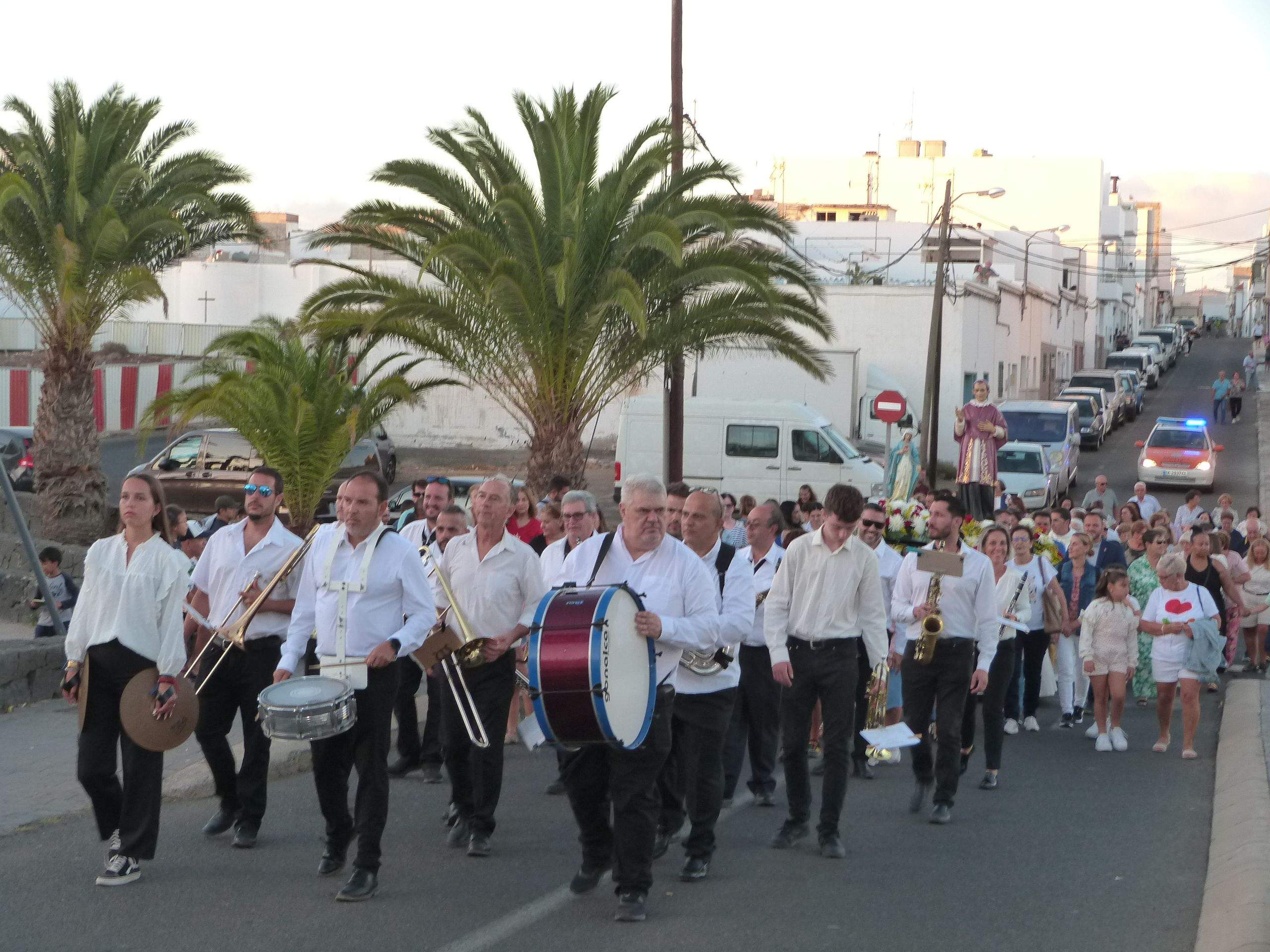Una festividad especial en la que los cantos fueron interpretados por los feligreses que estaban acompañados al piano por el profesor Manuel Mauri. Una vez finalizada la Eucaristía, se puso en marcha el cortejo procesional encabezado por la banda de música 'Unión Musical de Lanzarote', dirigida por el profesor Pepe Artiles y seguida de la imagen del Sagrado Corazón de María portada a hombros por madres, padres y niños y niñas que se están preparando para recibir su primera comunión.