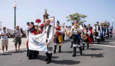 Mientras tanto, en la Boca del Muelle Chico, junto al histórico Puente de Las Bolas, aguardaba la imagen del Santo Patrón San Ginés, acompañado por su párroco Juan Carlos Medina, y numeroso feligreses. Estos habían partido minutos antes desde la iglesia matriz, llevando al santo en una breve pero emotiva procesión.