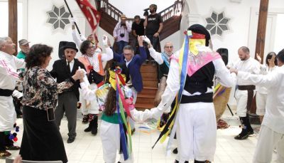 Posteriormente, el público fue testigo de cómo realmente se viste un buchero, cuando uno de los componentes bajó por la escalera central de la Casa de la Cultura y se despojaba de su ropa marinera y con la ayuda de sus compañeros le fueron colocando cada una de las piezas de la vestimenta tradicional que lleva un 'Buchero', momento en el que la parranda interpretó una habanera dedicada a César Manrique, socio y diseñador de la careta que en la actualidad lucen Los Buches.