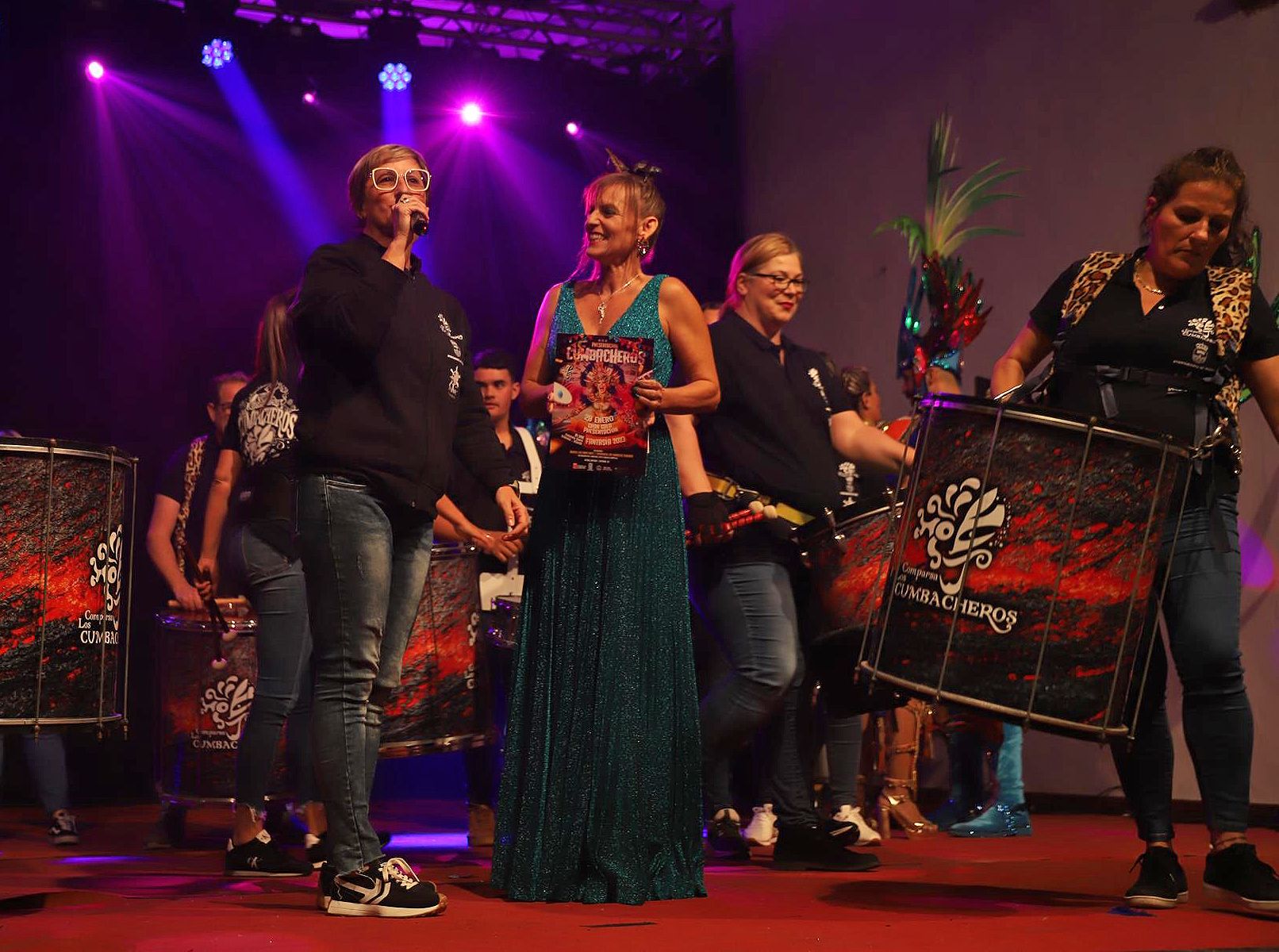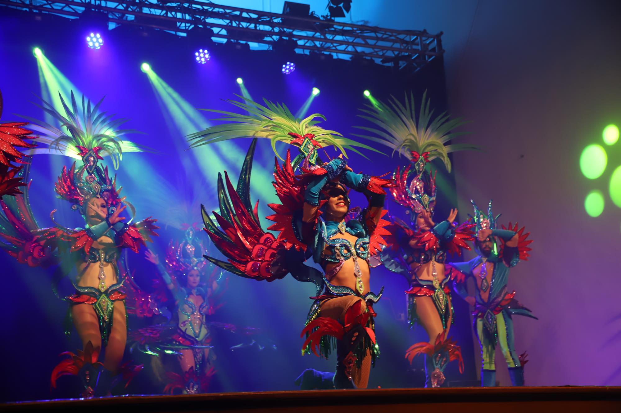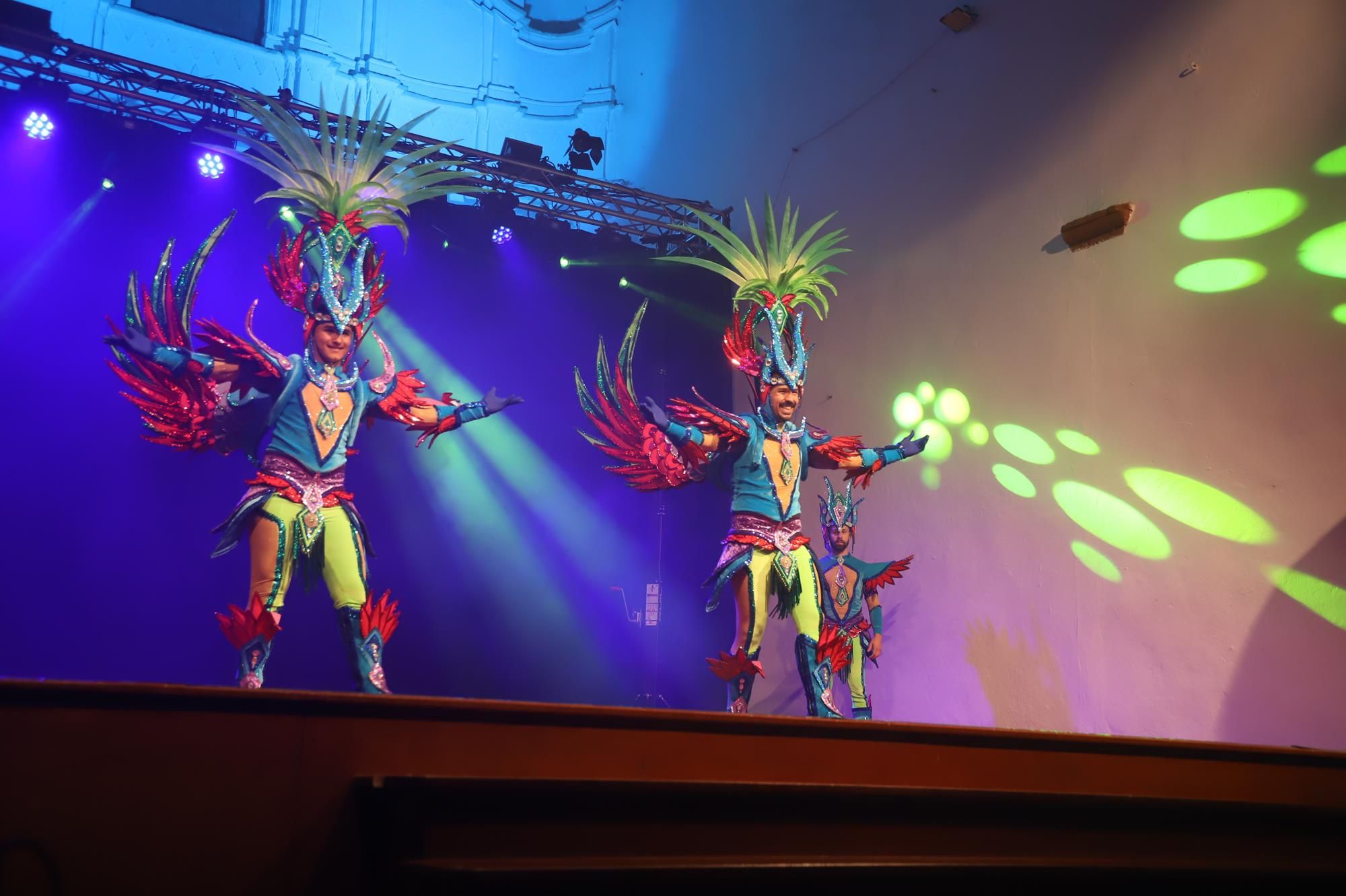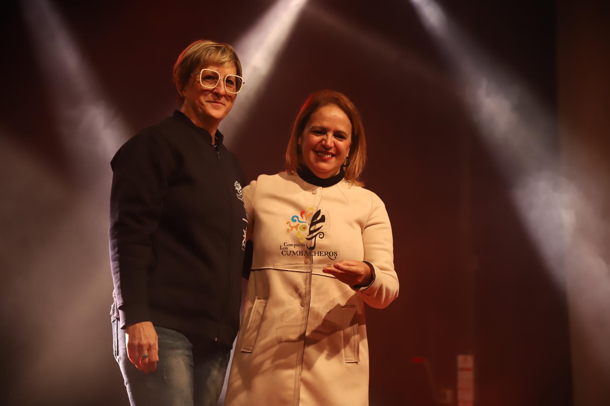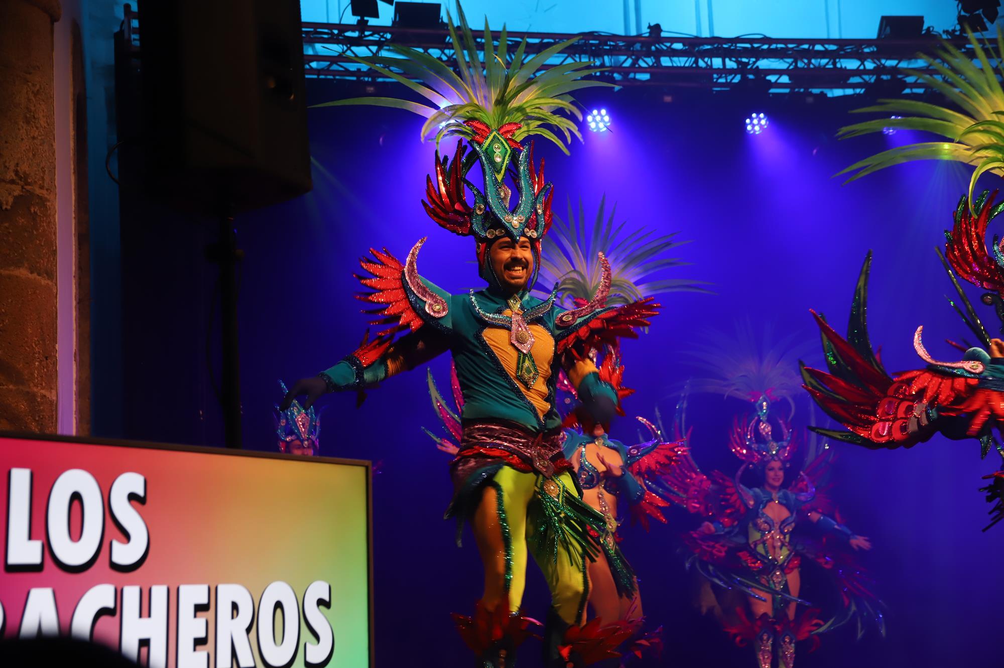 Y, finalmente llegó el momento más esperado de la noche, ver la puesta en escena de los anfitriones, La comparsa Los Cumbacheros fue fundada en el año 2012, por lo que ya son 12 años participando activamente en el Carnaval. Sergio Níz tiene la responsabilidad de presidir la misma recayendo también en él todas y cada una de las coreografías llevadas a cabo por los 64 componentes que este año forman parte de la comparsa. La dirección musical corre a cargo de un gran profesional y entendido en la materia, Gesury García, el diseñador es Borja Abreu que es el autor de la fantasía denominada Atrápame..