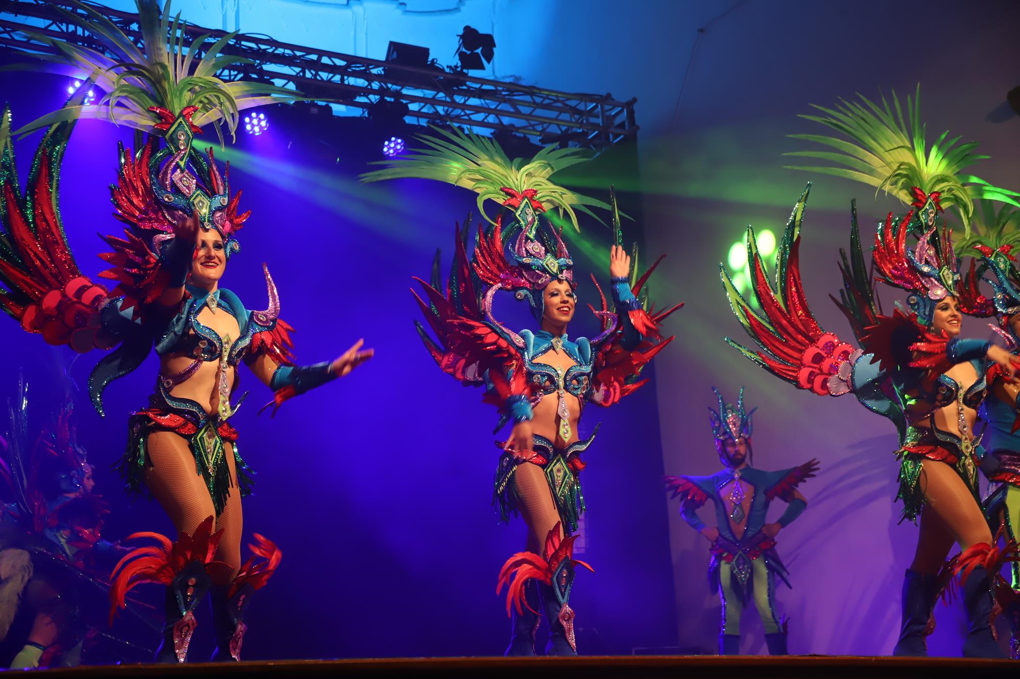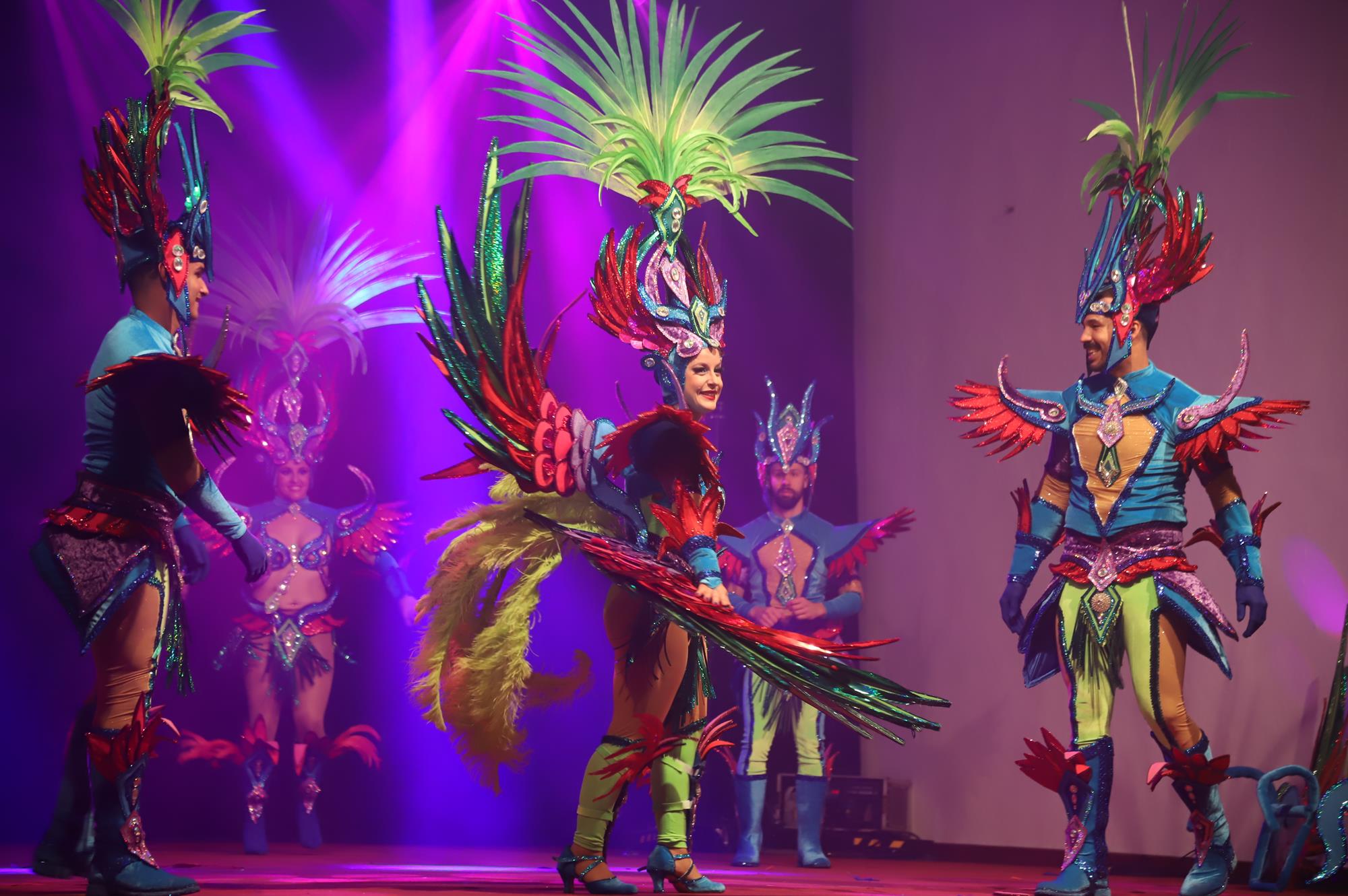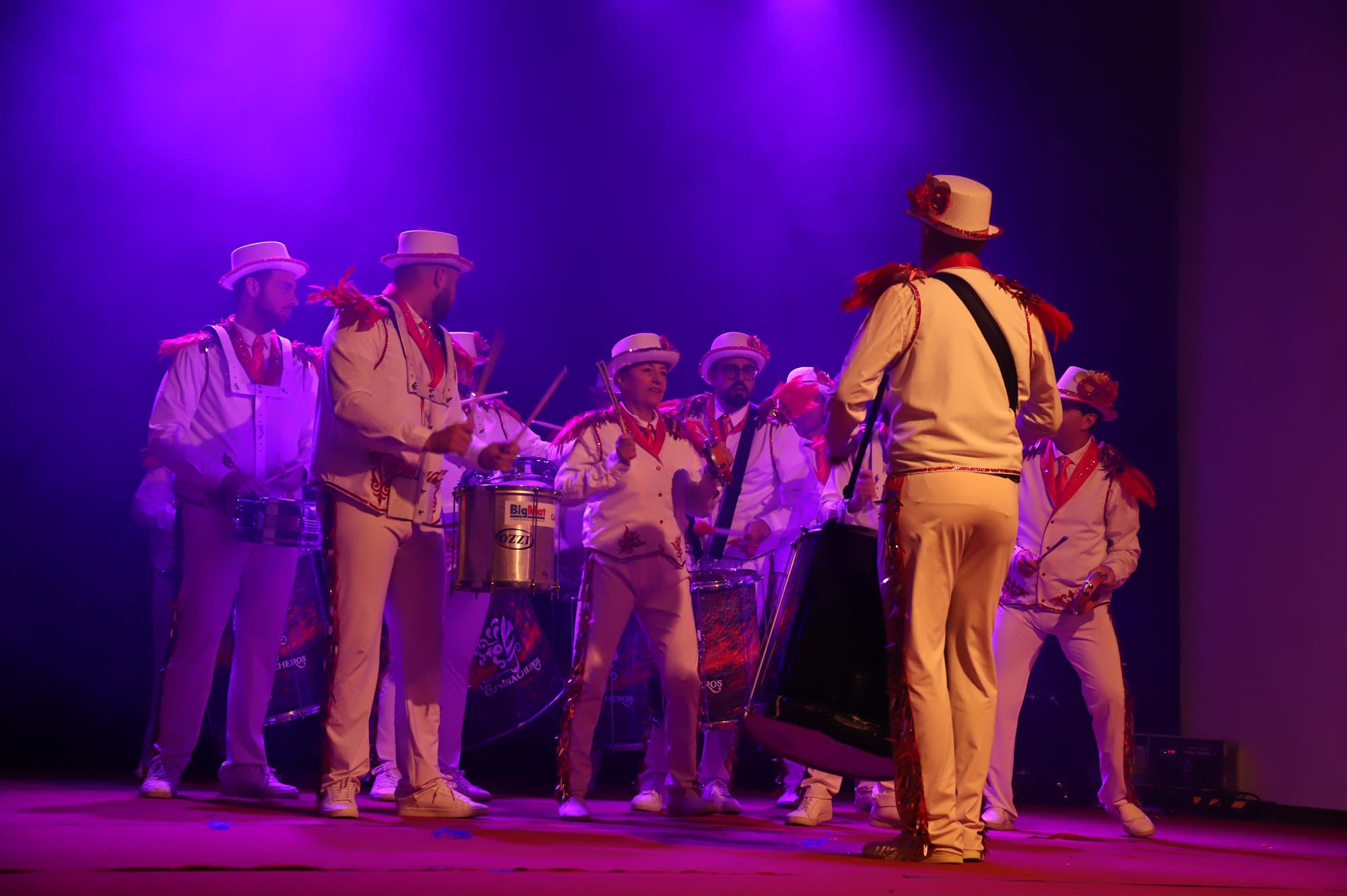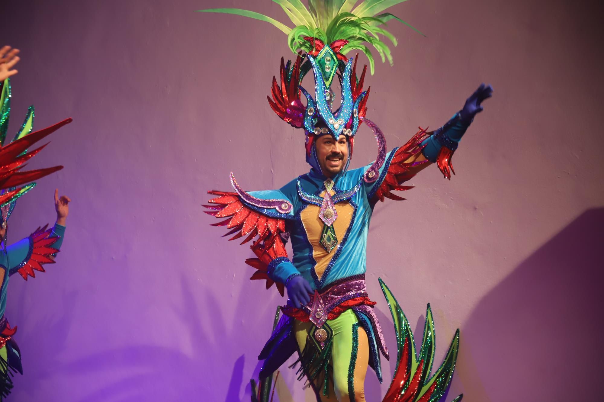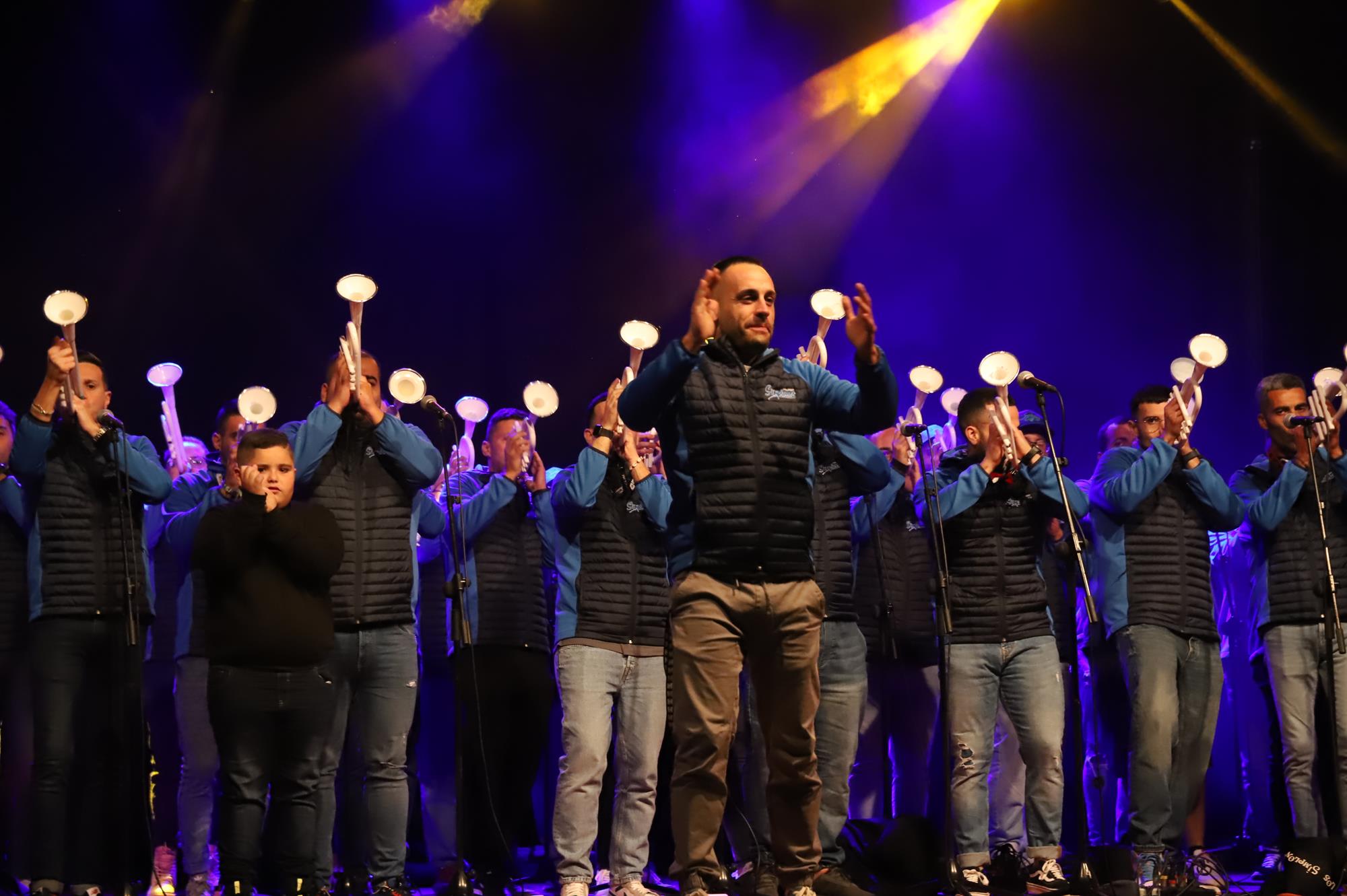 Y, finalmente llegó el momento más esperado de la noche, ver la puesta en escena de los anfitriones, La comparsa Los Cumbacheros fue fundada en el año 2012, por lo que ya son 12 años participando activamente en el Carnaval. Sergio Níz tiene la responsabilidad de presidir la misma recayendo también en él todas y cada una de las coreografías llevadas a cabo por los 64 componentes que este año forman parte de la comparsa. La dirección musical corre a cargo de un gran profesional y entendido en la materia, Gesury García, el diseñador es Borja Abreu que es el autor de la fantasía denominada Atrápame..