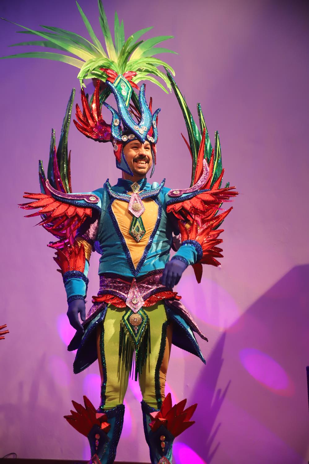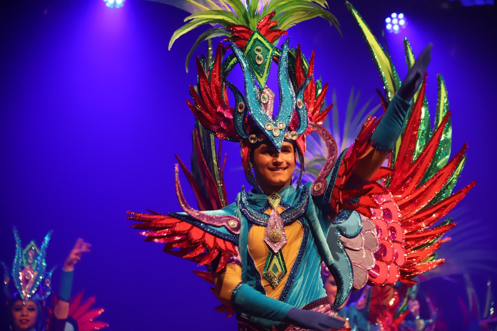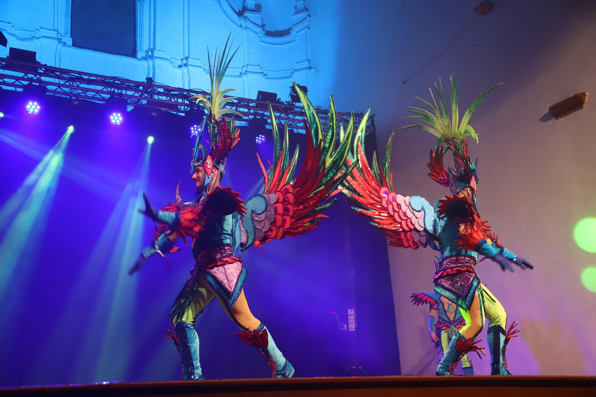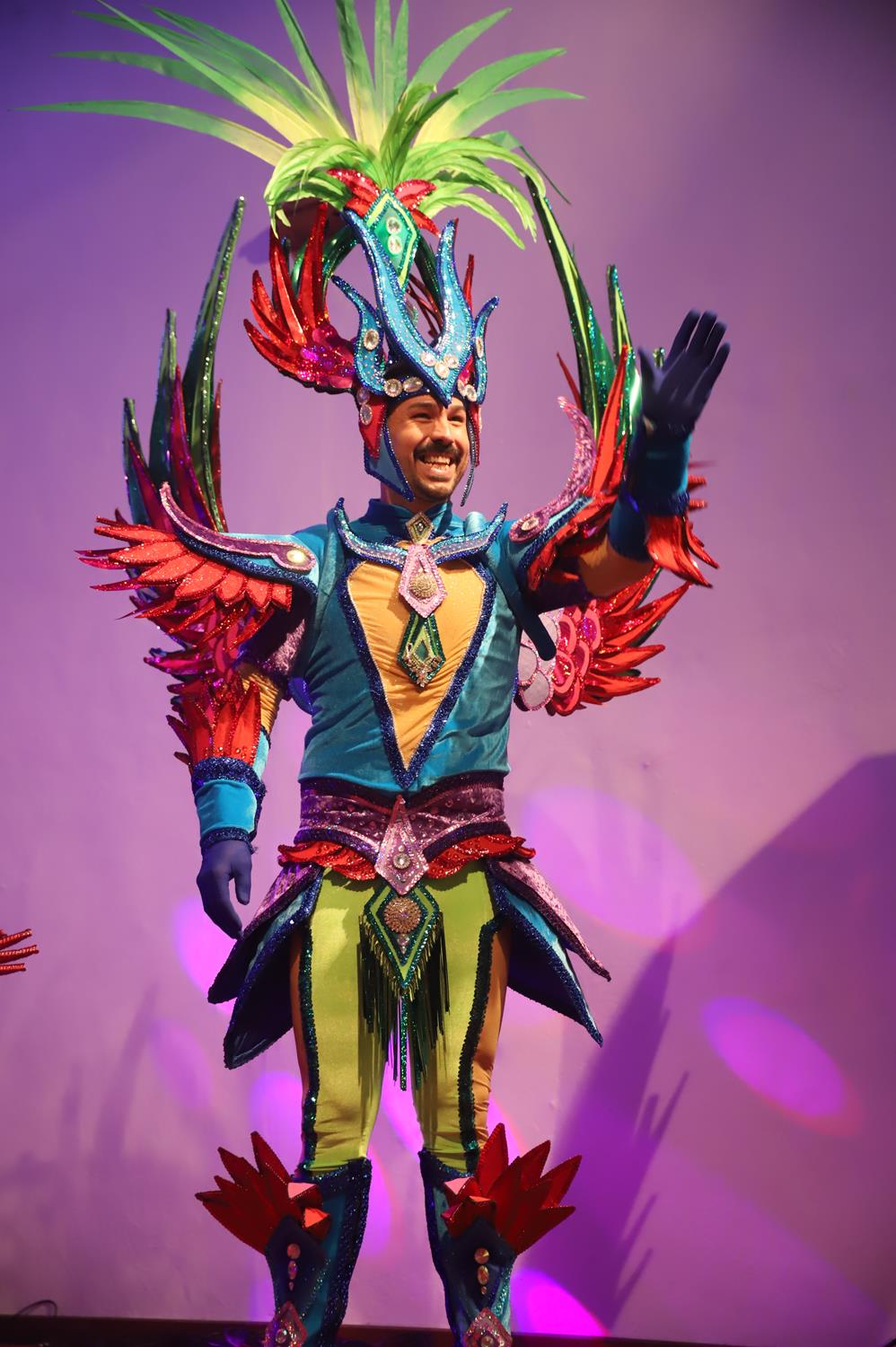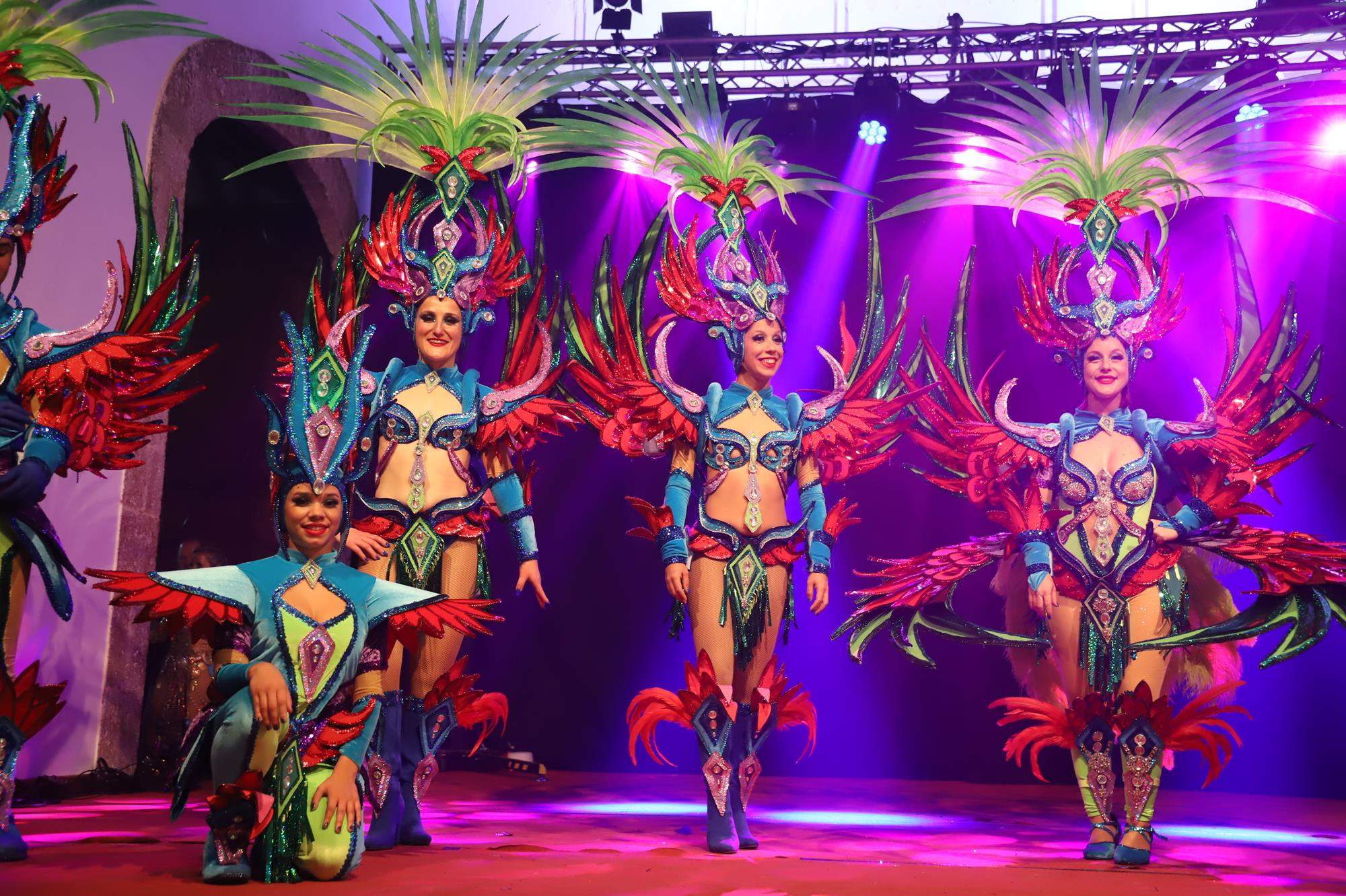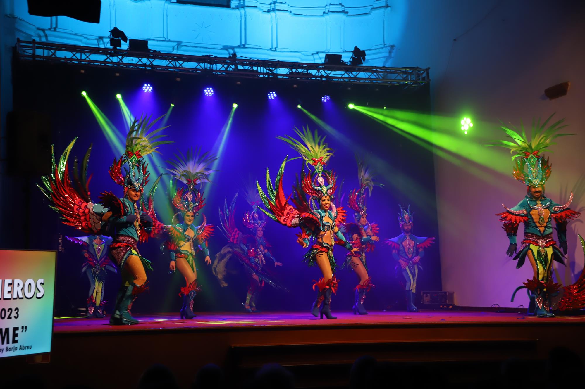 Y, finalmente llegó el momento más esperado de la noche, ver la puesta en escena de los anfitriones, La comparsa Los Cumbacheros fue fundada en el año 2012, por lo que ya son 12 años participando activamente en el Carnaval. Sergio Níz tiene la responsabilidad de presidir la misma recayendo también en él todas y cada una de las coreografías llevadas a cabo por los 64 componentes que este año forman parte de la comparsa. La dirección musical corre a cargo de un gran profesional y entendido en la materia, Gesury García, el diseñador es Borja Abreu que es el autor de la fantasía denominada Atrápame..