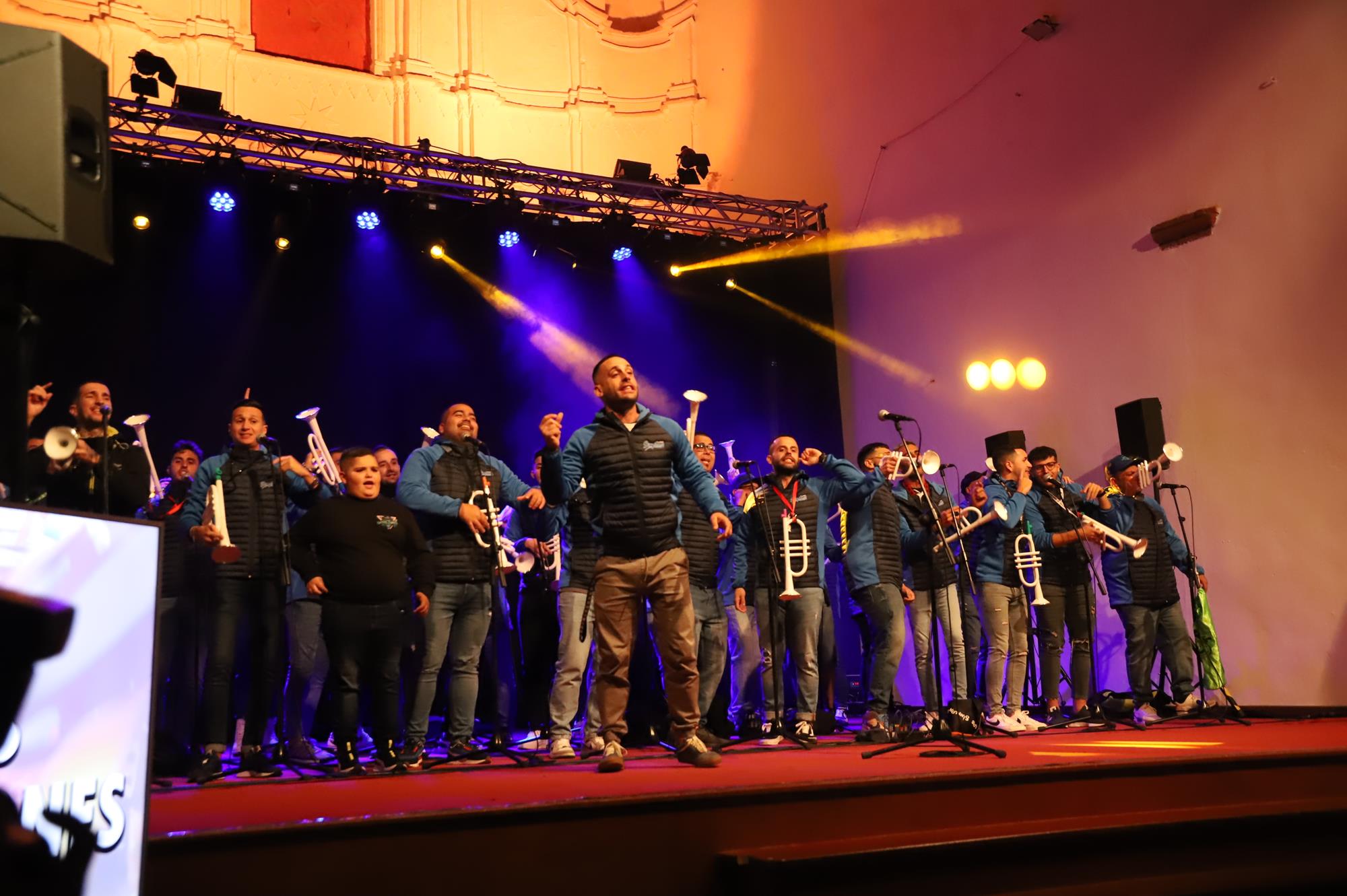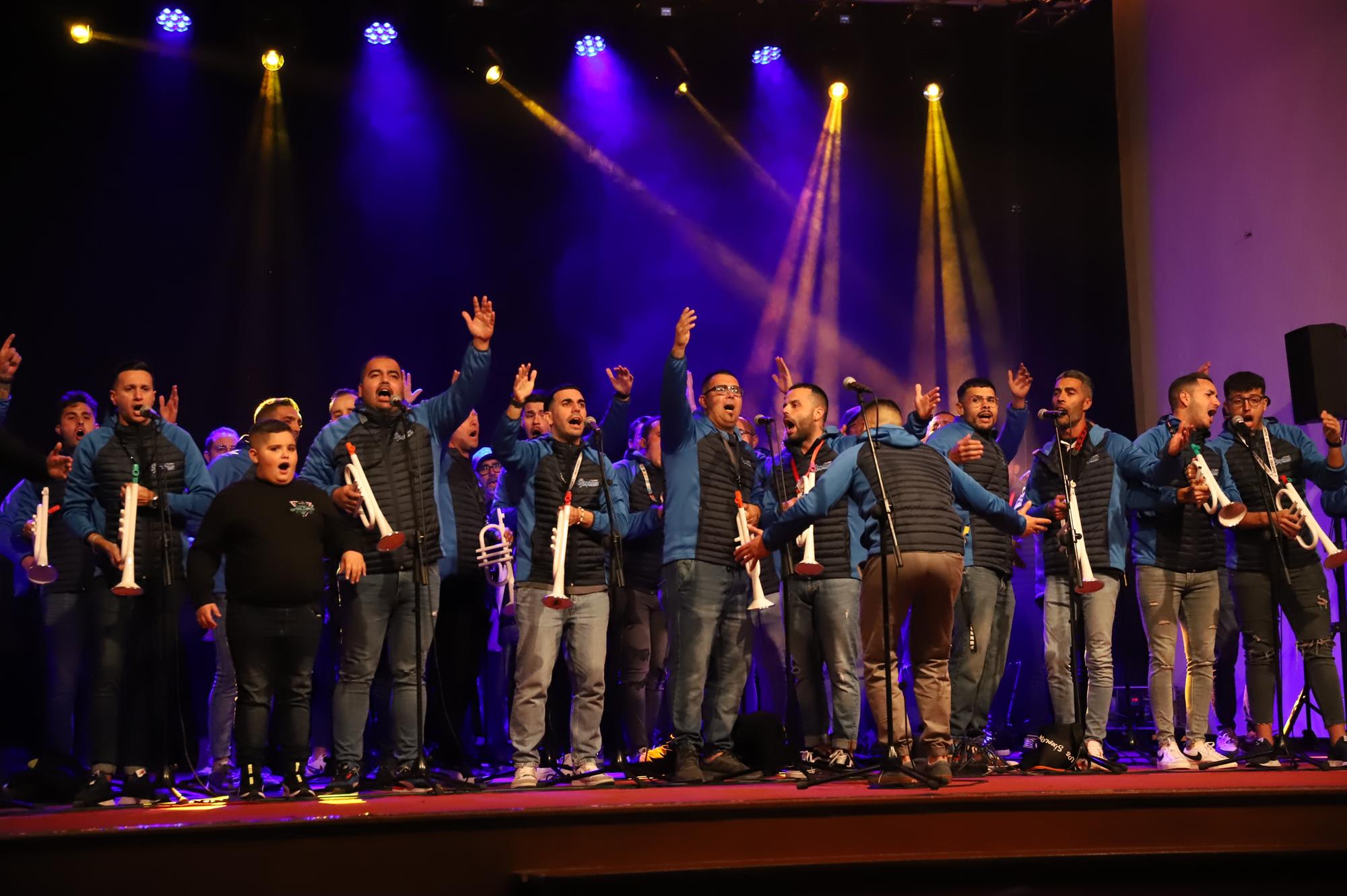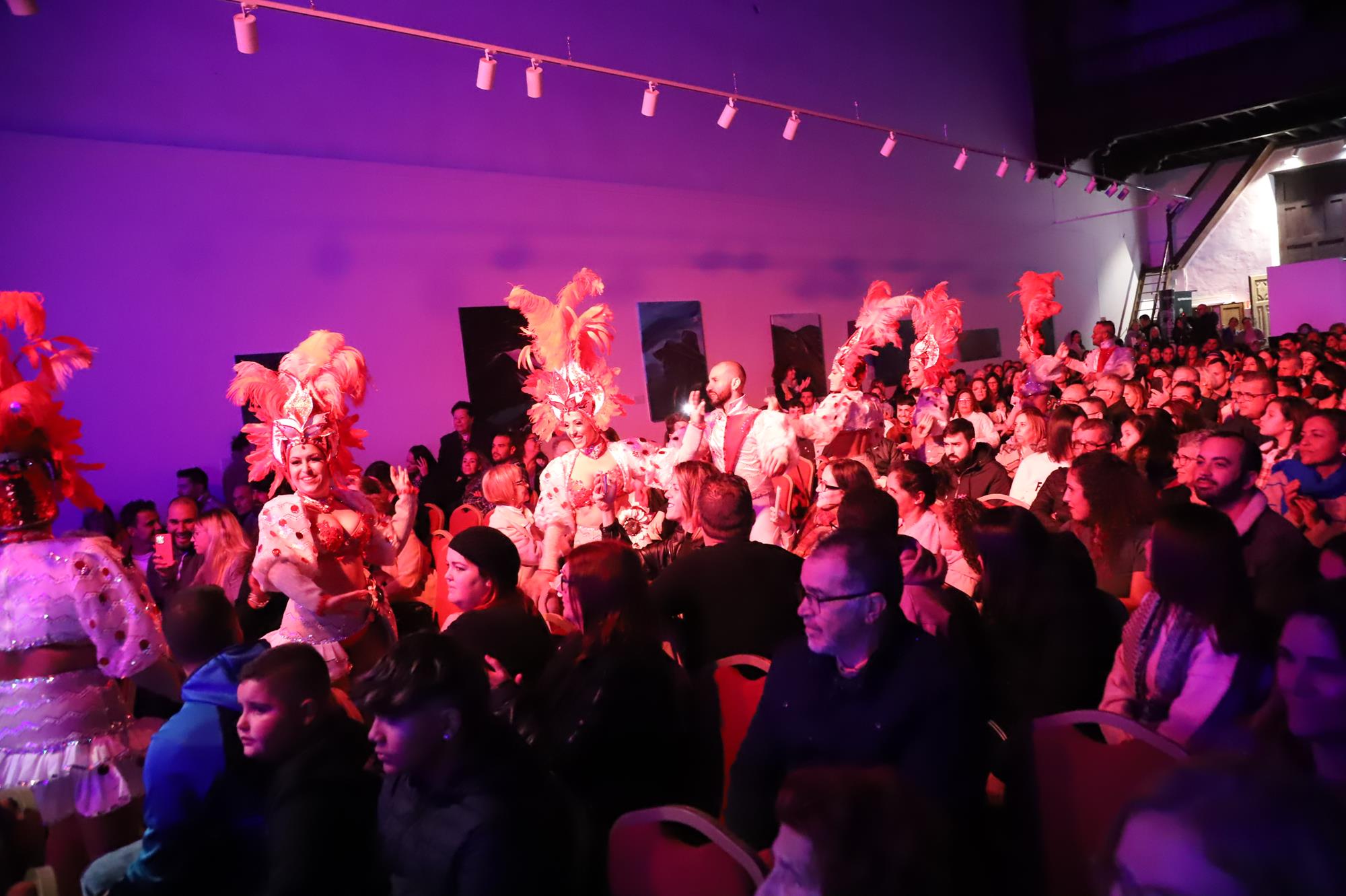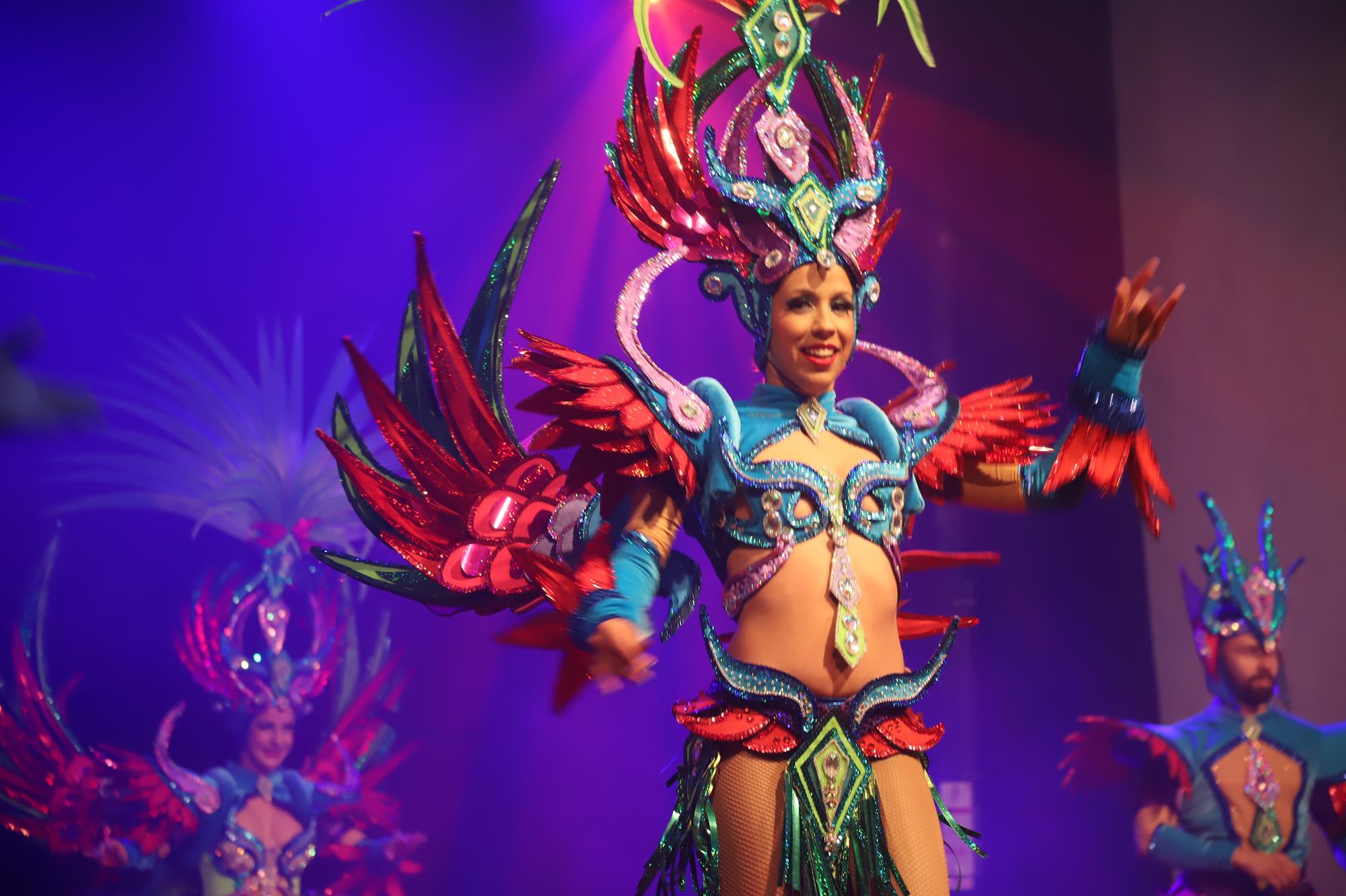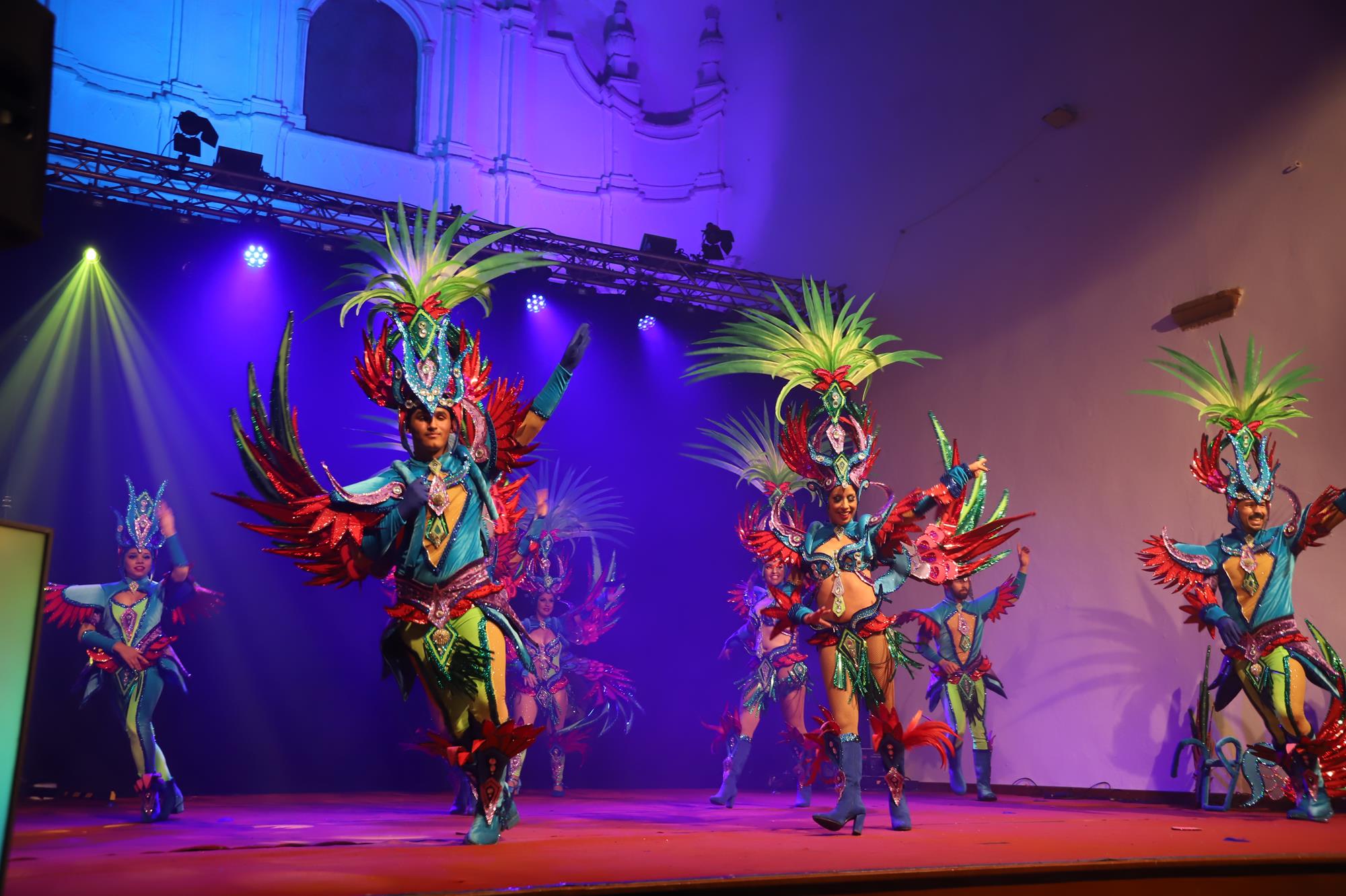 Y, finalmente llegó el momento más esperado de la noche, ver la puesta en escena de los anfitriones, La comparsa Los Cumbacheros fue fundada en el año 2012, por lo que ya son 12 años participando activamente en el Carnaval. Sergio Níz tiene la responsabilidad de presidir la misma recayendo también en él todas y cada una de las coreografías llevadas a cabo por los 64 componentes que este año forman parte de la comparsa. La dirección musical corre a cargo de un gran profesional y entendido en la materia, Gesury García, el diseñador es Borja Abreu que es el autor de la fantasía denominada Atrápame..