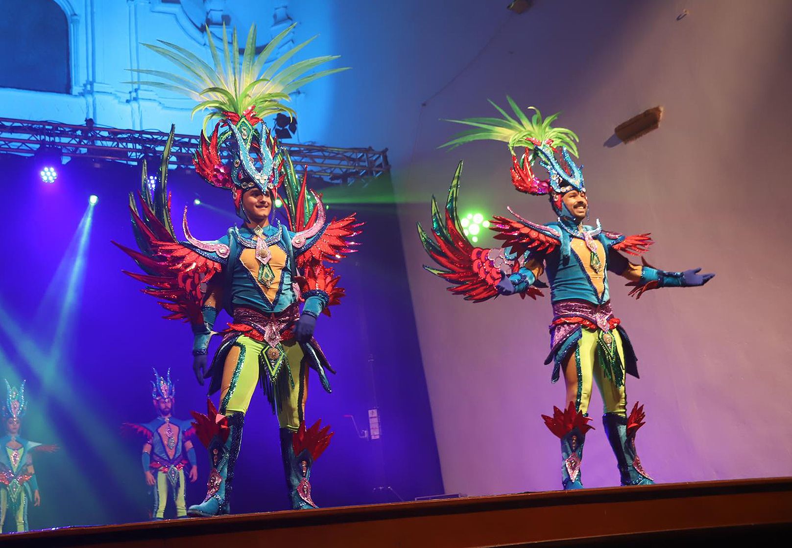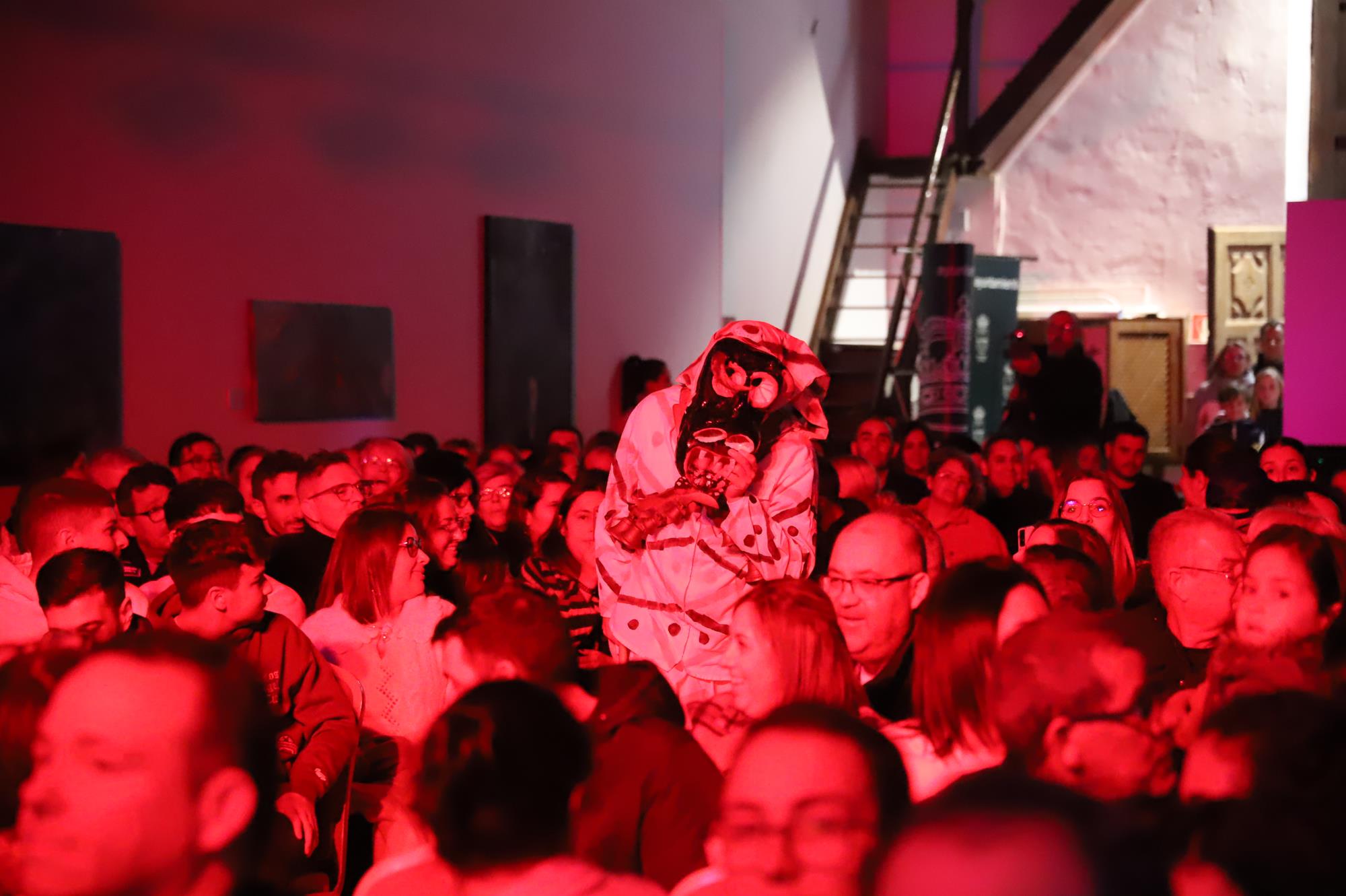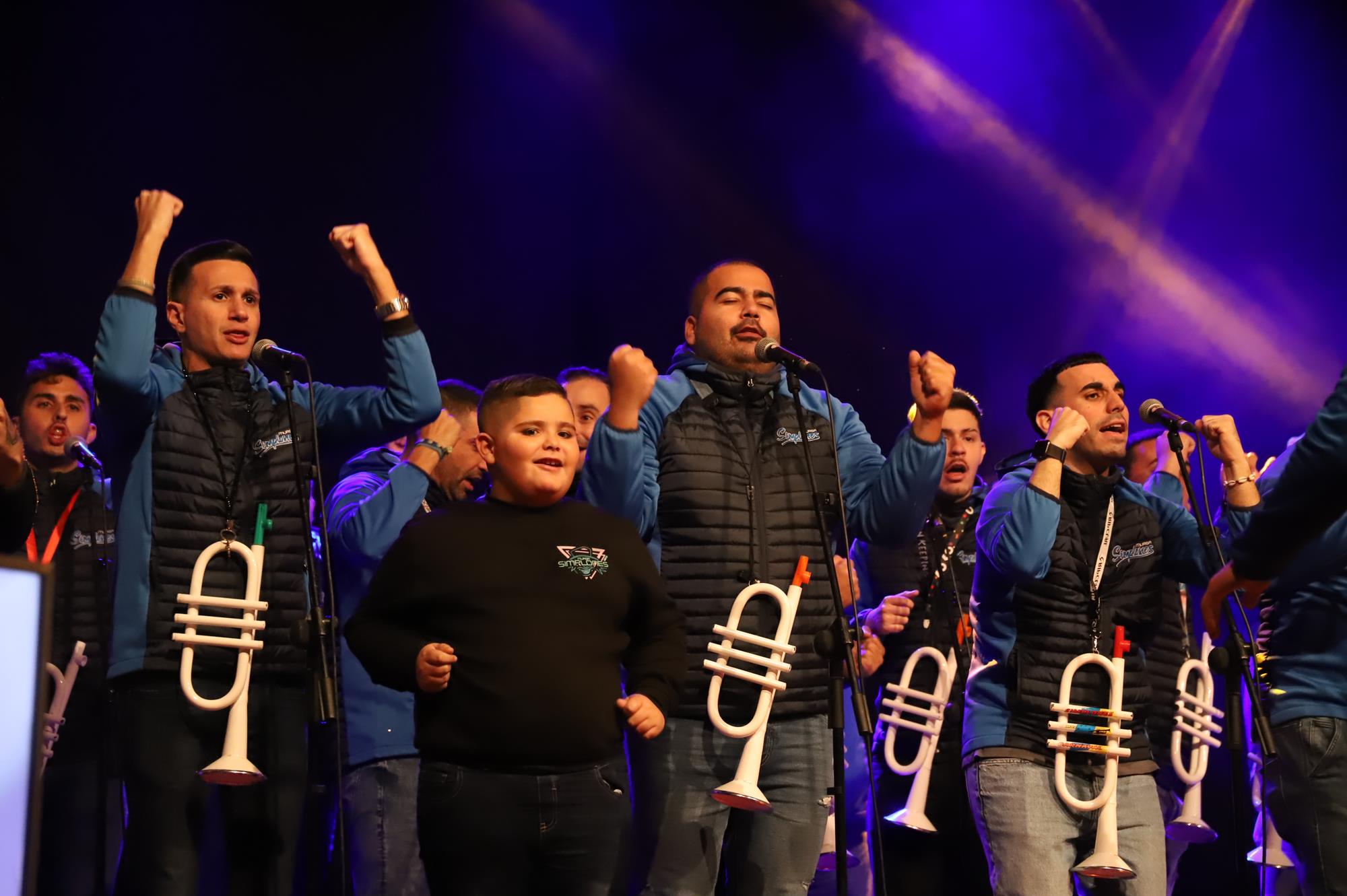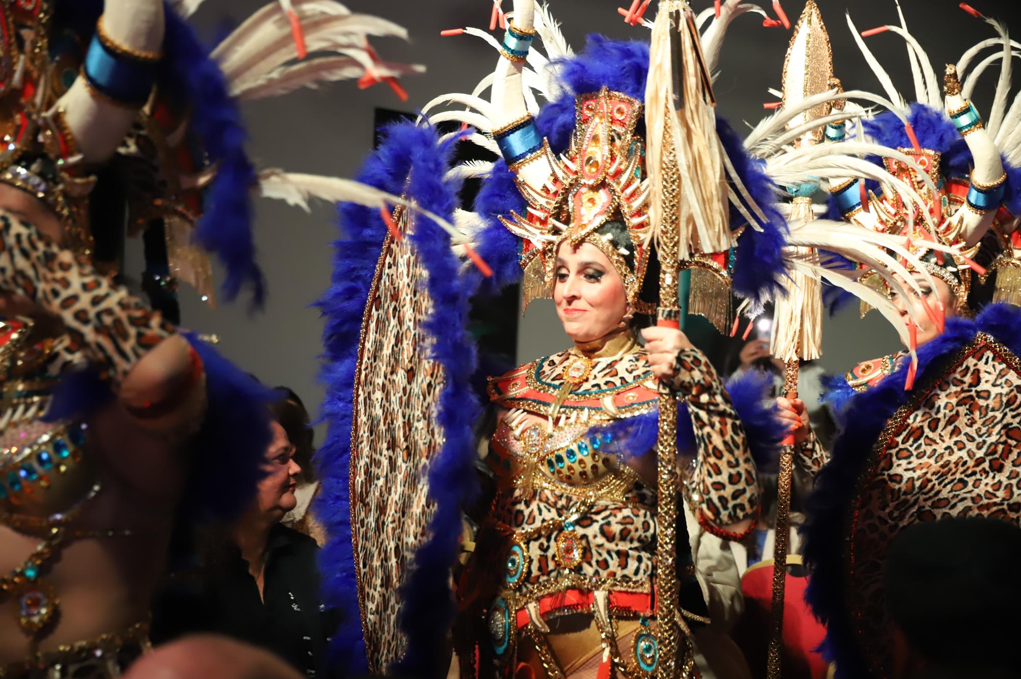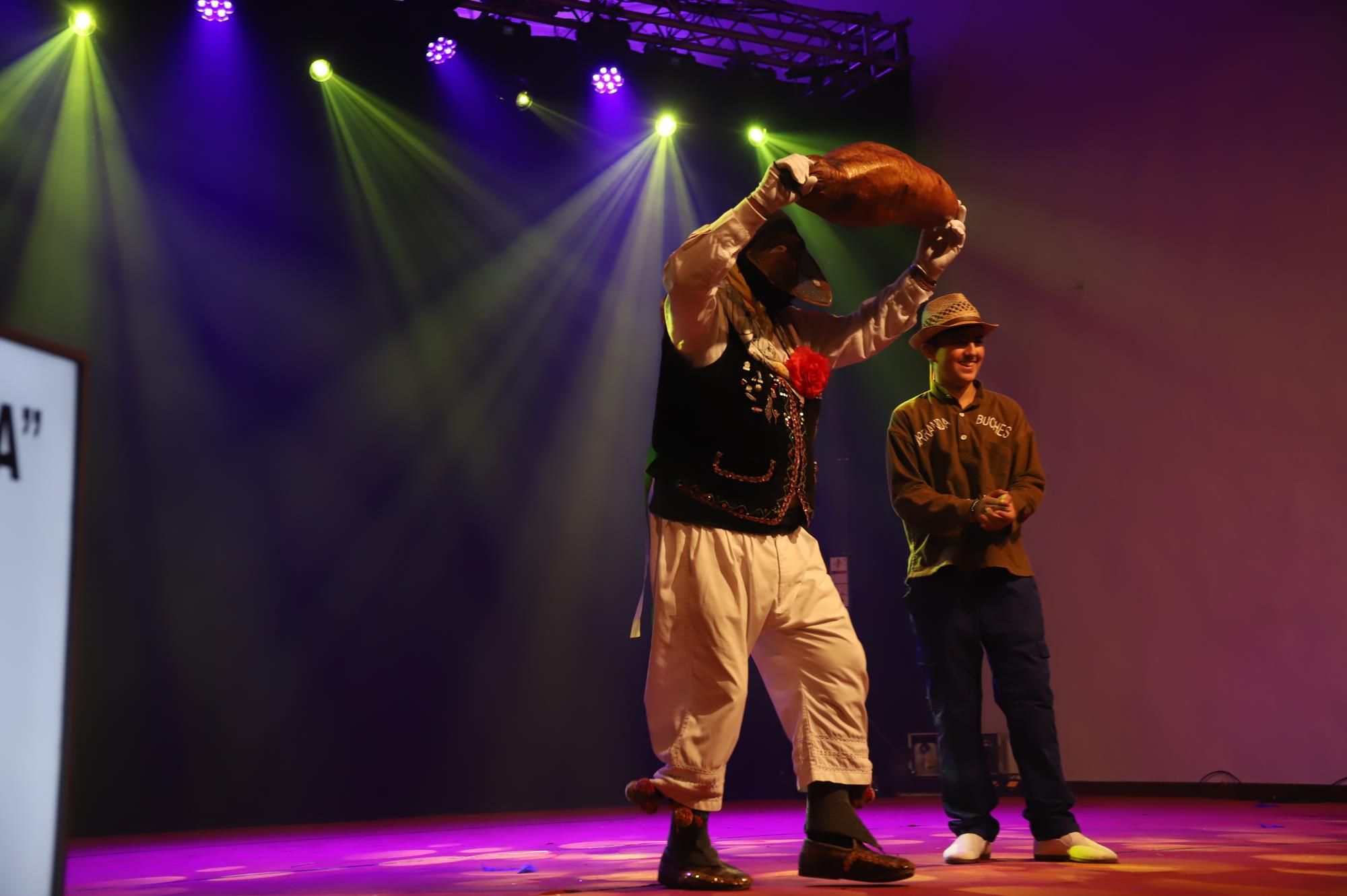 Y, finalmente llegó el momento más esperado de la noche, ver la puesta en escena de los anfitriones, La comparsa Los Cumbacheros fue fundada en el año 2012, por lo que ya son 12 años participando activamente en el Carnaval. Sergio Níz tiene la responsabilidad de presidir la misma recayendo también en él todas y cada una de las coreografías llevadas a cabo por los 64 componentes que este año forman parte de la comparsa. La dirección musical corre a cargo de un gran profesional y entendido en la materia, Gesury García, el diseñador es Borja Abreu que es el autor de la fantasía denominada Atrápame..