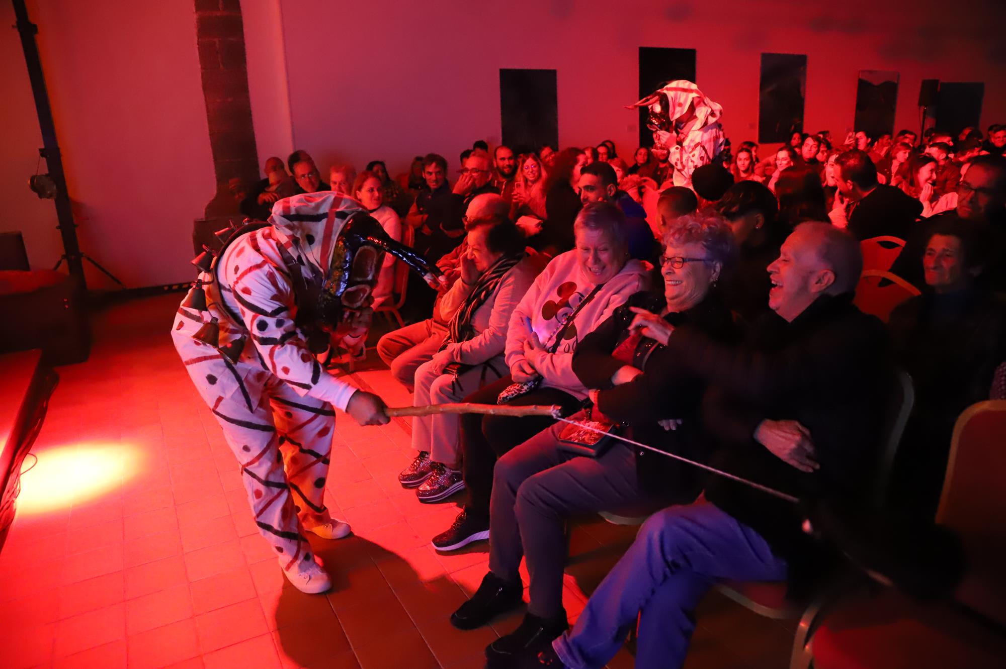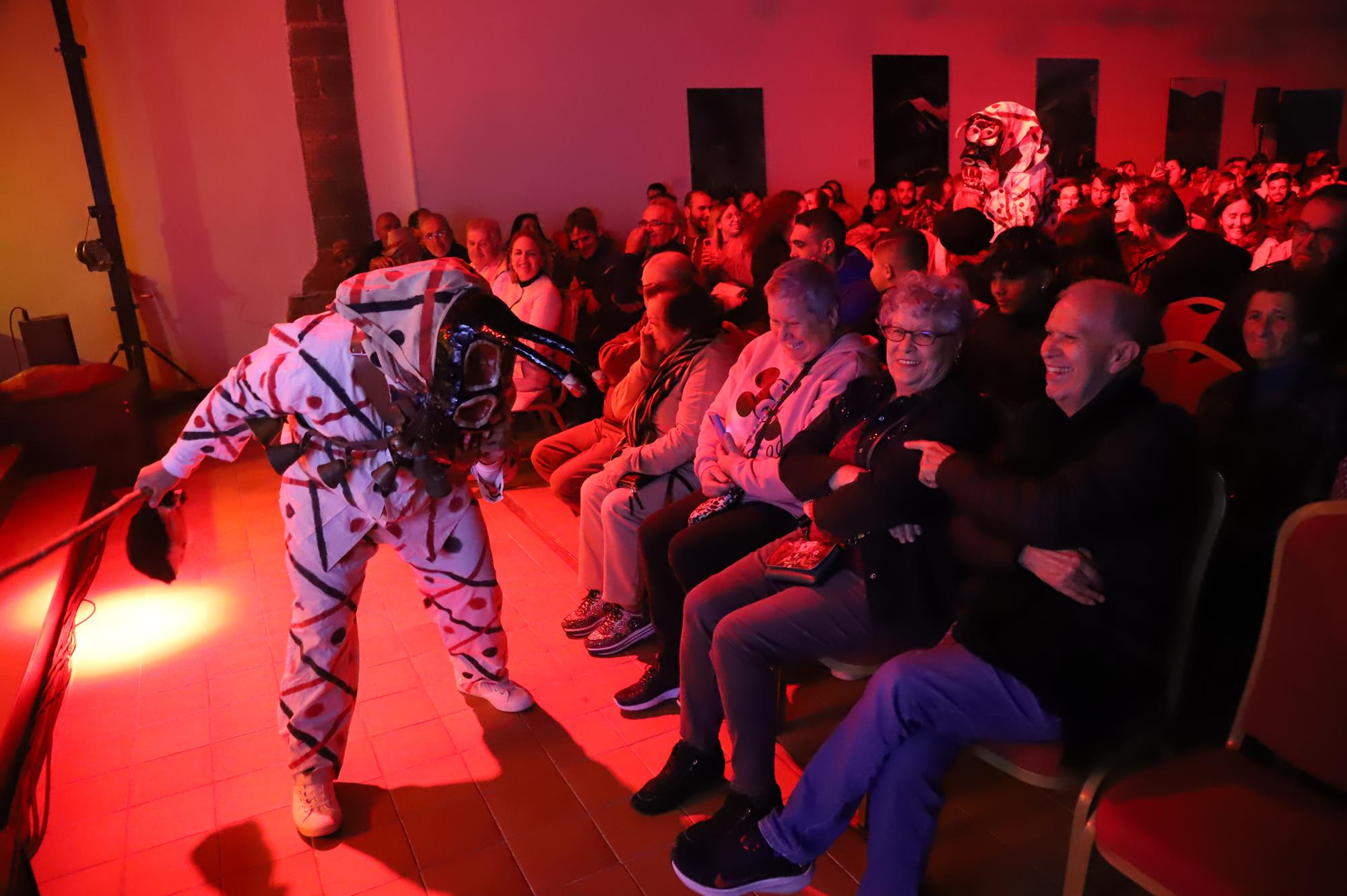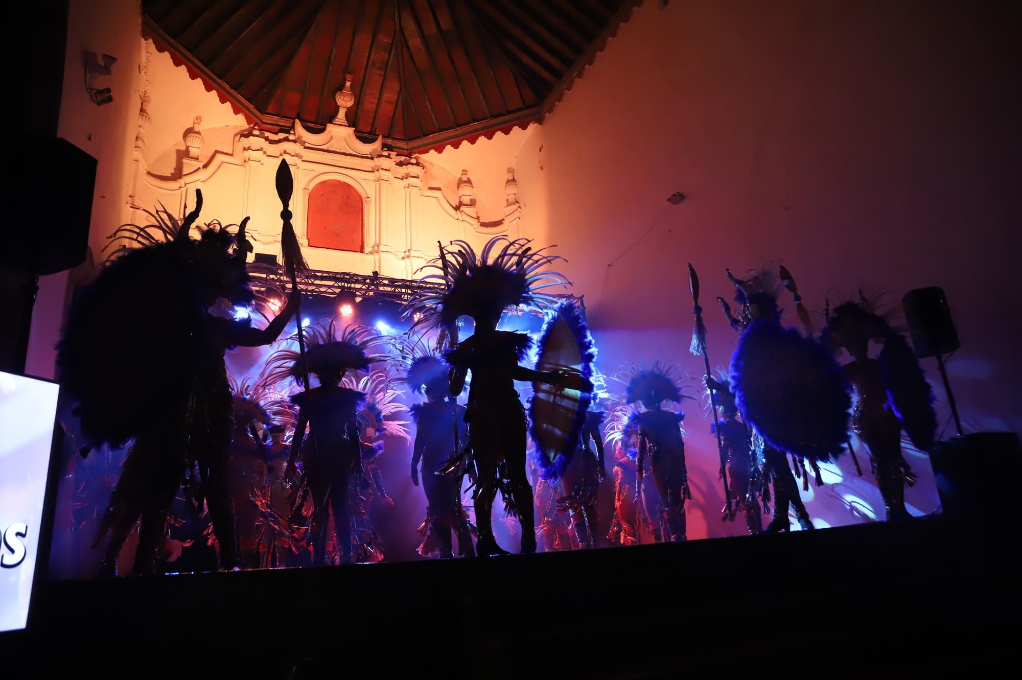 Los primeros en actuar fueron los 45 componentes de la murga Los Simplones, dirigidos por Enrique Martín, que pusieron mucho ritmo y desenfado interpretando su animado pasacalle y despedida. A continuación se escucharon las cencerros y esquilas al grito de ¡Elegua! una representación de Los Diabletes de Teguise con su vestimenta blanca pintada con rombos de colores rojos y negros y la impresionante careta rematada con unos cuernos. Esta ancestral tradición es la más antigua de Canarias por lo que no podía faltar en una noche tan especial.