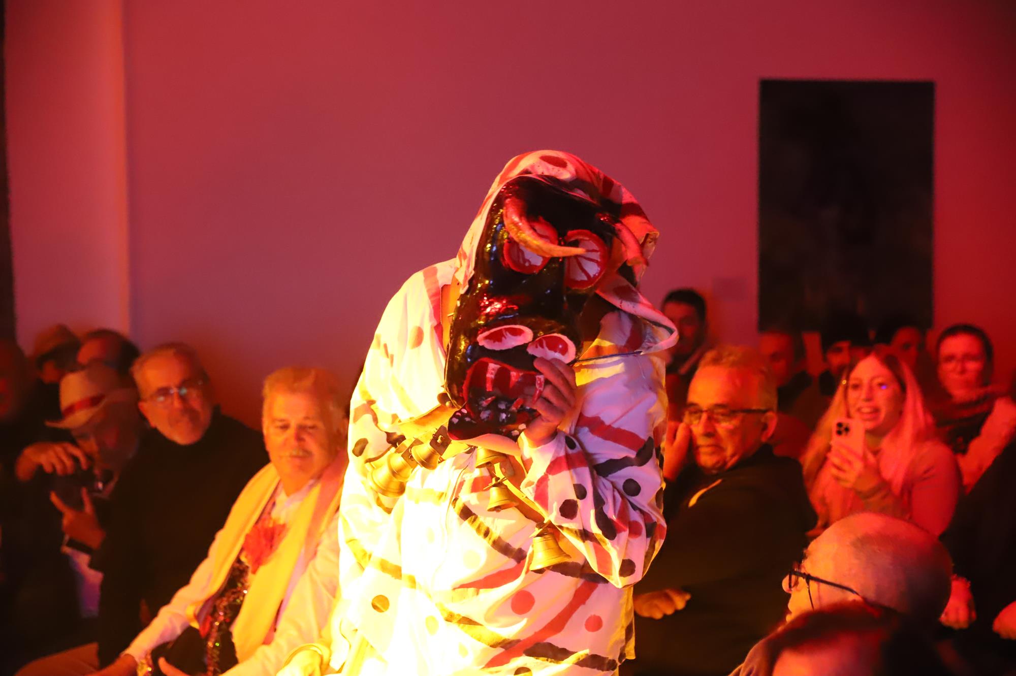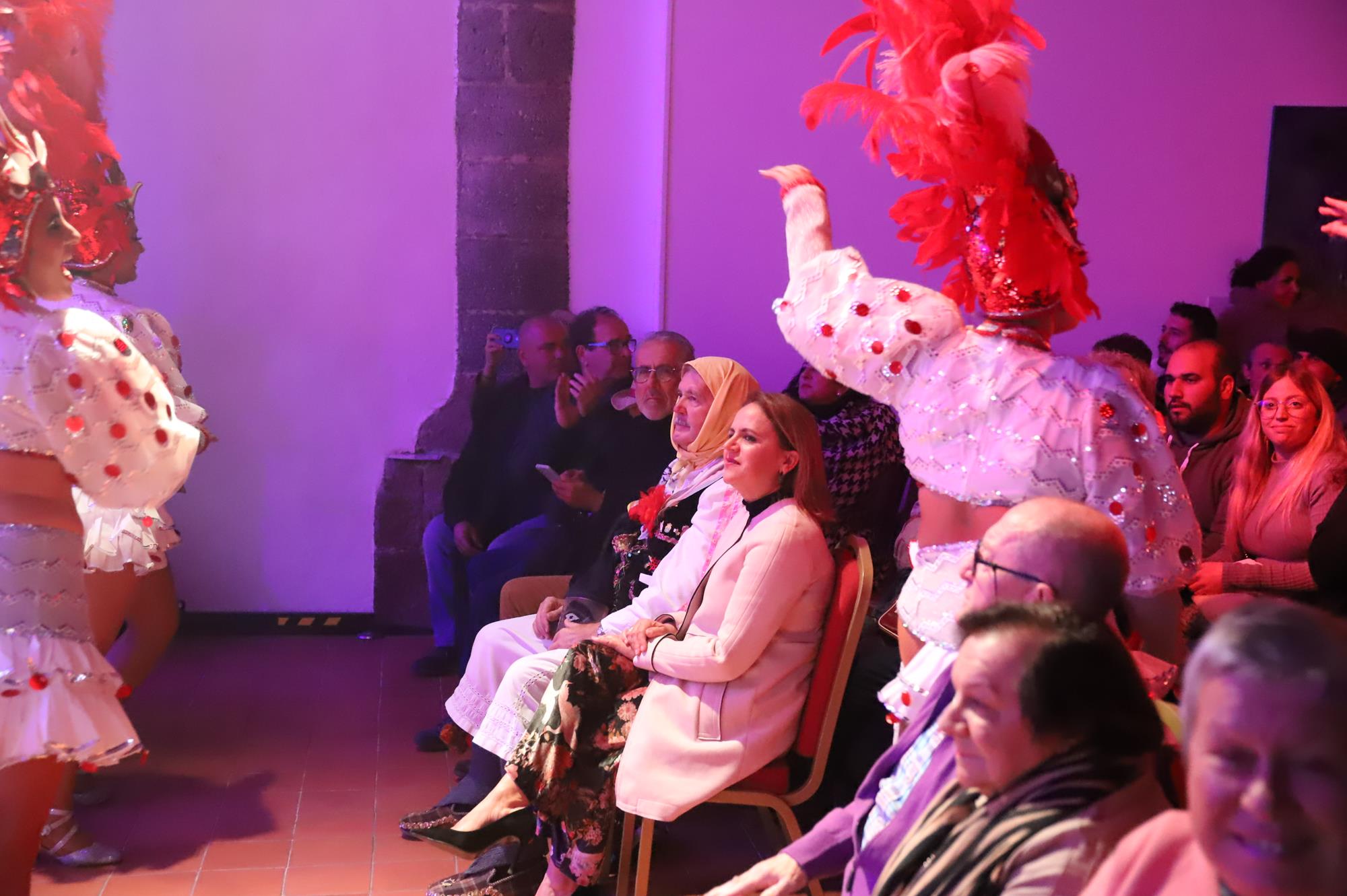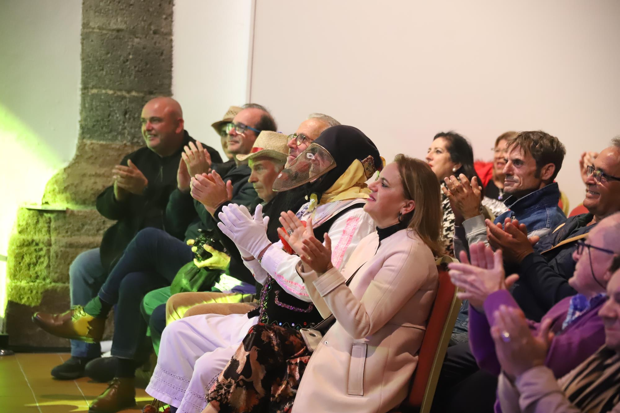 Los primeros en actuar fueron los 45 componentes de la murga Los Simplones, dirigidos por Enrique Martín, que pusieron mucho ritmo y desenfado interpretando su animado pasacalle y despedida. A continuación se escucharon las cencerros y esquilas al grito de ¡Elegua! una representación de Los Diabletes de Teguise con su vestimenta blanca pintada con rombos de colores rojos y negros y la impresionante careta rematada con unos cuernos. Esta ancestral tradición es la más antigua de Canarias por lo que no podía faltar en una noche tan especial.