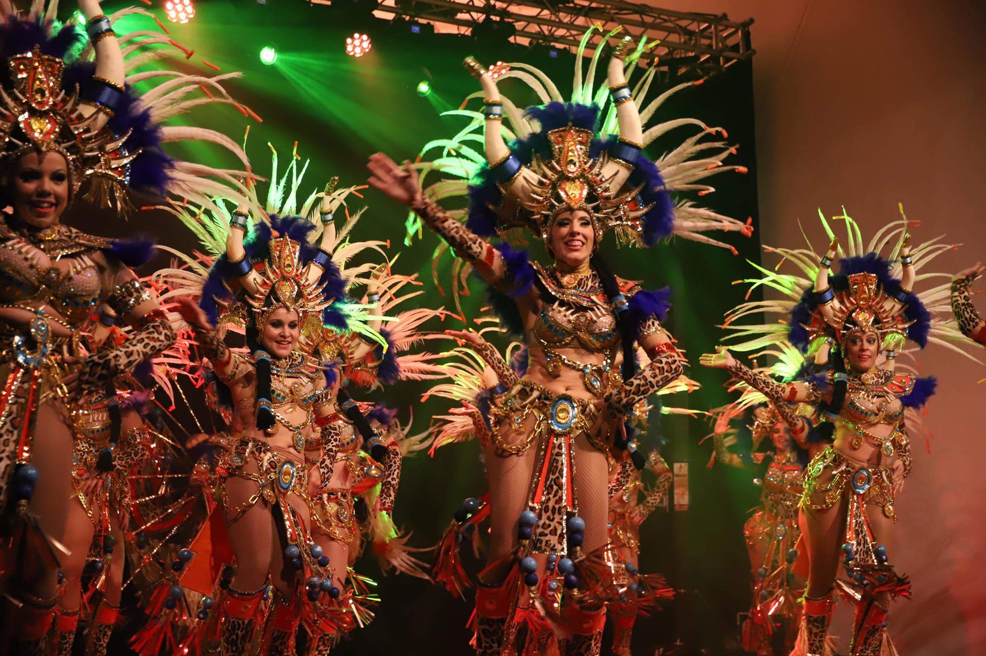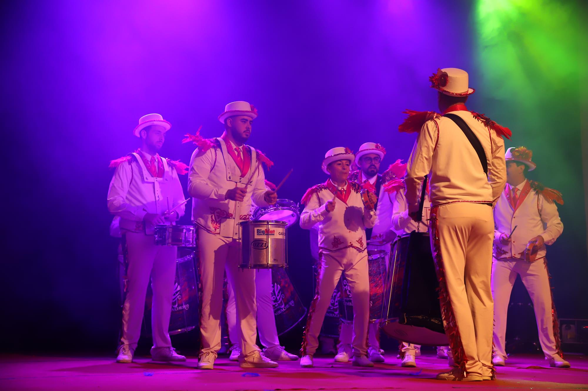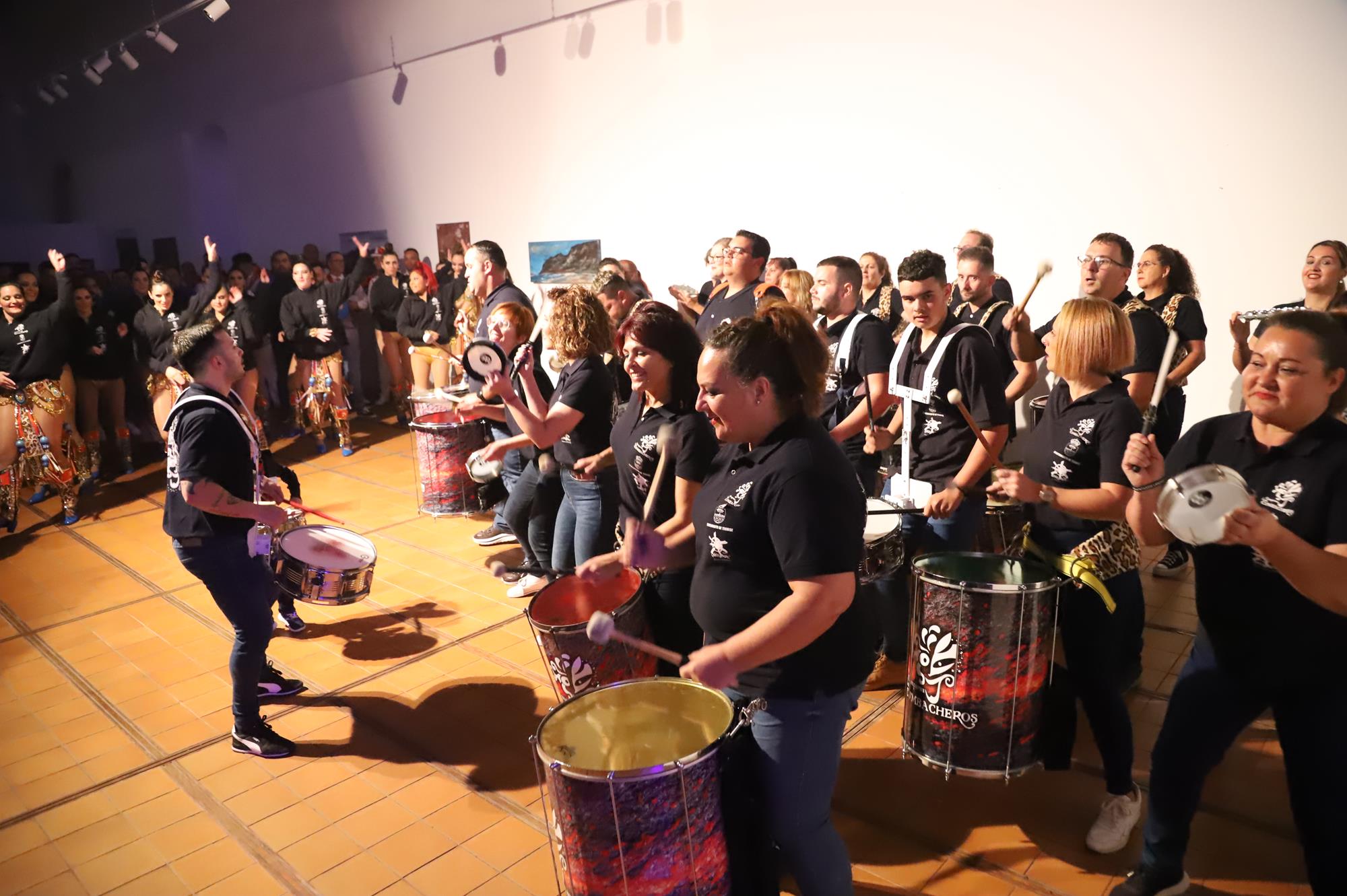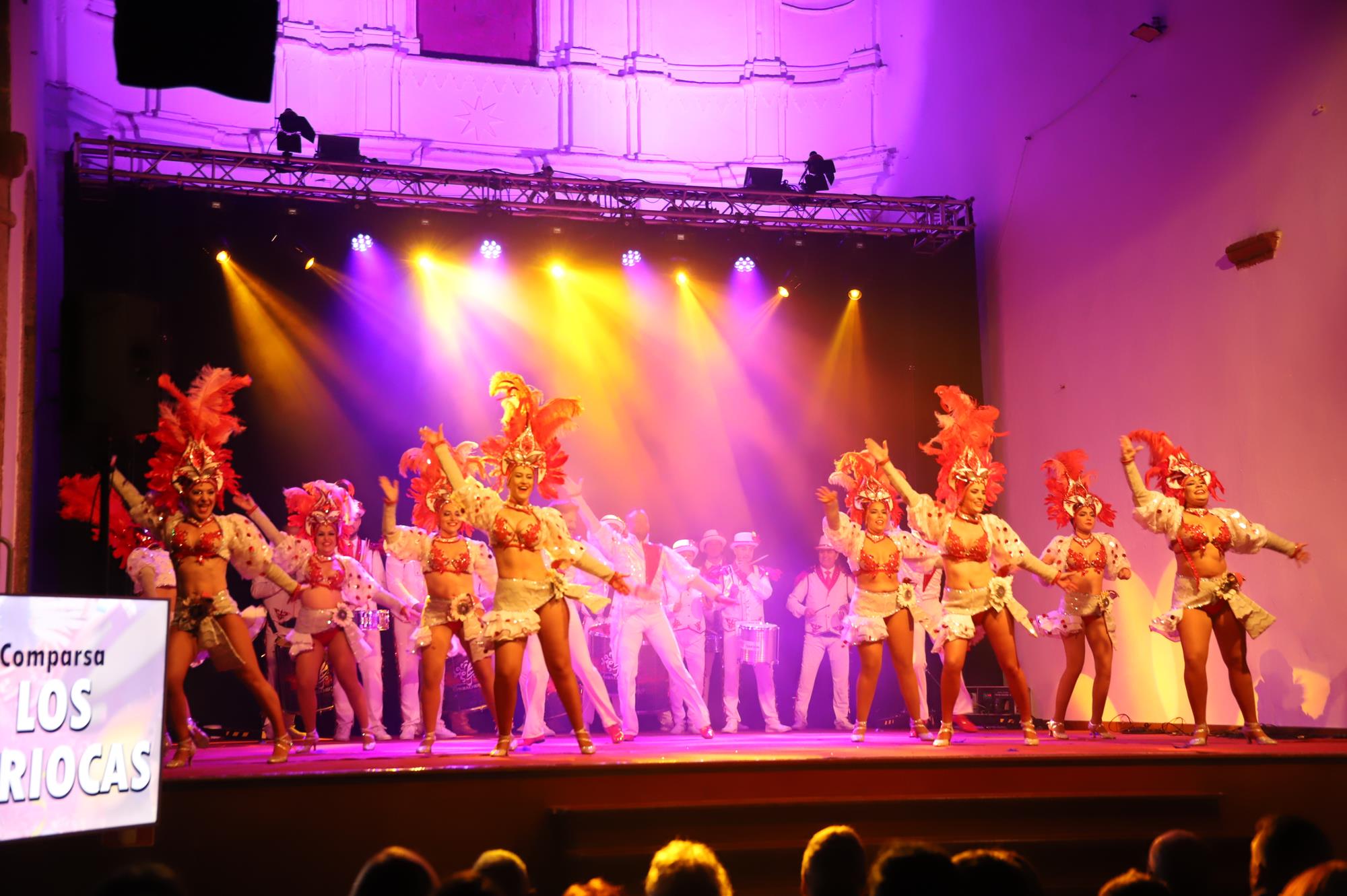Acto seguido hicieron su entrada por el pasillo central a ritmo de batucada una representación de la comparsa Los Cumbacheros de Tahíche que llenaron con su colorido y ritmo todo el espacio habilitado en el escenario con sus impresionantes coreografías, luciendo la fantasía del pasado año El Tesoro de Saba. Así se dio paso a los representantes de la comparsa invitada llegada desde la localidad de Valleseco en Santa Cruz de Tenerife Los Cariocas.
