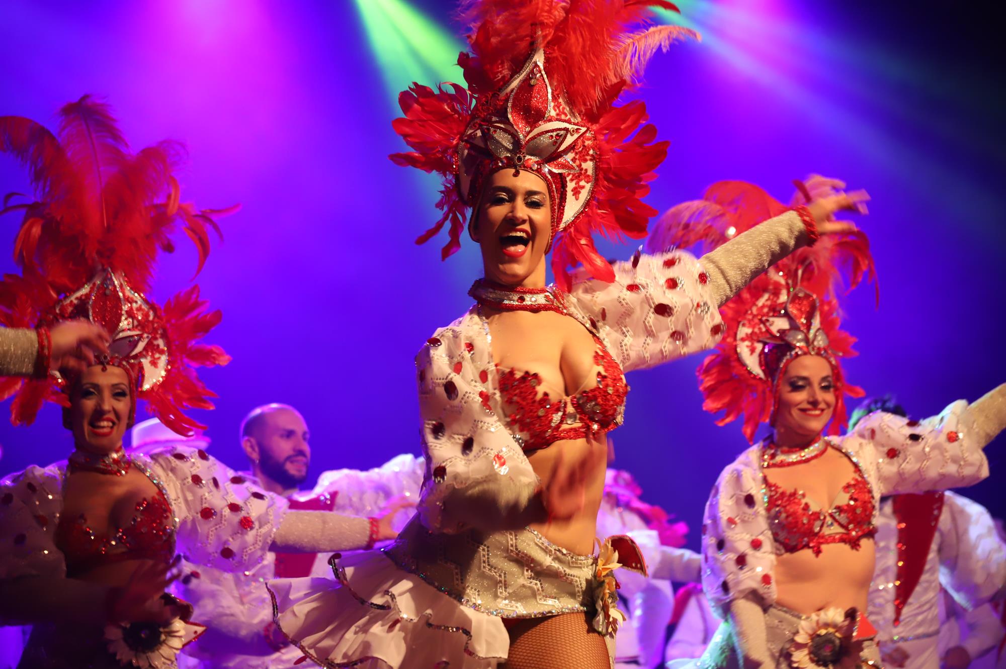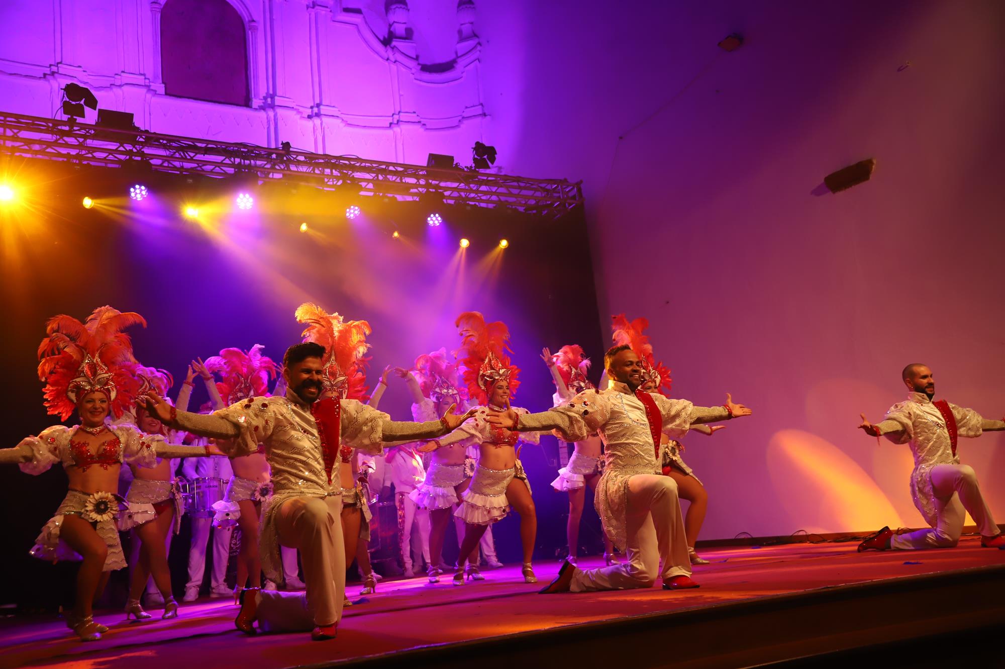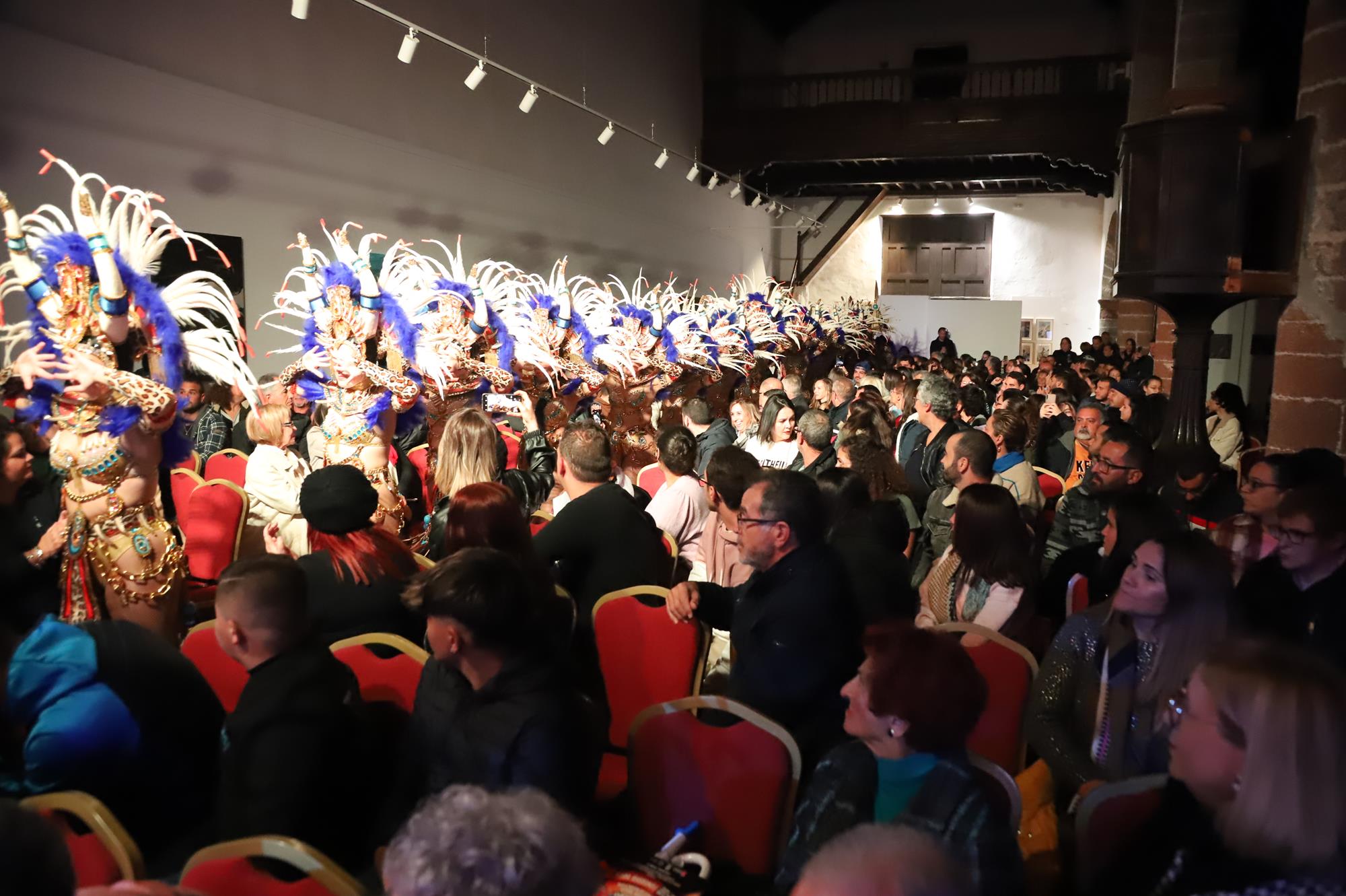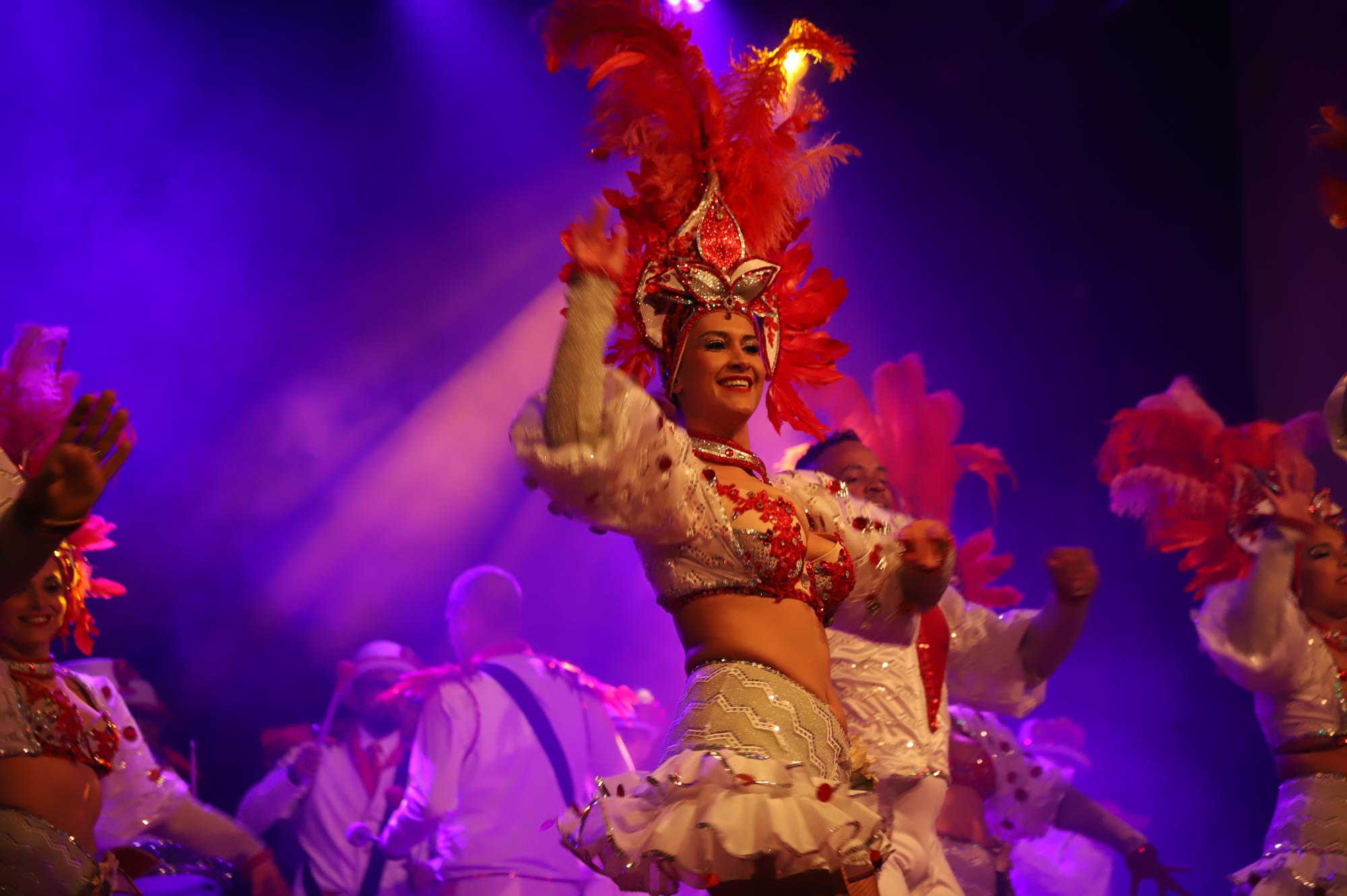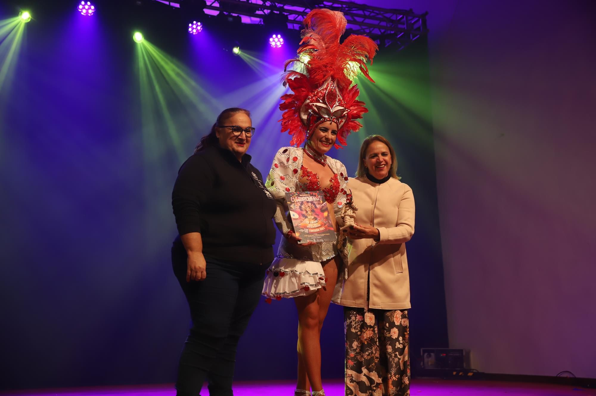 Acto seguido hicieron su entrada por el pasillo central a ritmo de batucada una representación de la comparsa Los Cumbacheros de Tahíche que llenaron con su colorido y ritmo todo el espacio habilitado en el escenario con sus impresionantes coreografías, luciendo la fantasía del pasado año El Tesoro de Saba. Así se dio paso a los representantes de la comparsa invitada llegada desde la localidad de Valleseco en Santa Cruz de Tenerife Los Cariocas.