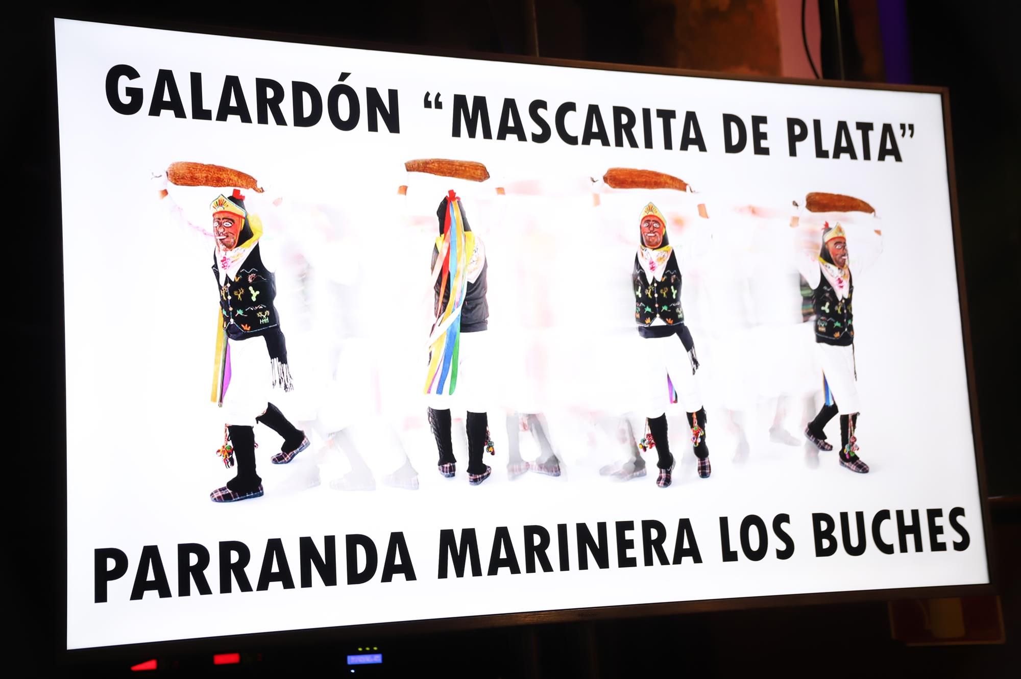 Después de la actuación de Los Cariocas, se llevó a cabo la entrega de la Mascarita de Plata, distinción que este año se le entregó a la Parranda Marinera Los Buches con motivo de su 60 aniversario. Los Buches representan una tradición del ser y del sentir del pueblo marinero de Lanzarote, es la máxima expresión del carnaval popular de Canarias y el testimonio más vivo de los vínculos de los hombres y mujeres de Arrecife con el mar.