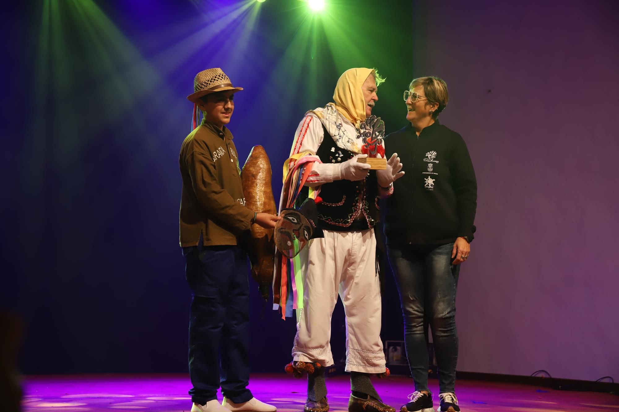 Paola San Ginés, una componente de Los Cumbacheros, le hizo entrega a José Julián, presidente de Los Buches, de una escultura y Nori Machín, concejala de Cultura del Ayuntamiento de Teguise, le hizo entrega de la escultura del Diablete.