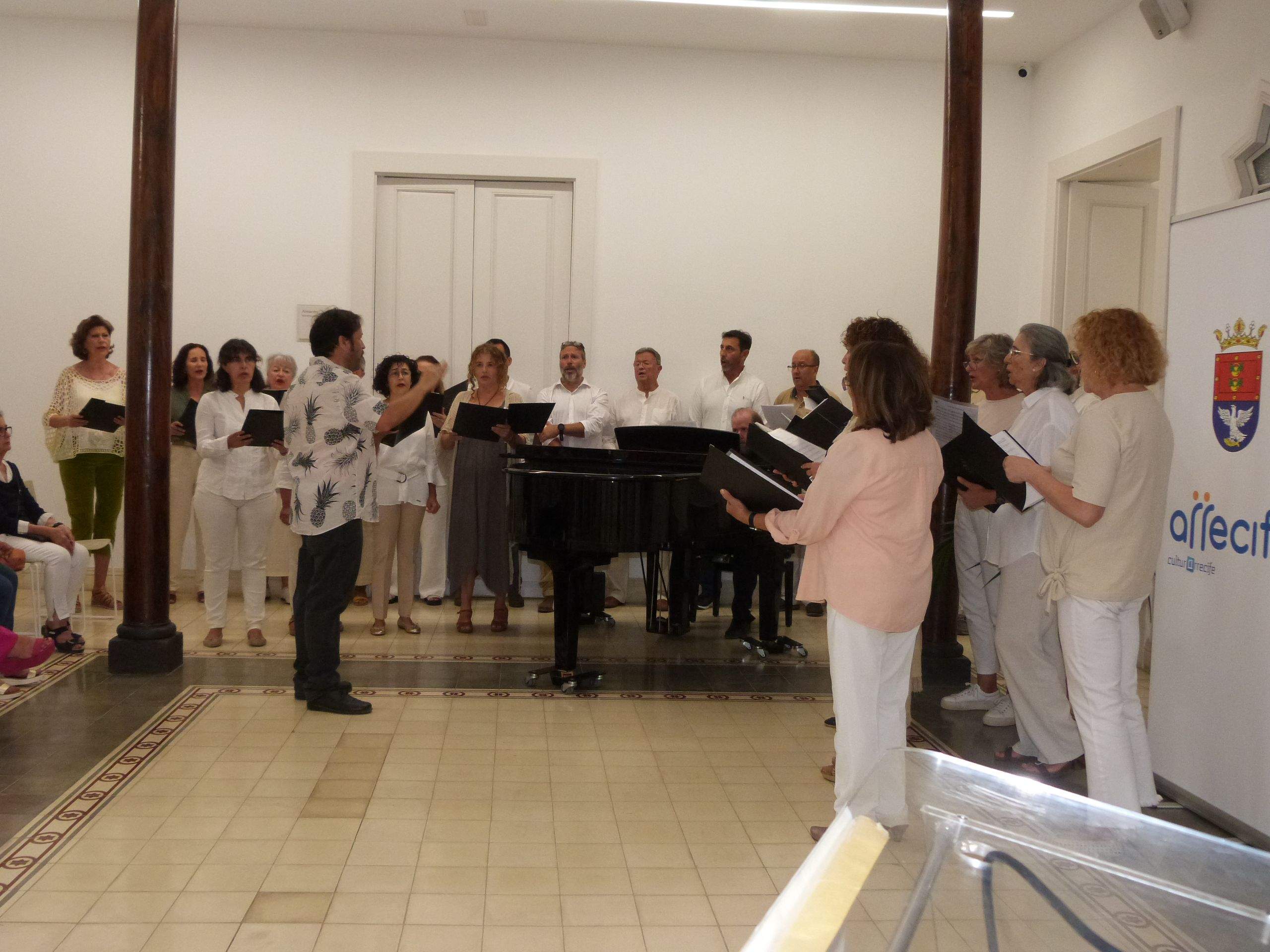 El acto comenzó con las palabras de bienvenida de la concejala en funciones del Ayuntamiento de Arrecife, Cristina Calero y del presidente de la Coral San Ginés, Antonio Martín. A continuación los coristas dirigidos por el profesor, José Antonio Elías Roldán y acompañados al piano por el profesor, Javier Díaz, interpretaron la composición de George Frideric Händel "Canticorum Iubilo", finalizando con la composición de Chris Martín "Viva la Vida". Dos intervenciones que fueron muy aplaudidas por el público presente. A continuación, la concejala y el presidente se encargaron de abrir las puertas de las dos salas donde están expuestas algunas de las fotos y obsequios que han marcado los momentos que los coristas han compartido durante estos 50 años. Un momento muy entrañable y nostálgico para algunos cuando iban visualizando las fotos y venían a su mente momentos dormidos en el tiempo.
