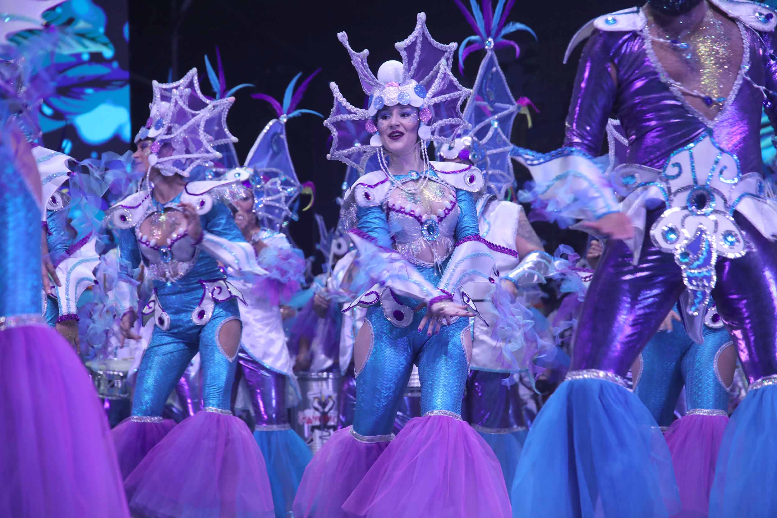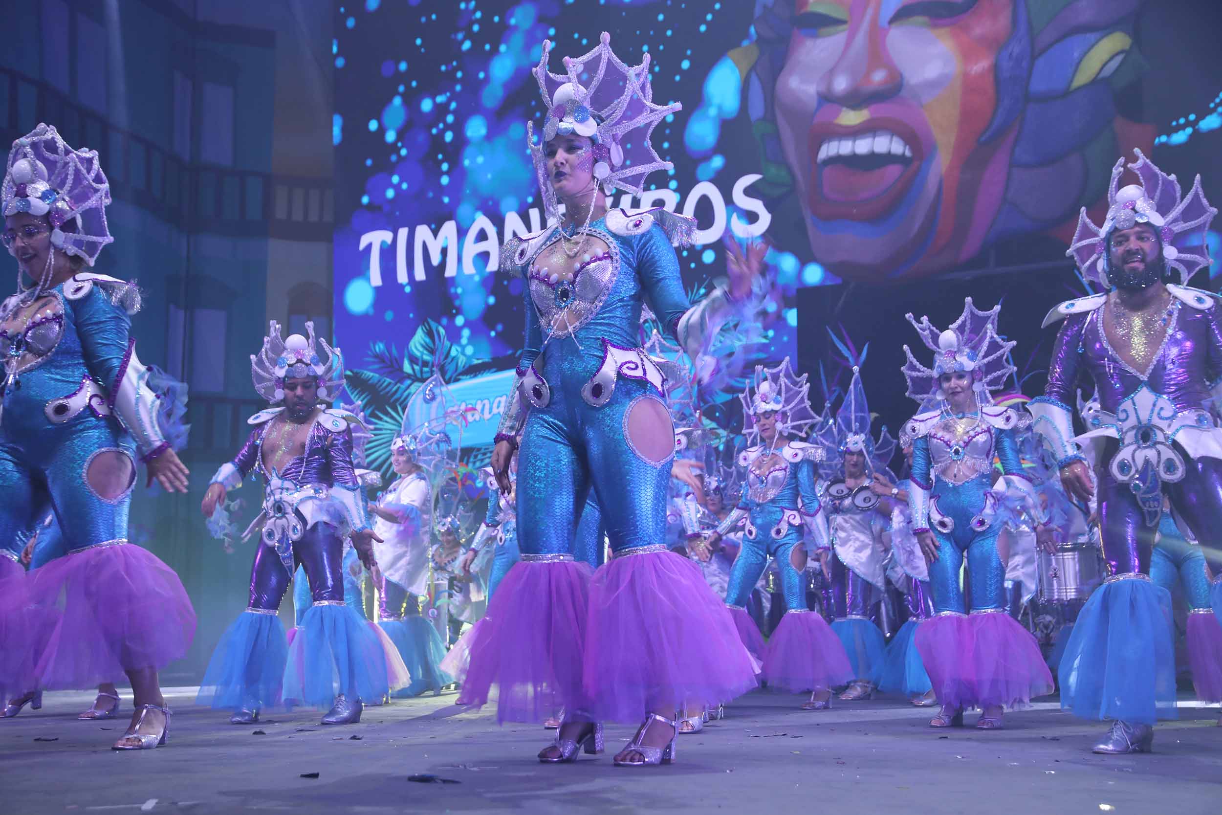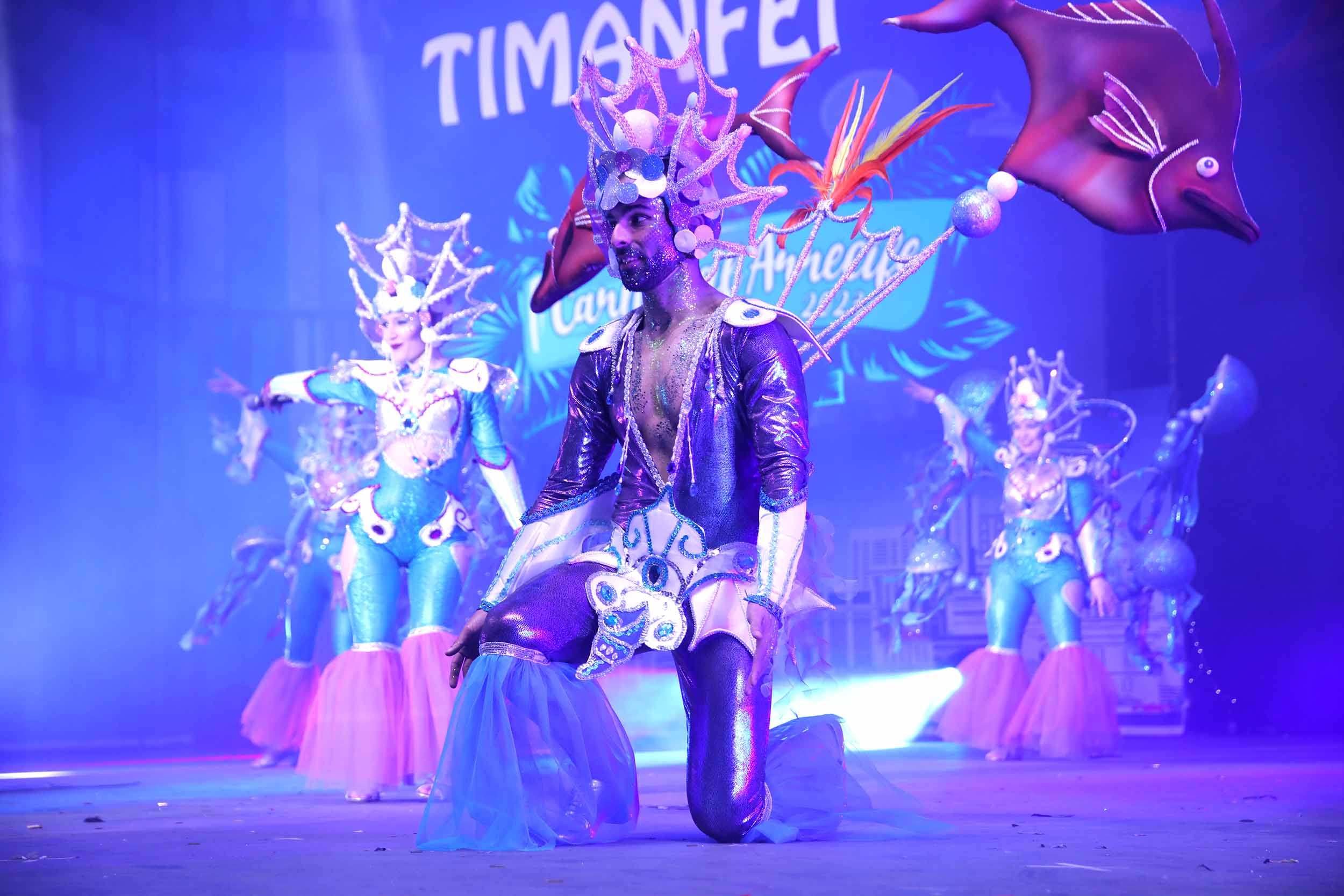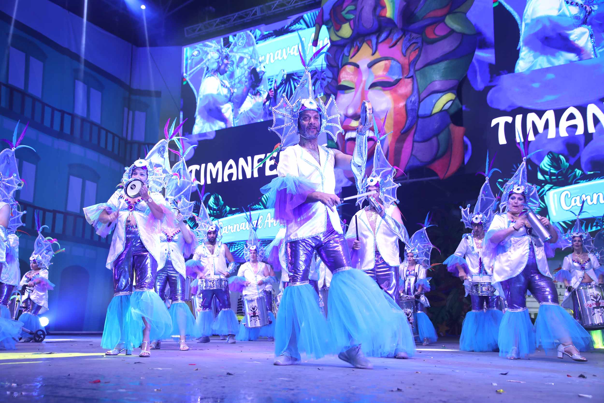 A continuación, fue el turno de “Timanfeiros”, otra de las comparsas más esperadas de la noche. La agrupación fundada en 1996 en la localidad sureña de Uga (Yaiza), logró mantener la energía del público en todo lo alto. La percusión y las voces de sus sesenta y siete integrantes, presididos por Luis Martín, resonaron por todo el recinto ferial, creando una atmósfera mágica y única, al ritmo de la coreografía de Jonathan Gutiérrez y la dirección musical de Willy Morales; exhibiendo un fantástico diseño realizado por la propia comparsa y confeccionado por Blas Noda, con la fantasía denominada “Tangaroa”.