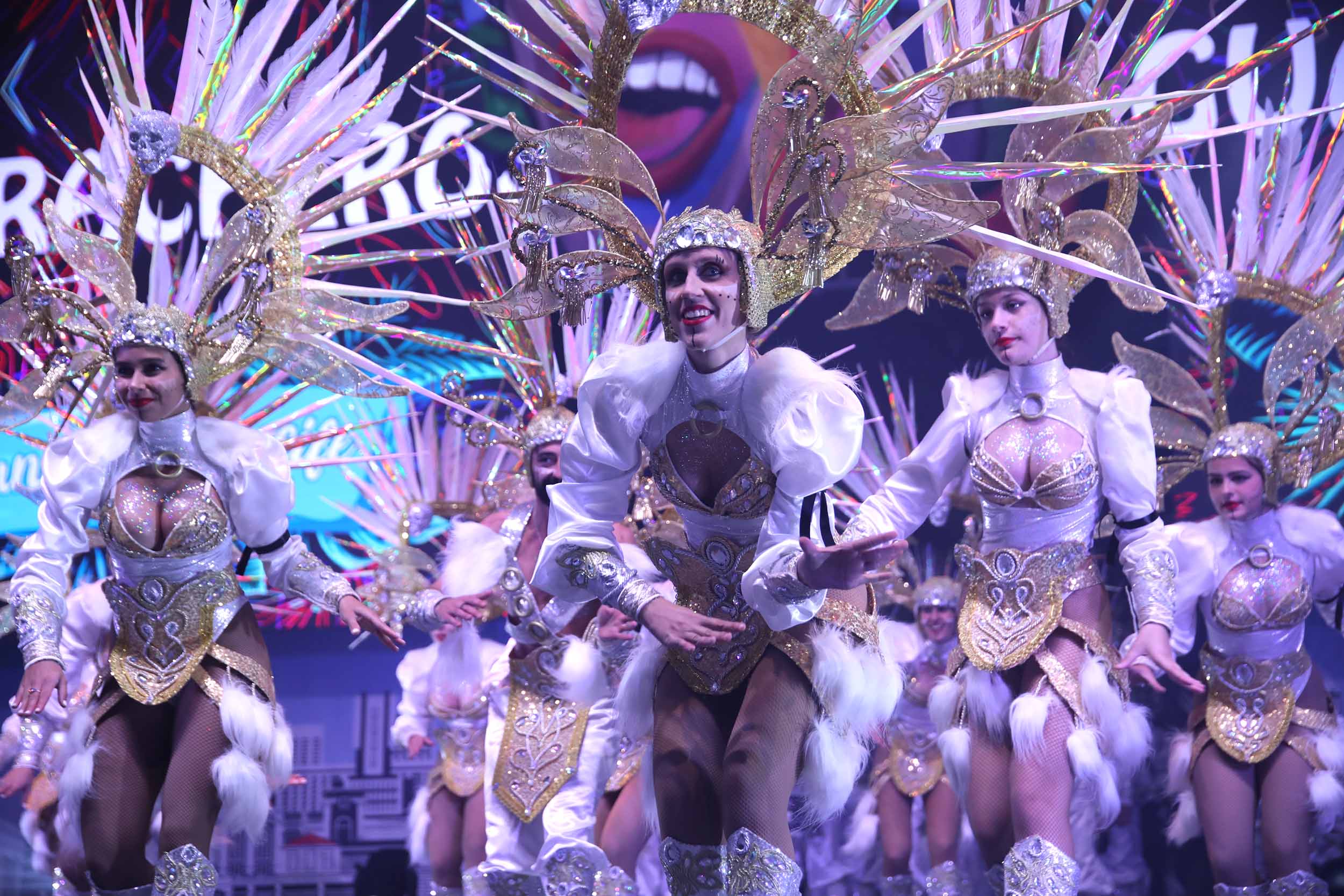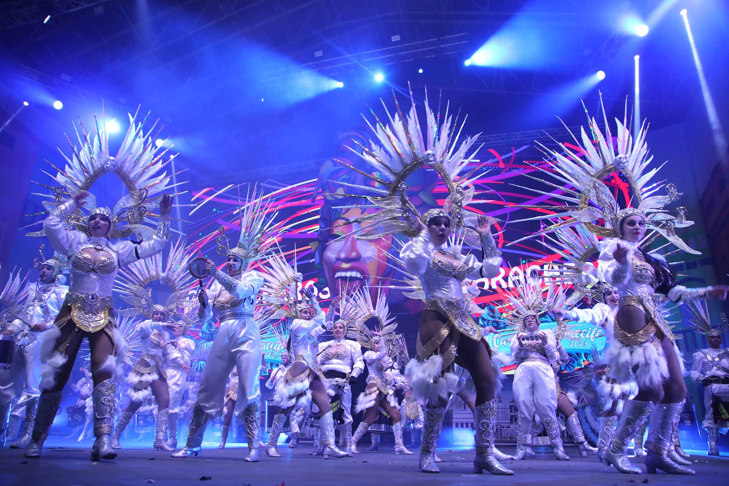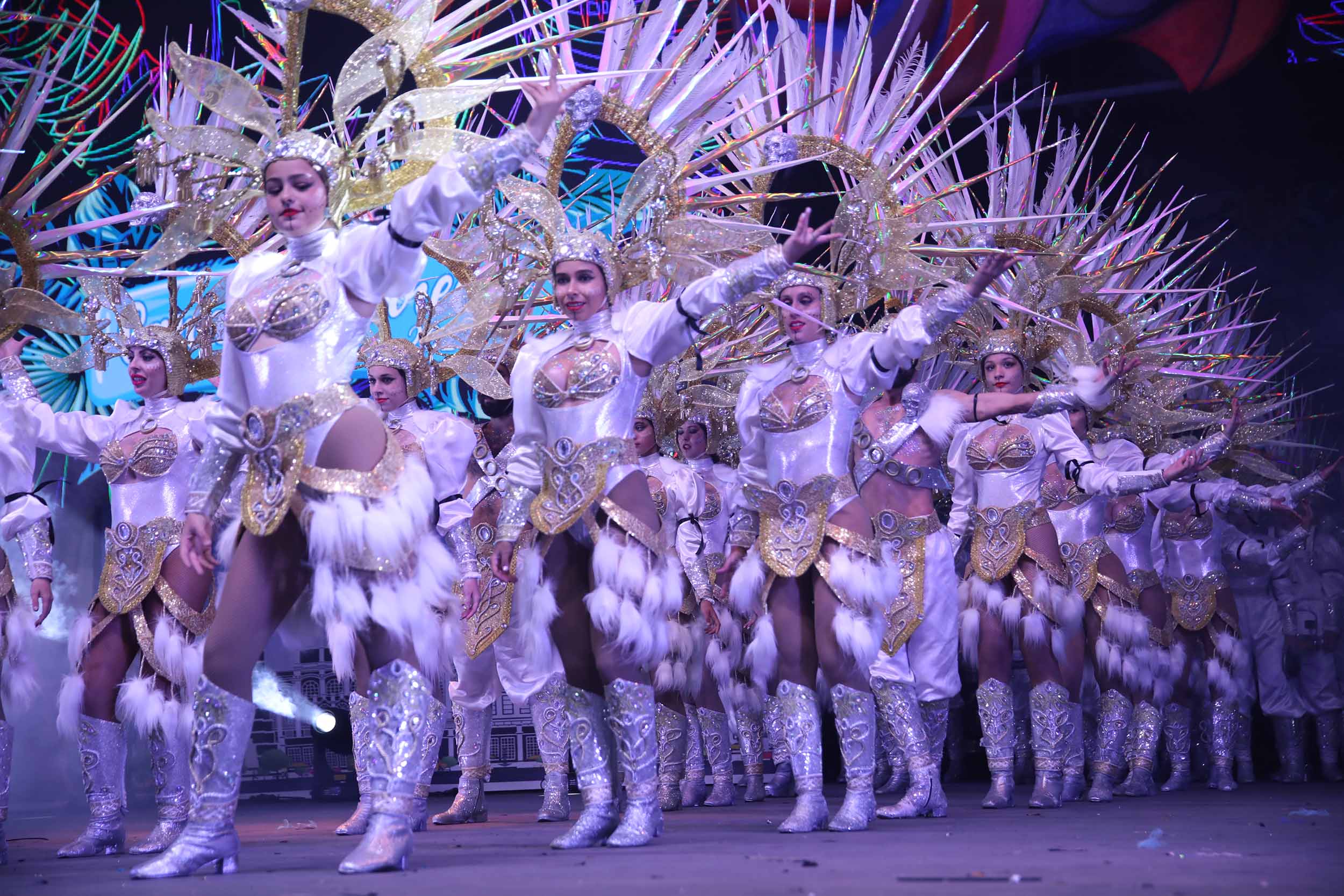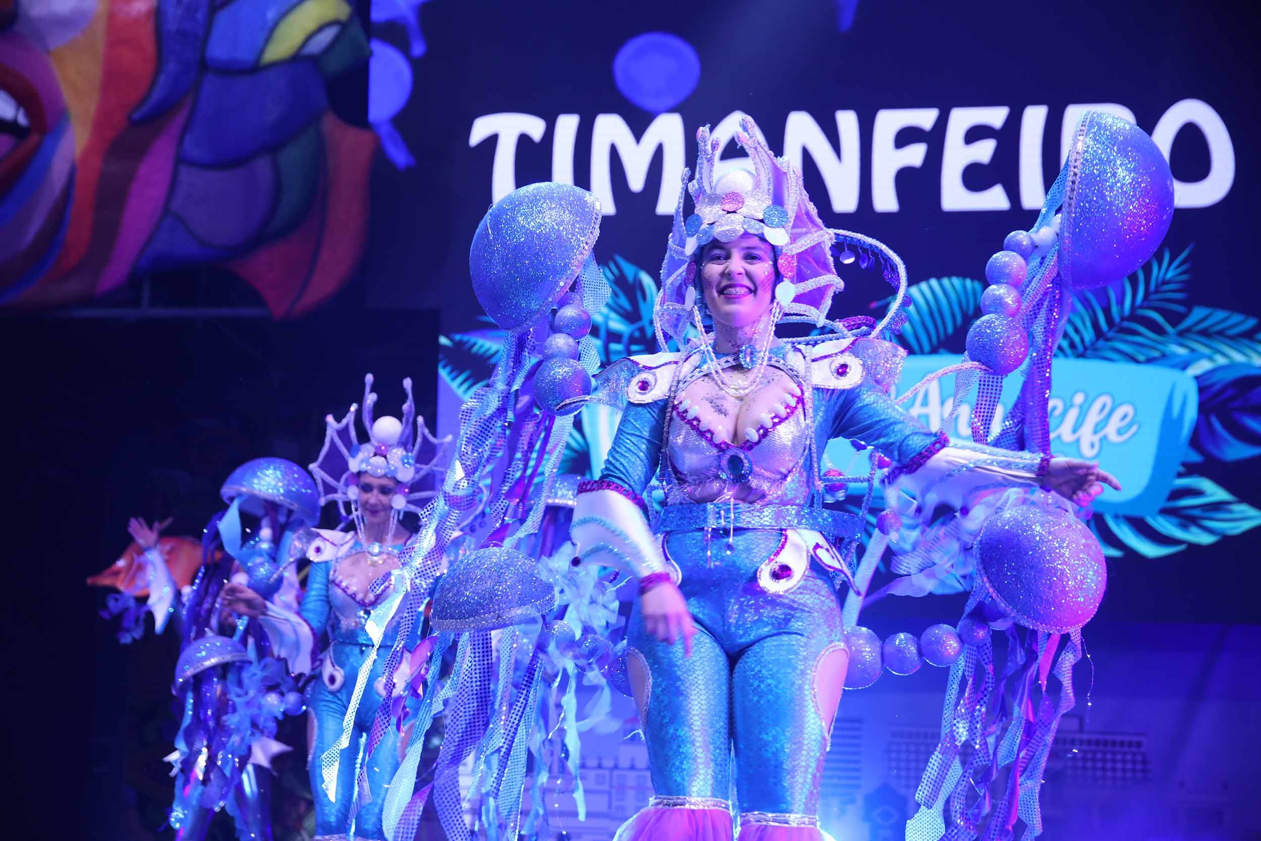 A continuación, fue el turno de “Timanfeiros”, otra de las comparsas más esperadas de la noche. La agrupación fundada en 1996 en la localidad sureña de Uga (Yaiza), logró mantener la energía del público en todo lo alto. La percusión y las voces de sus sesenta y siete integrantes, presididos por Luis Martín, resonaron por todo el recinto ferial, creando una atmósfera mágica y única, al ritmo de la coreografía de Jonathan Gutiérrez y la dirección musical de Willy Morales; exhibiendo un fantástico diseño realizado por la propia comparsa y confeccionado por Blas Noda, con la fantasía denominada “Tangaroa”.
