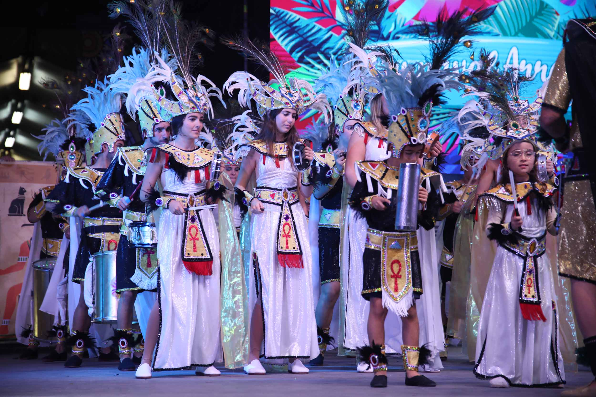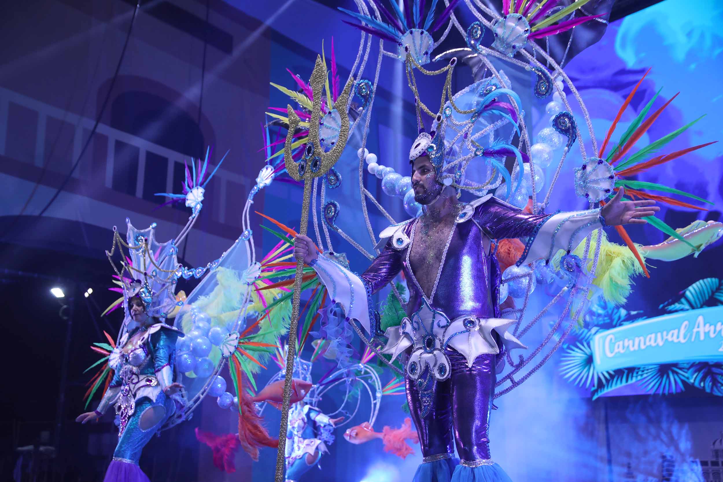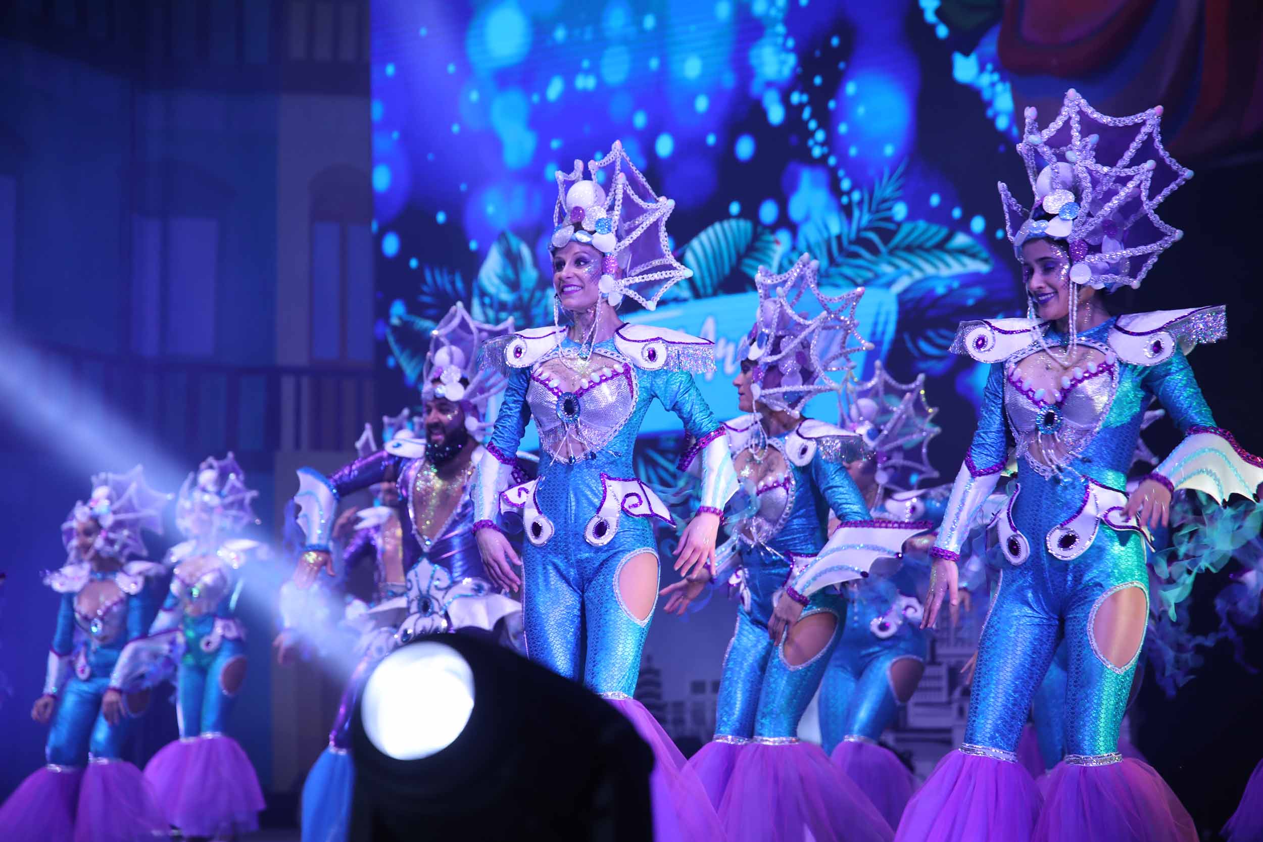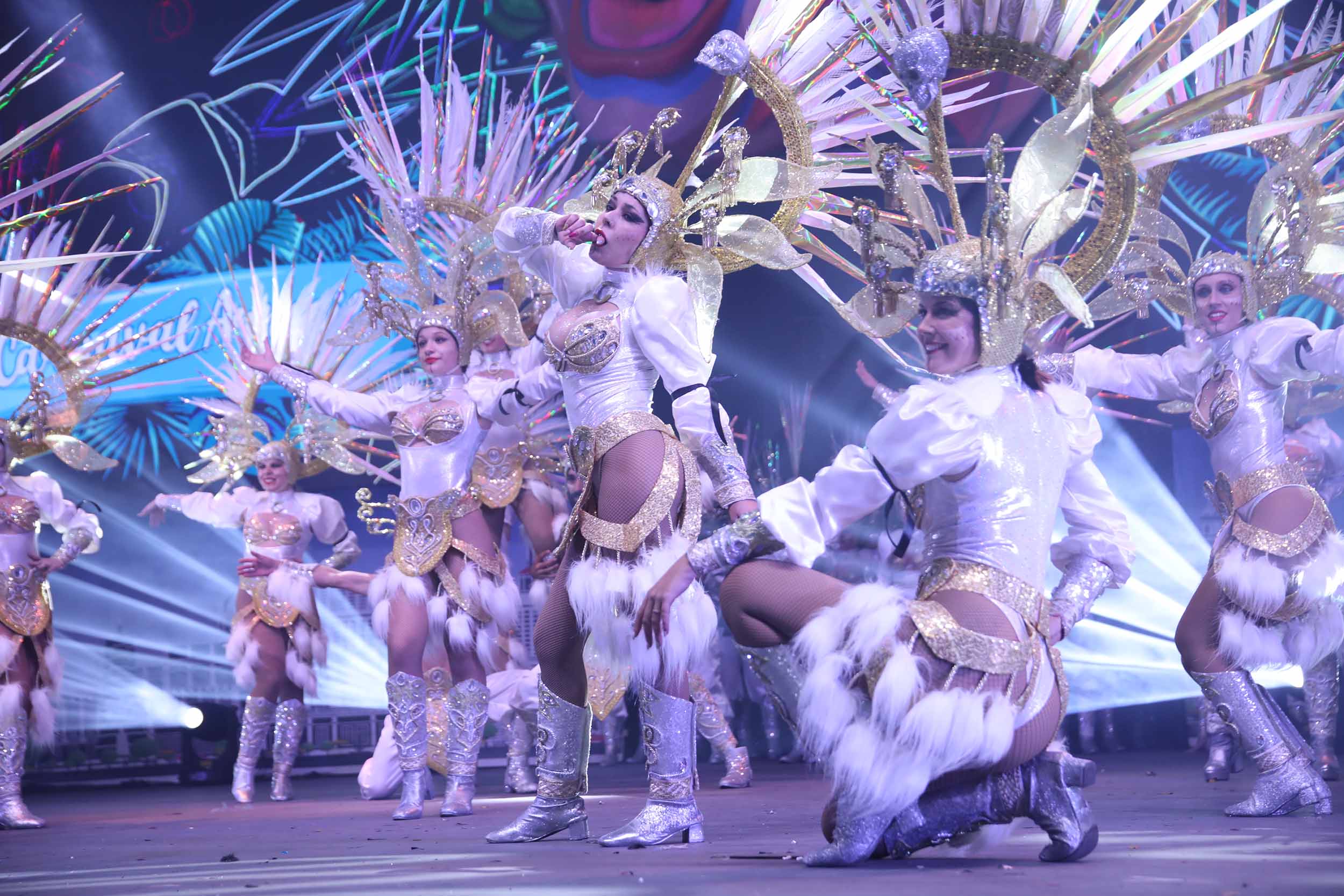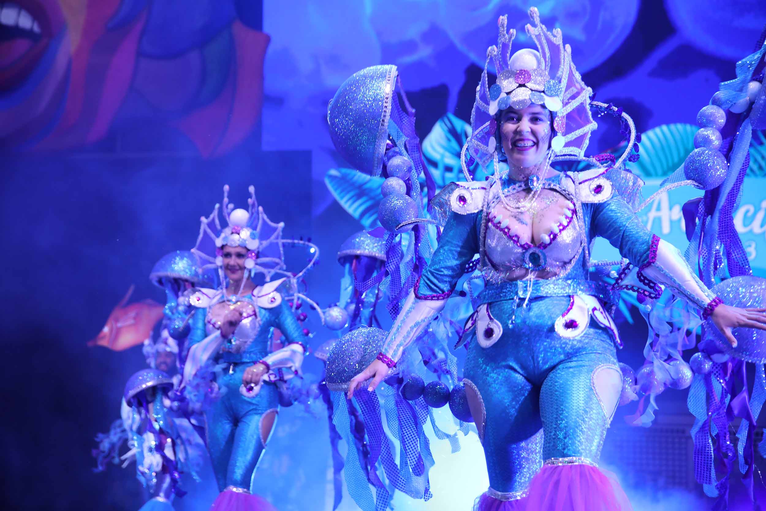 A continuación, fue el turno de “Timanfeiros”, otra de las comparsas más esperadas de la noche. La agrupación fundada en 1996 en la localidad sureña de Uga (Yaiza), logró mantener la energía del público en todo lo alto. La percusión y las voces de sus sesenta y siete integrantes, presididos por Luis Martín, resonaron por todo el recinto ferial, creando una atmósfera mágica y única, al ritmo de la coreografía de Jonathan Gutiérrez y la dirección musical de Willy Morales; exhibiendo un fantástico diseño realizado por la propia comparsa y confeccionado por Blas Noda, con la fantasía denominada “Tangaroa”.