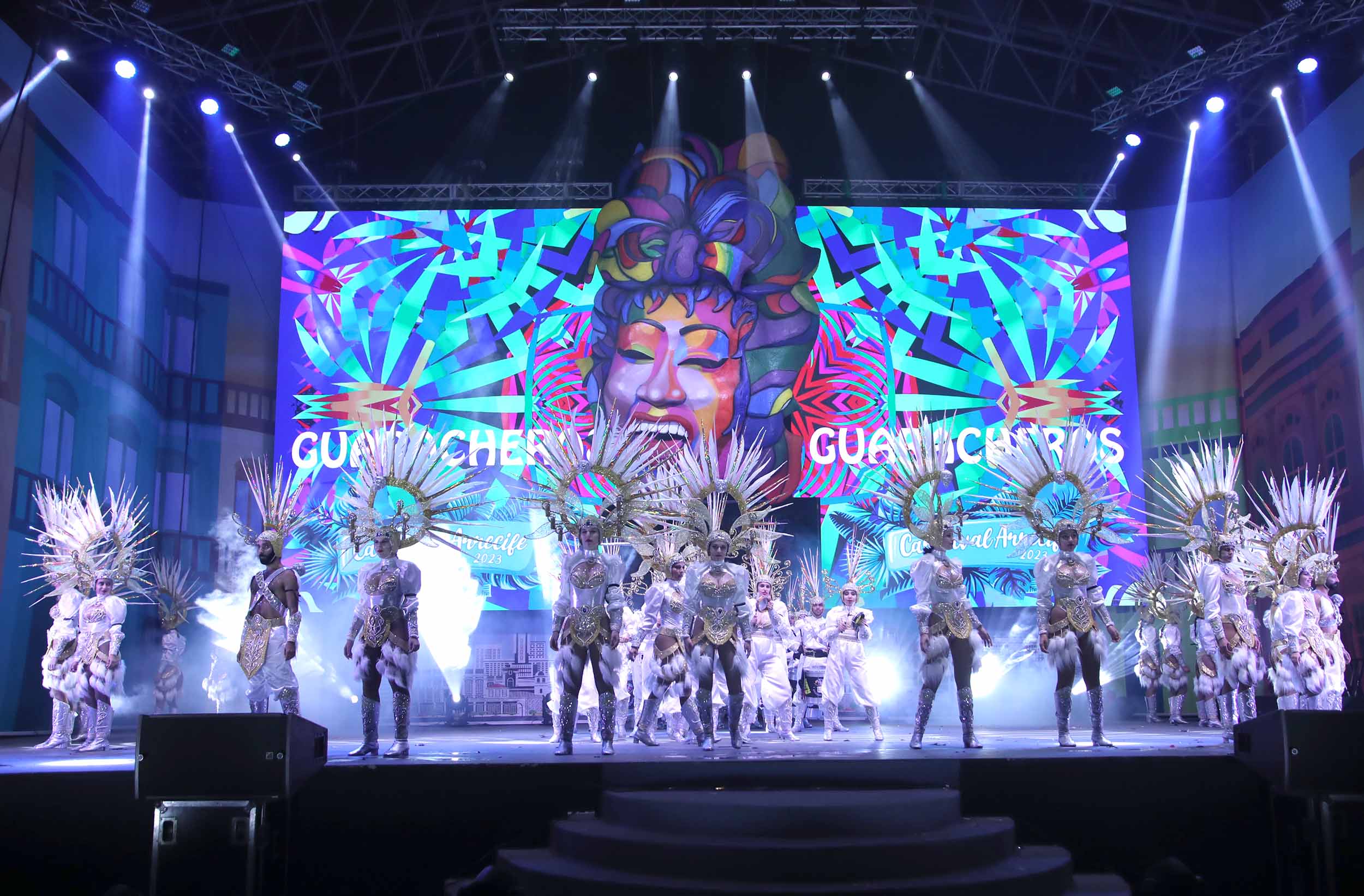 La tercera comparsa en salir al escenario fue “Guaracheros”. La formación de sesenta y tres componentes, presidida por Verónica Rueda, presentó un espectáculo titulado “Los guerreros de Odín” que logró mantener el nivel de sus antecesores en una actuación muy emotiva para ellos debido al reciente fallecimiento de una familiar de tres de sus miembros a la que dedicaron su magnífica puesta en escena. Con sus coreografías diseñadas por Diego Rueda y sus ritmos contagiosos al son que marcaba la batucada dirigida por Alejandro Tejera, “Guaracheros” lució una fantasía denominada “Dioses de Valhalla”, diseñada por Kilian Betancort.