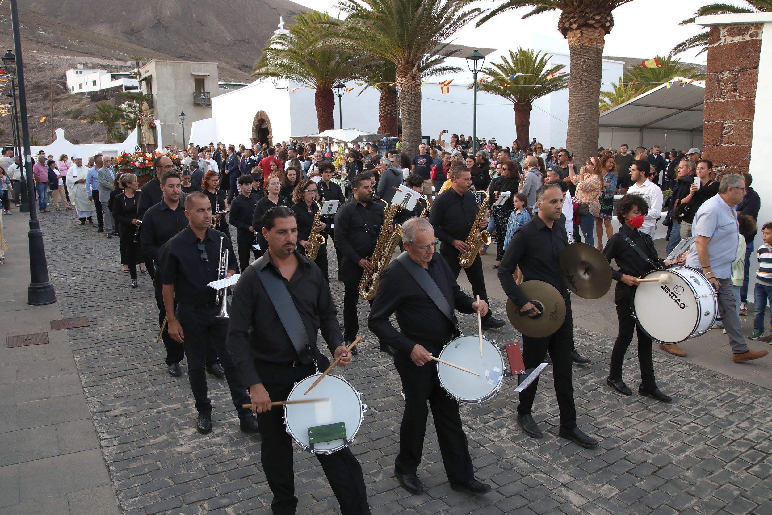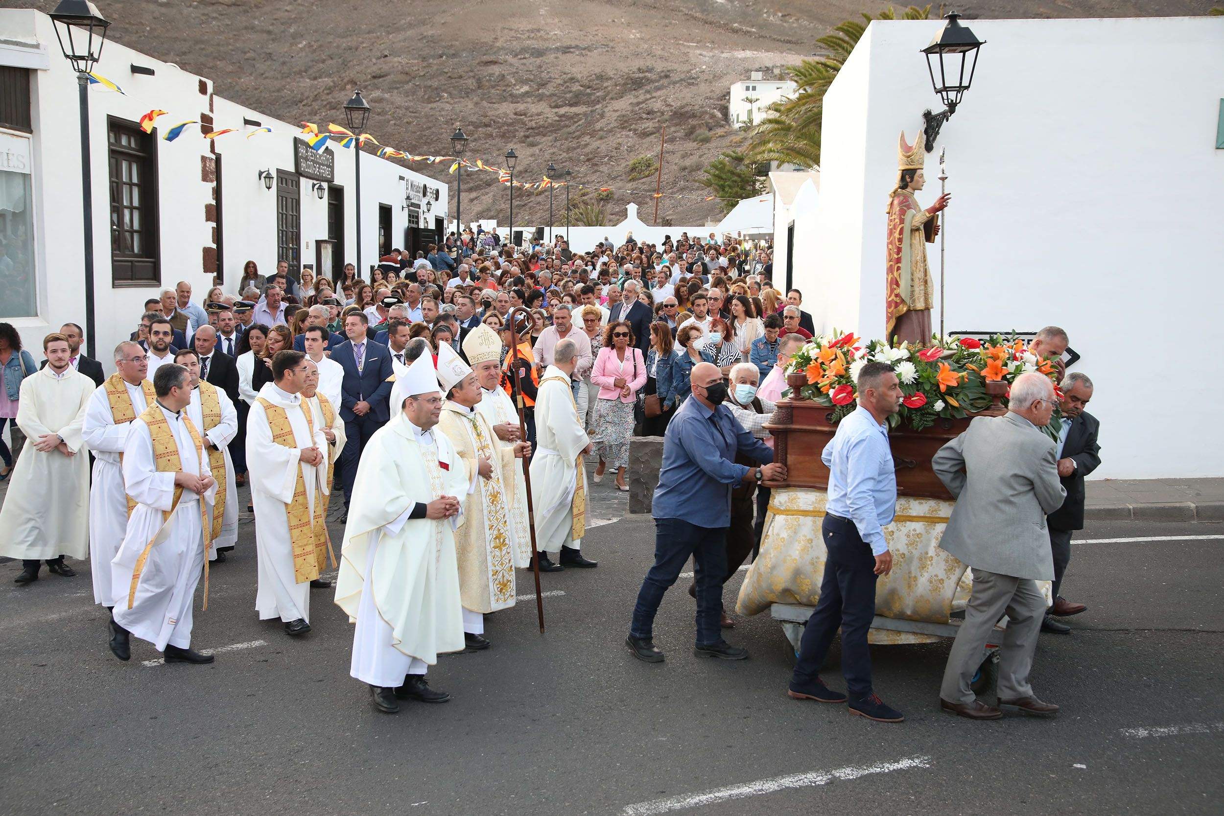 Finalizada la Eucaristía comenzó la procesión encabezada por la Banda de Música de Yaiza, seguida por la imagen de San Marcial del Rubicón, arropada por el nuncio apostólico, los obispos, sacerdotes, autoridades civiles y militares y los cientos de feligreses.