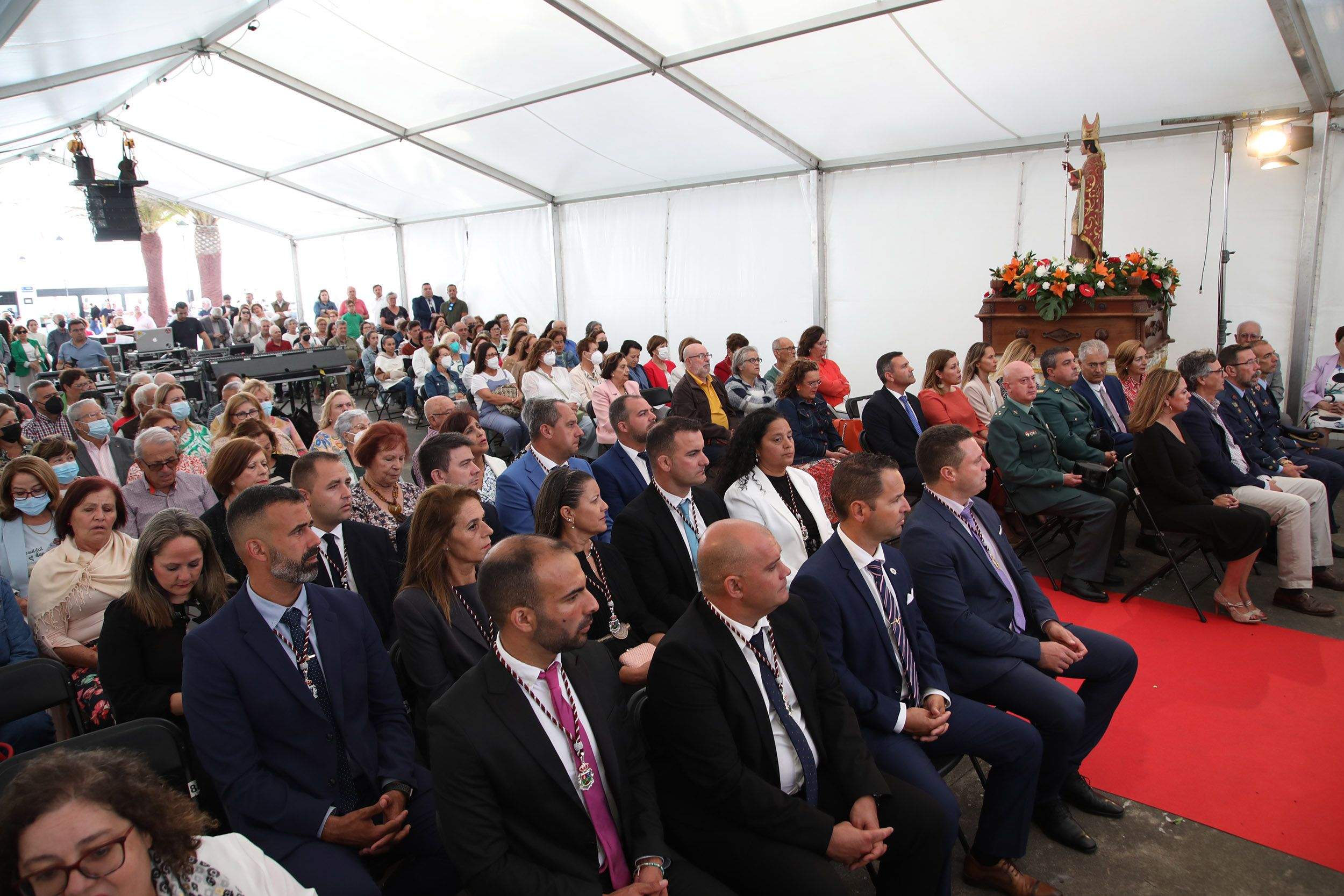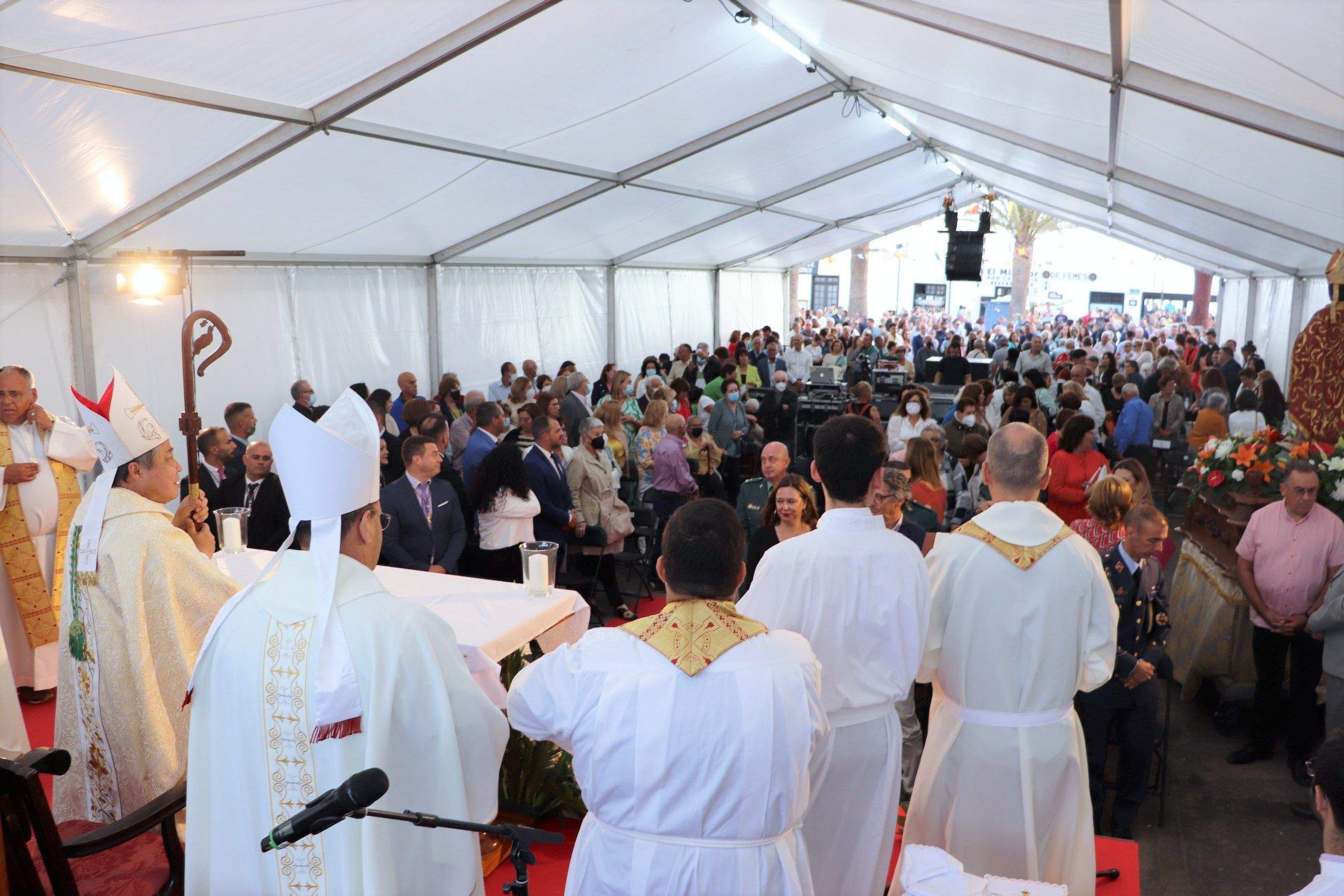 Una hora más tarde, a las 19:00 horas, cumpliendo con la programación, comenzaba la Santa Misa, que este año tuvo lugar en la carpa instalada en la plaza de Femés, para así dar cabida a todos los numerosos feligreses que acudieron a honrar a San Marcial del Rubicón.