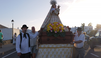 Finalizada la Misa, se procedió a la procesión por las calles del pueblo precedida por la imagen de la Virgen. El sacerdote celebrante, las autoridades municipales, entre los que se encontraba el concejal de Fiestas, Daniel Medina, y feligreses, recorrieron las calles en una procesión que estuvo amenizado por las parrandas Janubio y El Golpito.