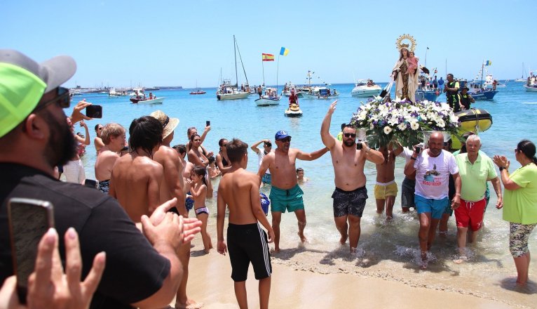 Fieles y acompañantes participaron en la Plaza del Carmen de la misa presidida por el párroco de Yaiza, Jonathan Almeida, para luego salir en procesión entre vítores y aplausos hasta la playa pequeña del pueblo junto a la parranda Pal Porrón, donde ya se palpaba un ambiente de celebración espectacular: la playa y el paseo marítimo a tope y barcos engalanados esperando el embarque de la Virgen en el pesquero Nuevo Fren de Óscar González para dar inicio a la peregrinación por mar.