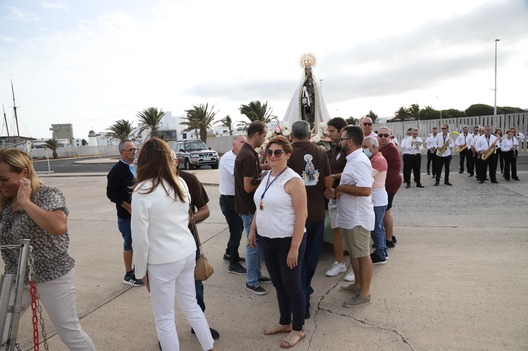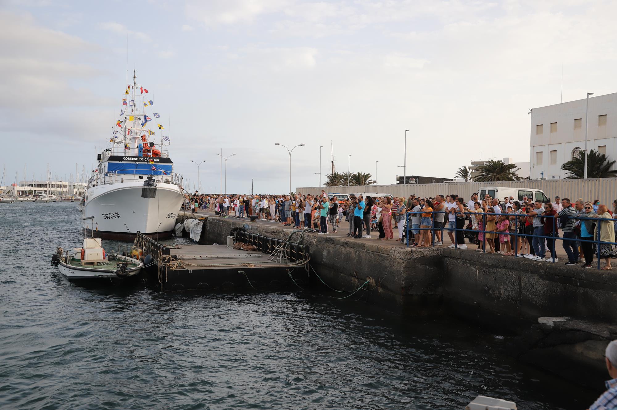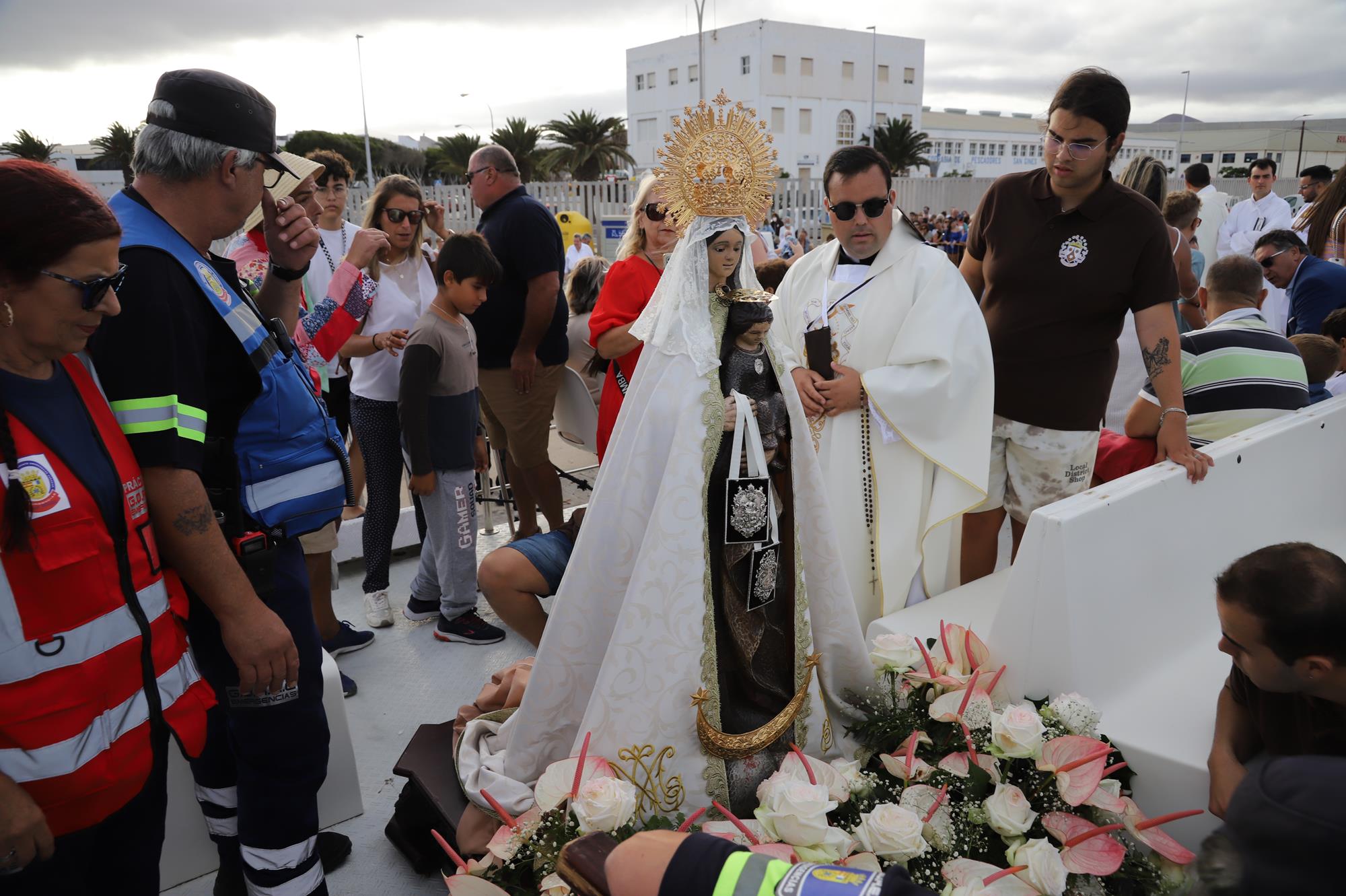 Una vez en el muelle, la Virgen del Carmen fue embarcada a bordo de “Boramar”, una propiedad de Líneas Marítimas Romero cedida a la concejala de Fiestas del Ayuntamiento de Arrecife, Encarna Páez, para pasear a la Patrona de los Marineros por la bahía de Arrecife y que durante todo el recorrido fue escoltada por pequeñas embarcaciones.