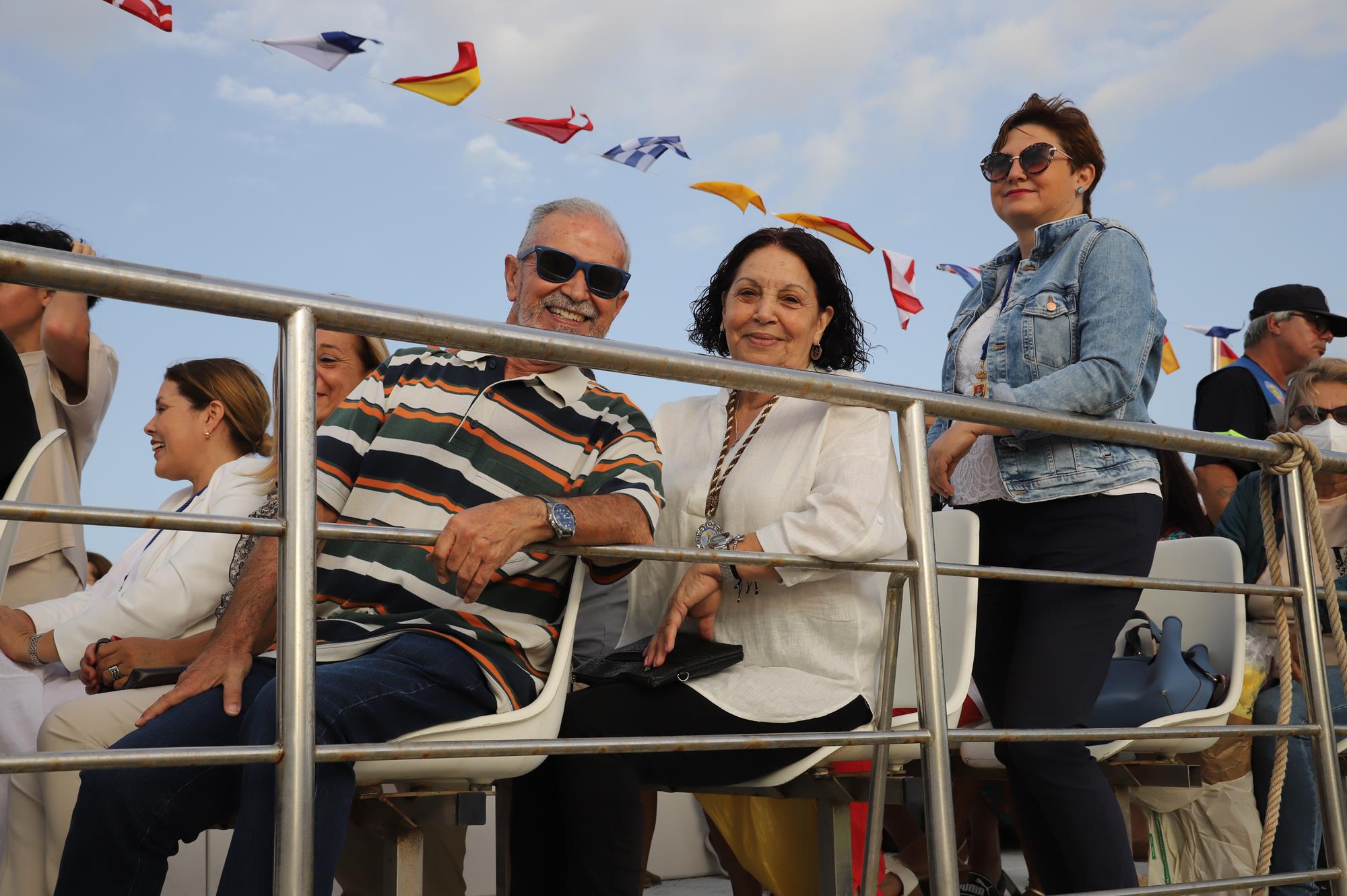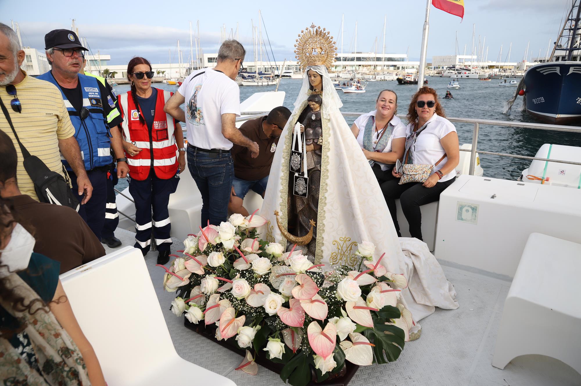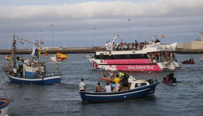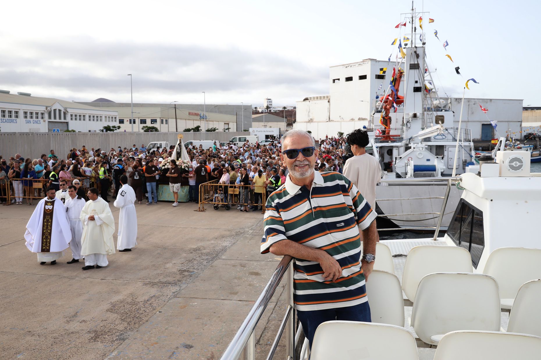 Una vez en el muelle, la Virgen del Carmen fue embarcada a bordo de “Boramar”, una propiedad de Líneas Marítimas Romero cedida a la concejala de Fiestas del Ayuntamiento de Arrecife, Encarna Páez, para pasear a la Patrona de los Marineros por la bahía de Arrecife y que durante todo el recorrido fue escoltada por pequeñas embarcaciones.
