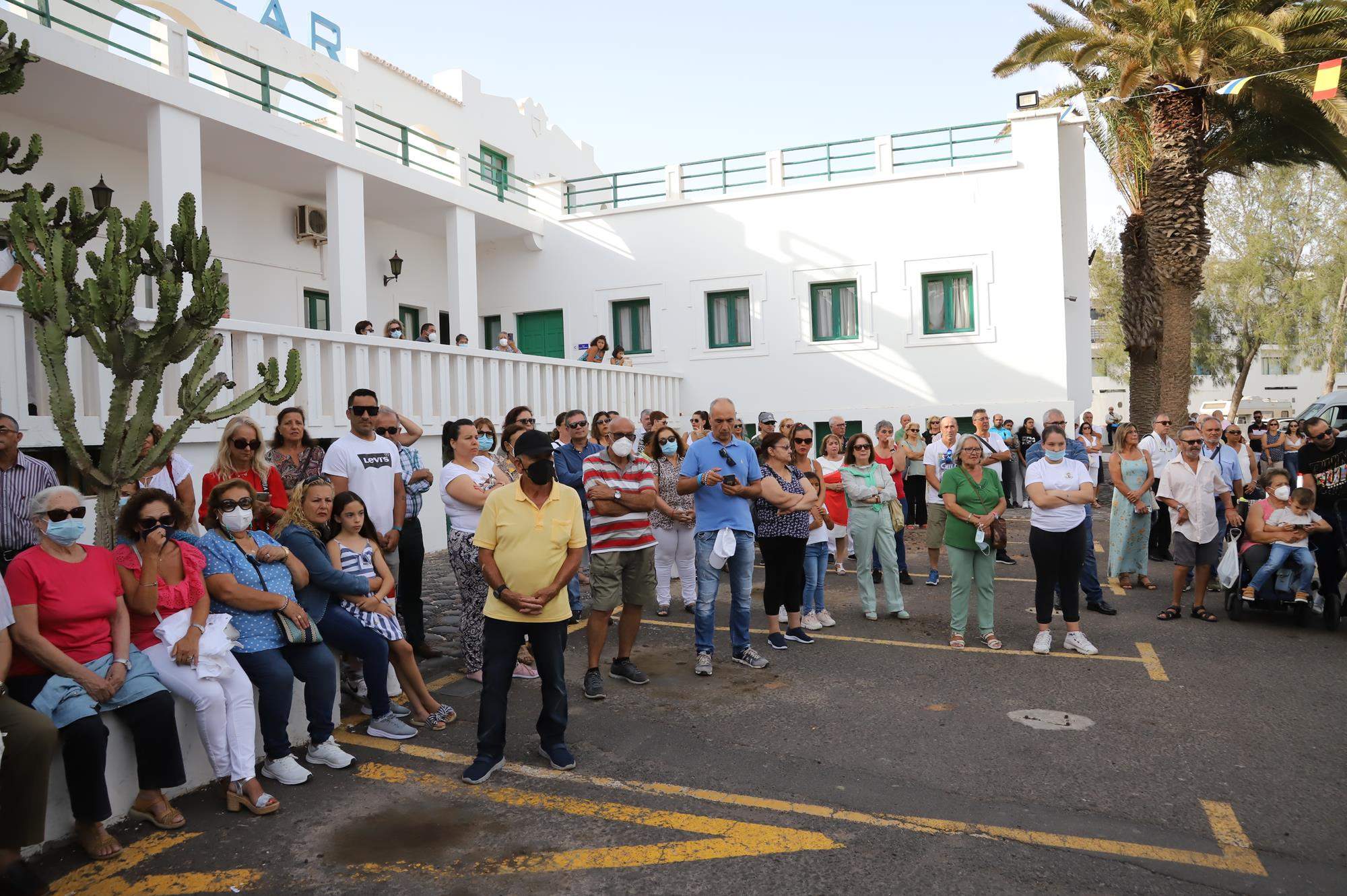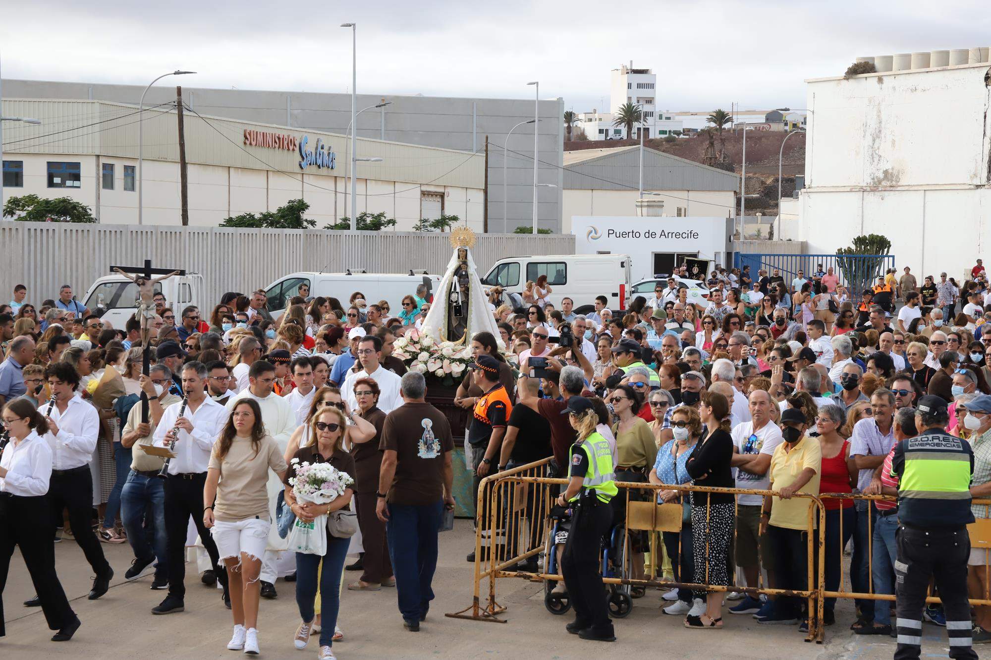 Cuando los barcos llegaron a la altura del muelle comercial de Arrecife, pararon sus motores y procedieron a orar en memoria de los marineros fallecidos, así como a realizar una ofrenda floral. Tras terminar el recorrido, el Boramar regresó a Puerto Naos, donde la Banda de Música dio la bienvenida a Nuestra Señora del Carmen y la acompañó, junto con los feligreses, hasta llegar a la iglesia.