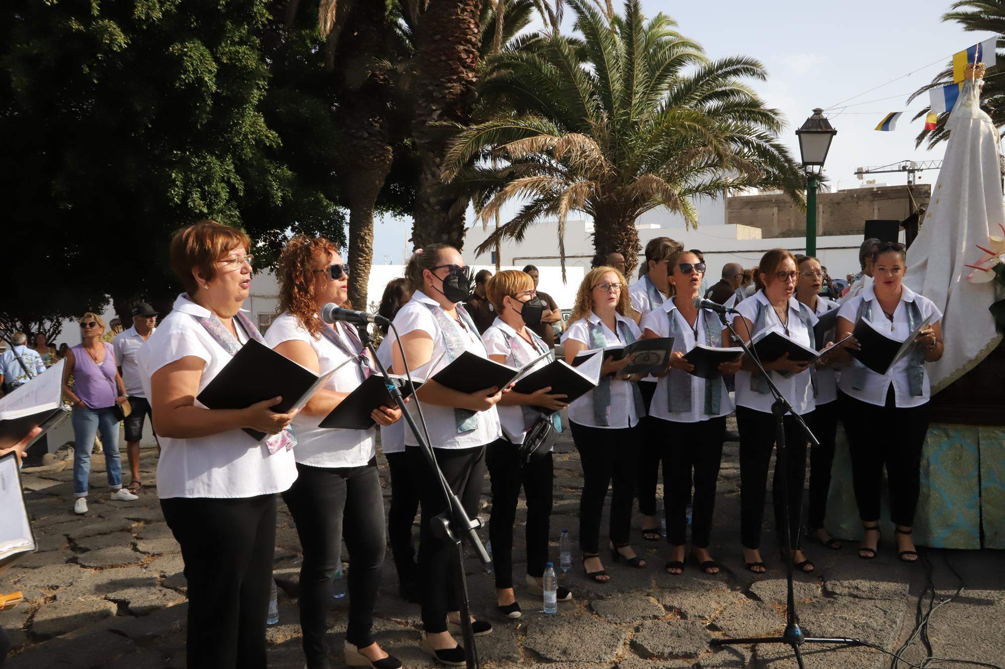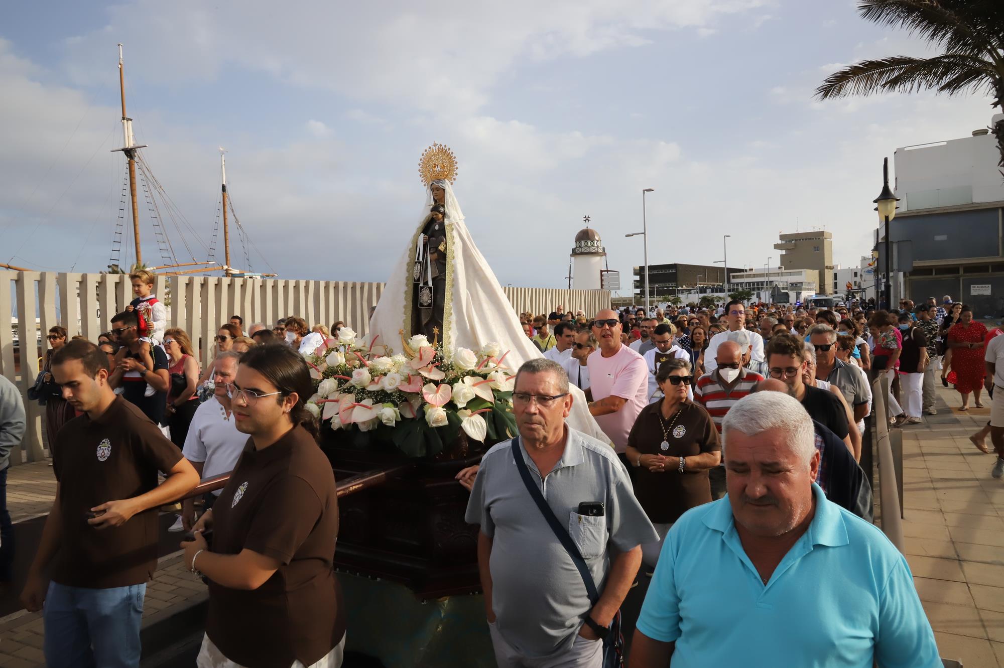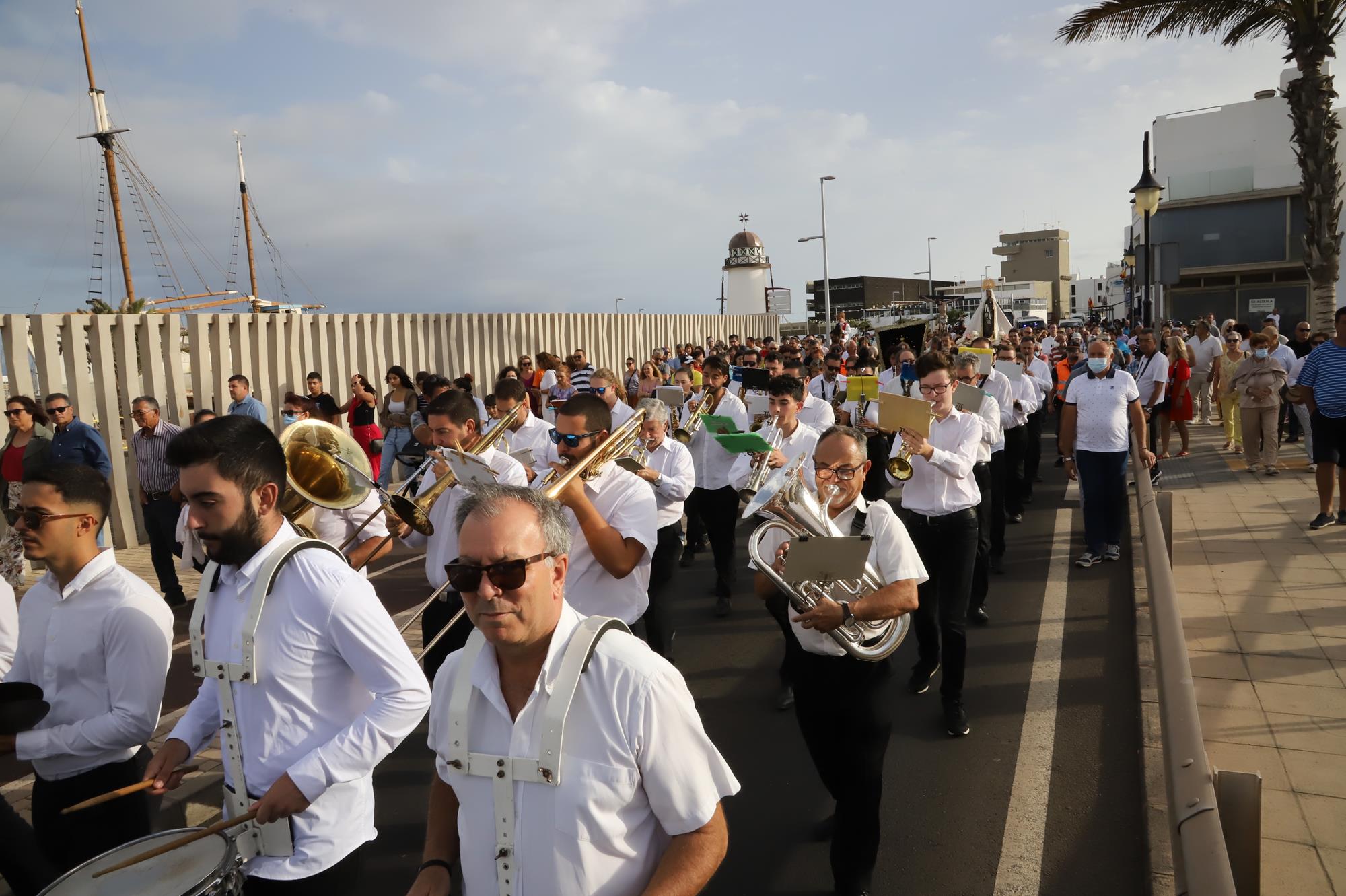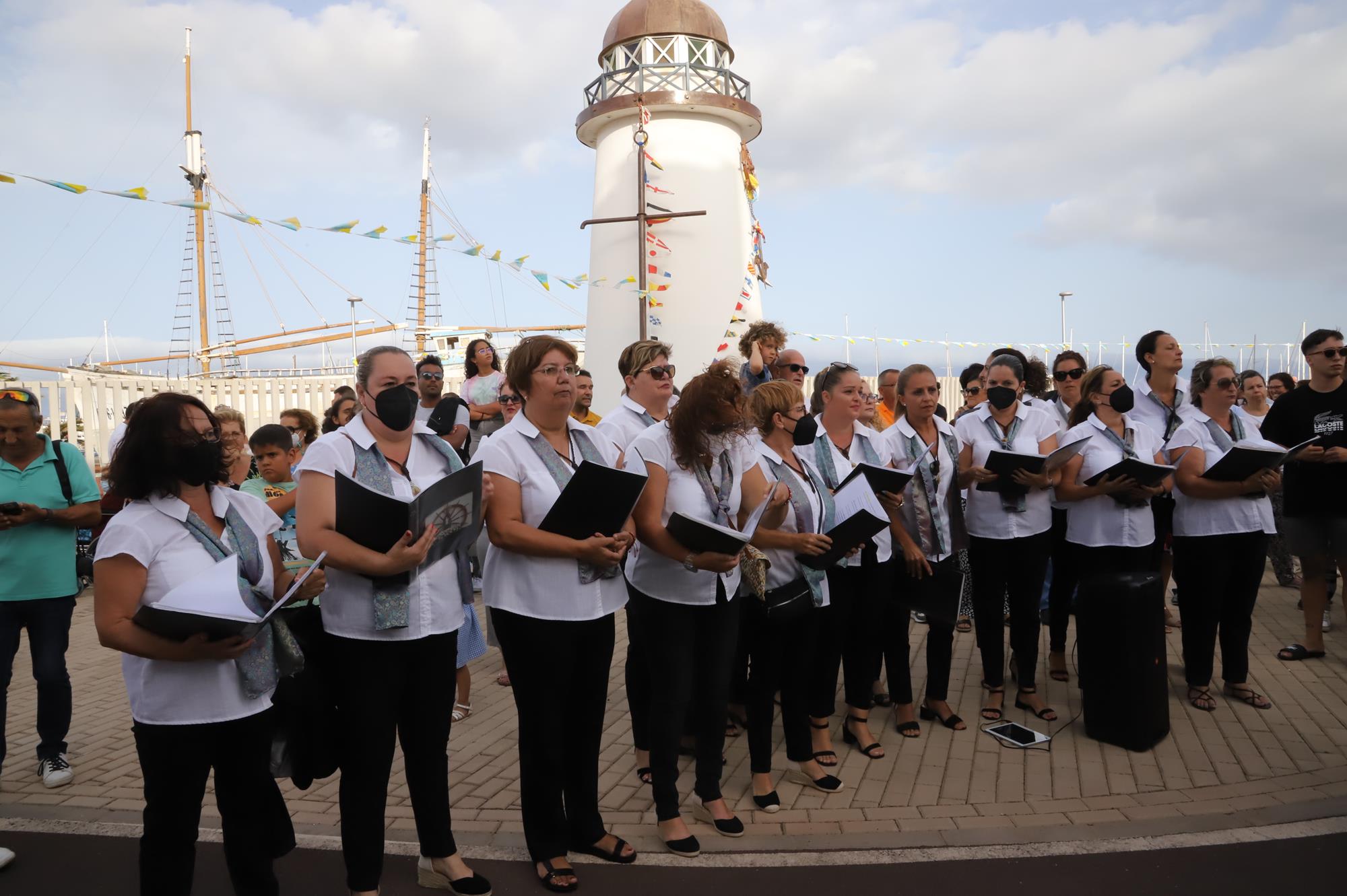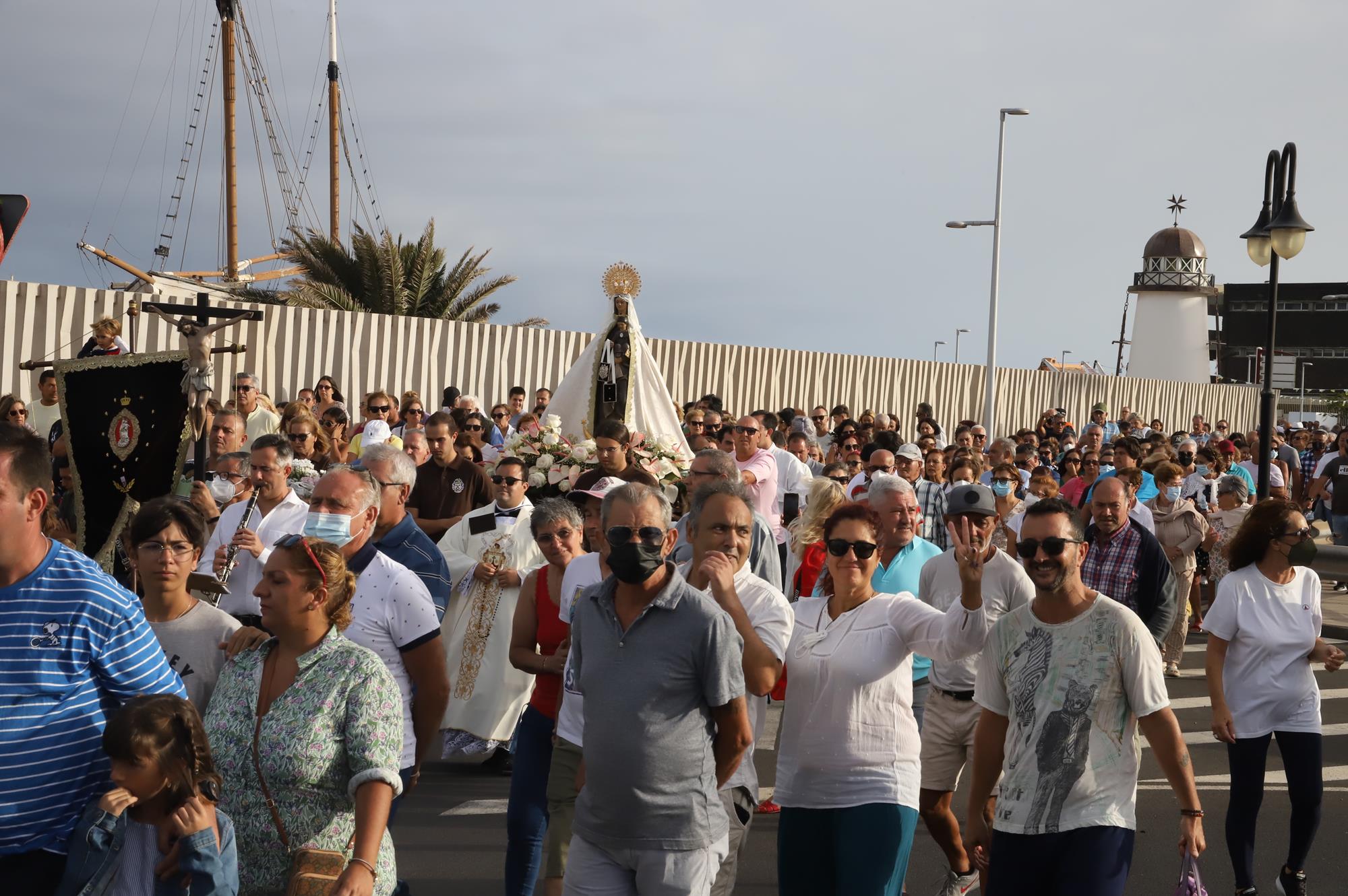 La misa estuvo amenizada con los cantos interpretados por la Coral Iris del Mar, de Valterra, así como por el Coro Rociero Al-Andalus entre Alisios y Levante. Una vez finalizada, la procesión puso rumbo al muelle de Puerto Naos, encabezada por la banda de música Unión Musical de Lanzarote, dirigida por el profesor Pepe Artiles. Al pasar por el monumento "La luz que nos Guía", un homenaje a los marineros fallecidos, la Coral Iris del Mar cantó la "Salve Marinera".