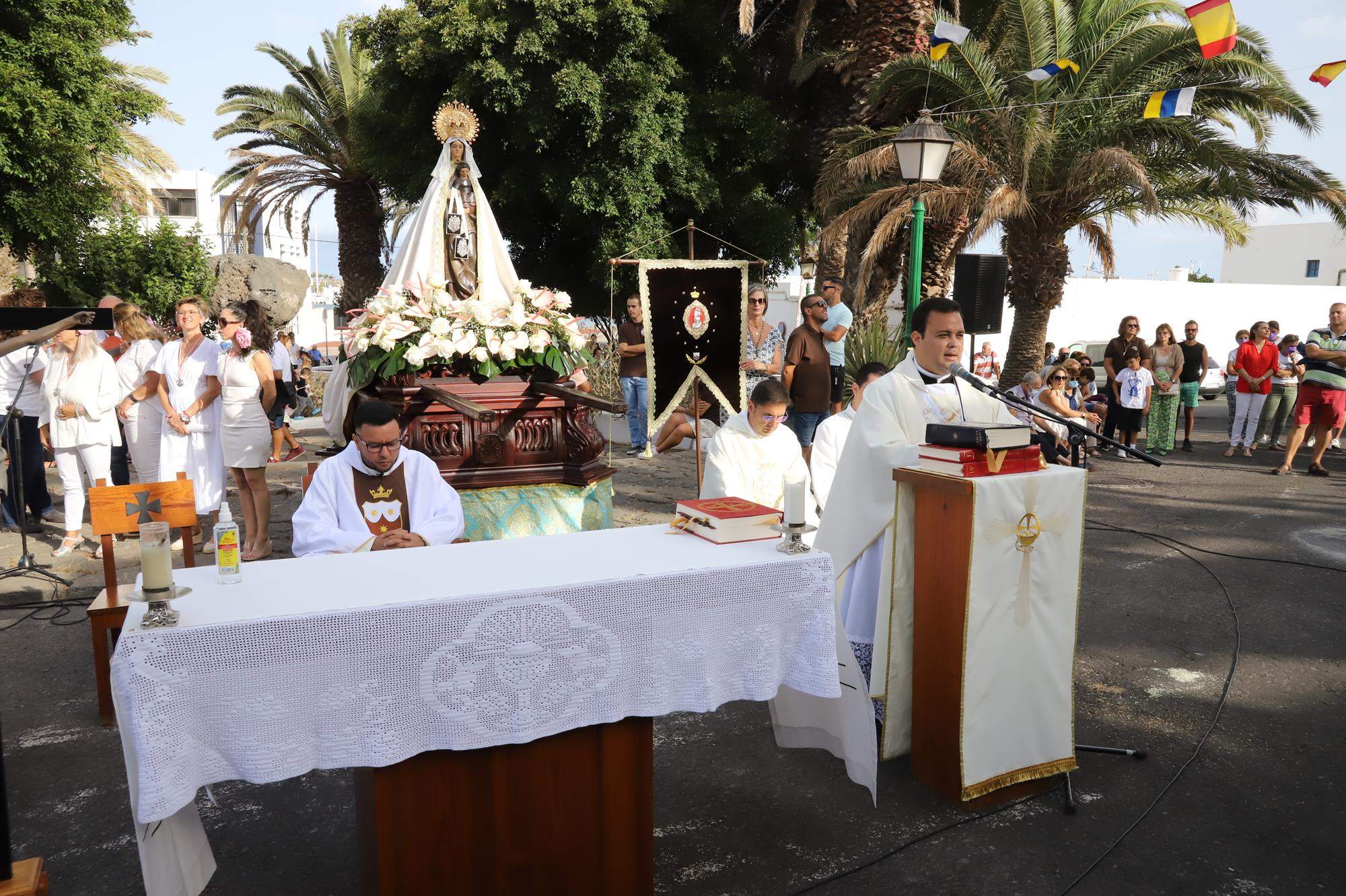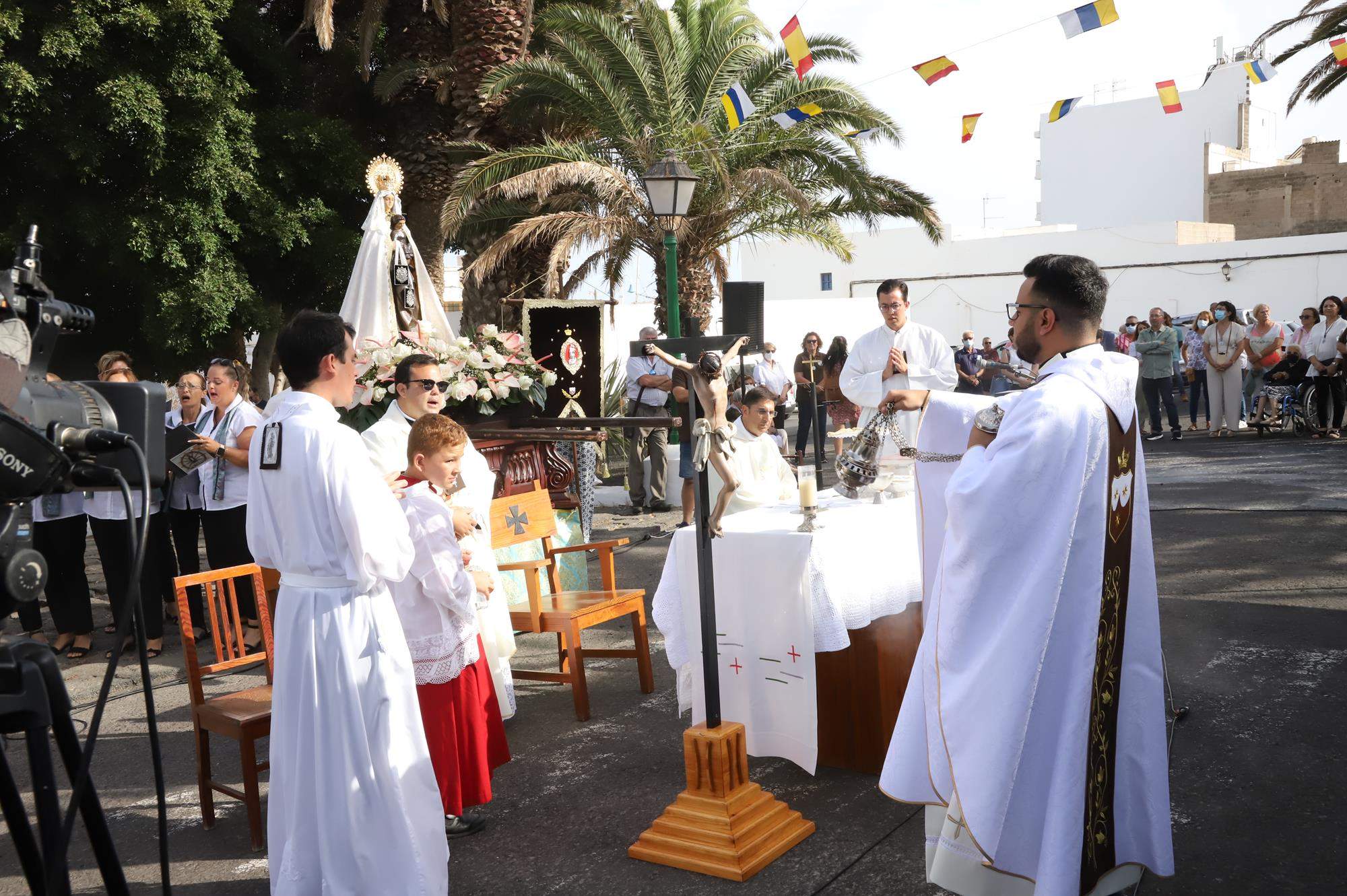 La primera parada del recorrido tuvo lugar en la explanada frente al Hospital Insular en torno a las seis de la tarde, donde las personas mayores allí residentes esperaban la llegada de la Virgen. Minutos después comenzaba la misa presidida por Jesús Andrés Medina Durán, sacerdote de la Diócesis de Trujillo (Venezuela), asistido por el párroco de San Ginés, Arcipreste de Lanzarote y Vicario Episcopal de Lanzarote, Fuerteventura y La Graciosa, Juan Carlos Medina, y por el párroco de Valterra y Altavista, Nicanor Bermúdez. También acudieron los seminaristas lanzaroteños Alejandro Carmona y Daniel Romero y el pequeño monaguillo de Valterra.