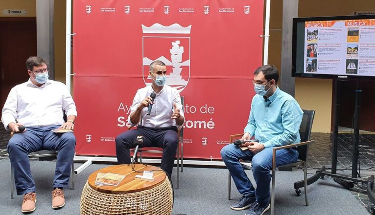 El municipio de San Bartolomé va retomando poco a poco su agenda cultural. Su alcalde, Alexis Tejera, acompañado del concejal de Cultura Isidro Pérez, y del consejero del Cabildo, Alberto Aguiar, ha presentado este miércoles la programación que se desarrollará bajo "estrictas normas de seguridad" en distintos espacios públicos que contarán con aforo limitado y asignación previa, pero que mantendrá activa la cultura. Una agenda que incluye música variada, teatro, literatura, artes escénicas