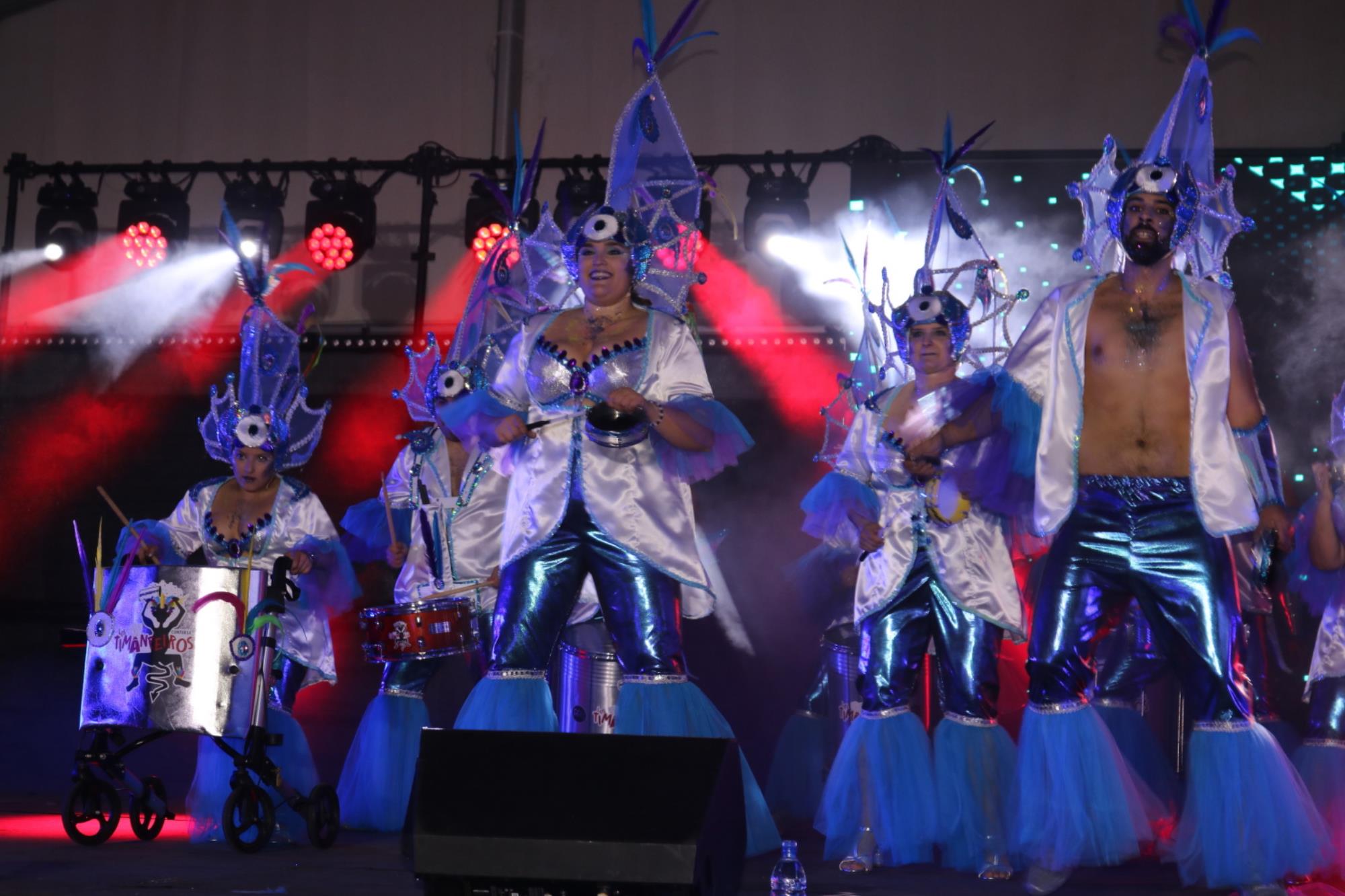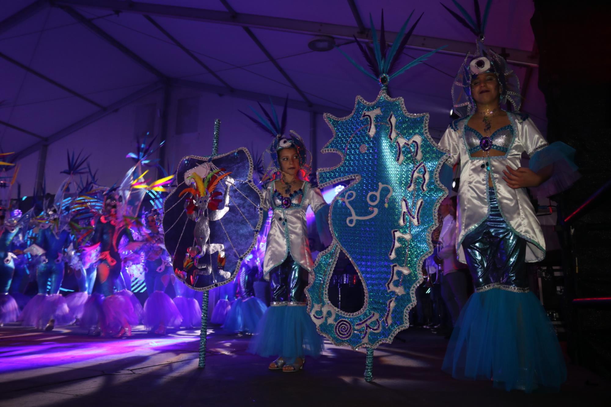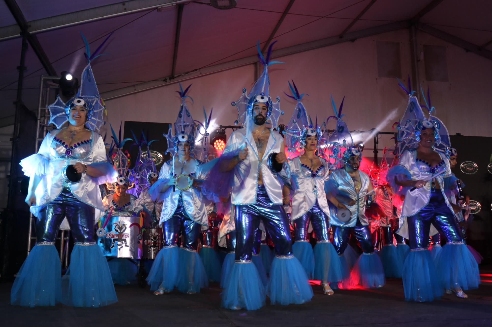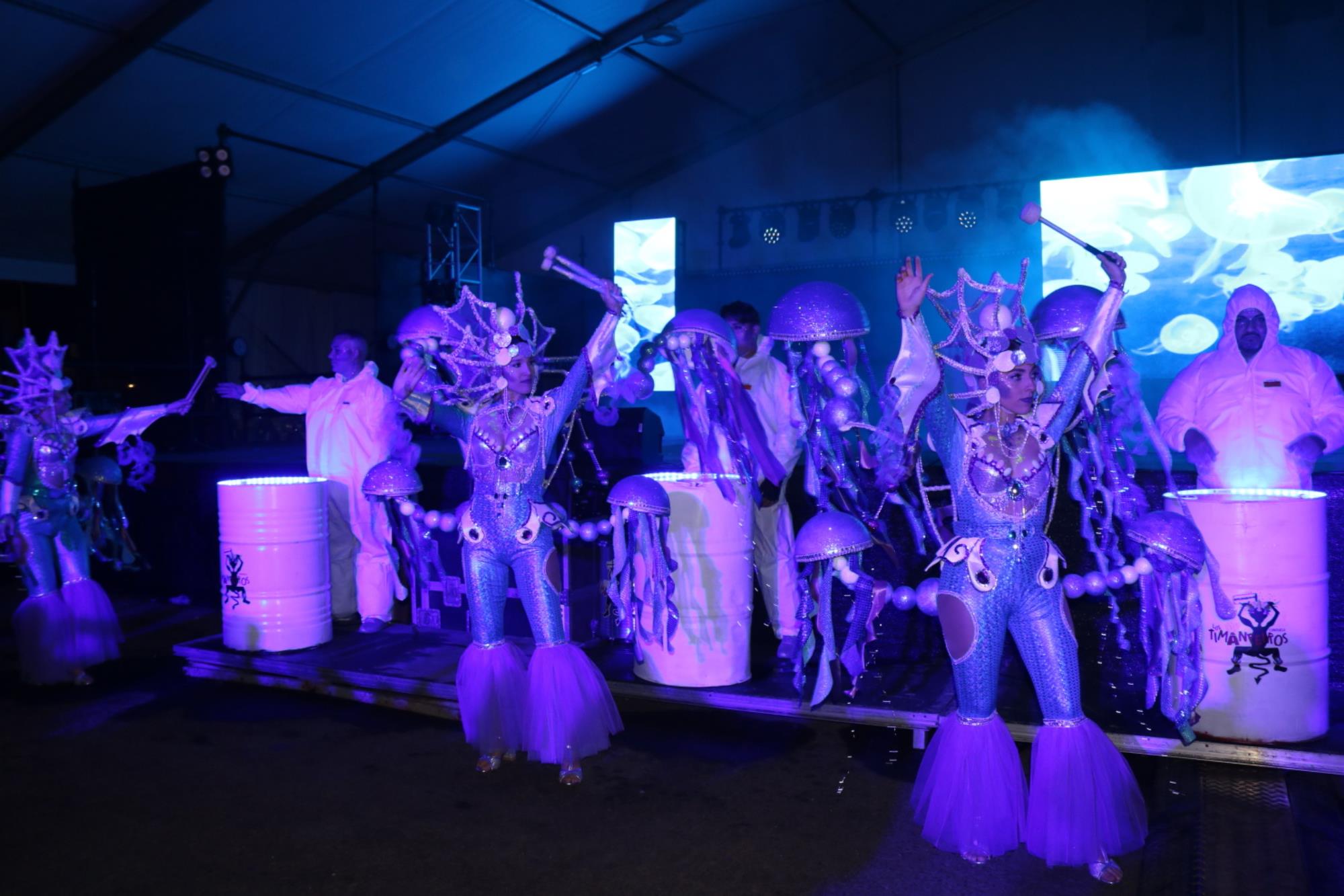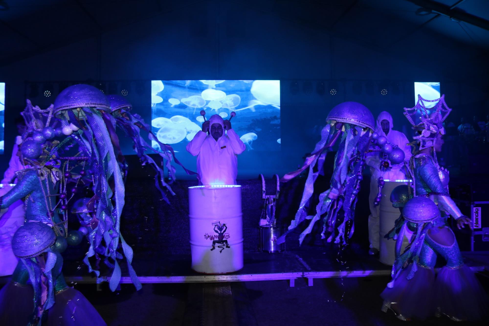 Predominio de tonalidades azules e imágenes de fondos marinos envolvieron la fantasía de creación colectiva a partir de una idea de Blas Noda. Vestuario y tocados pomposos, currados en el espacio taller de Los Timanfeiros por el mismo grupo, dan mayor brillo a la coreografía de Jonatan Gutiérrez que se paseó por el escenario, y también entre el público, a ritmo de la batucada dirigida por Willy Morales. Los Timanfeiros llevaron además una orquesta de 11 músicos para darle más fondo musical a su espectáculo.