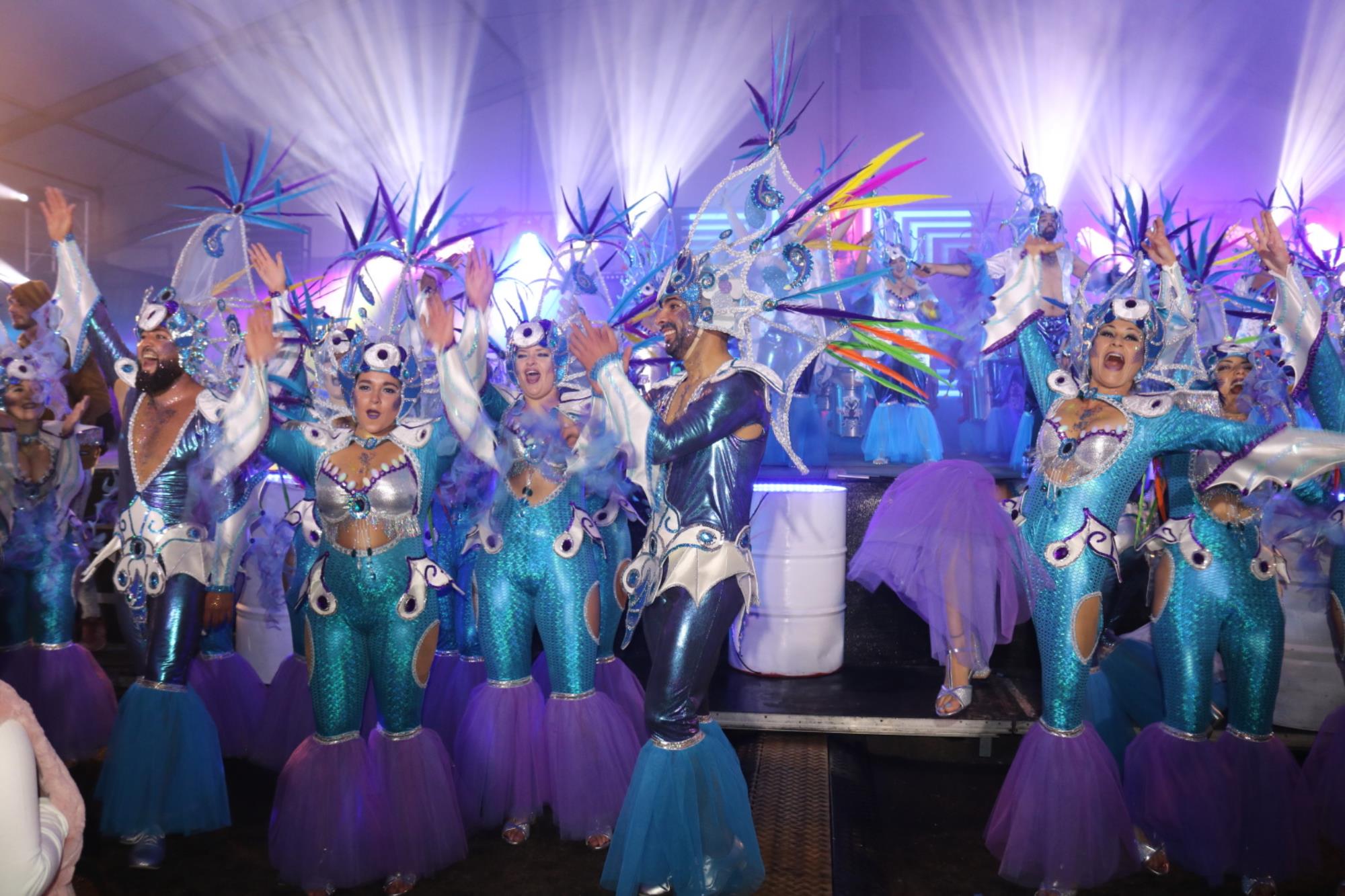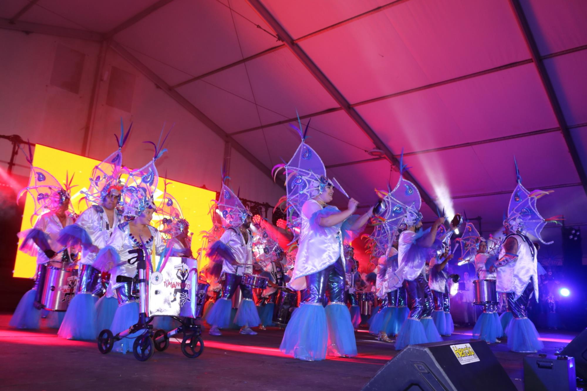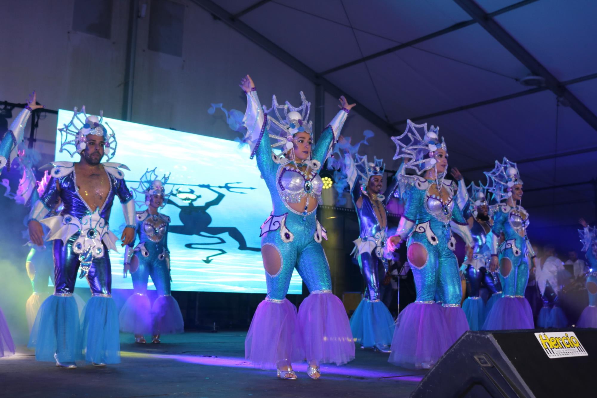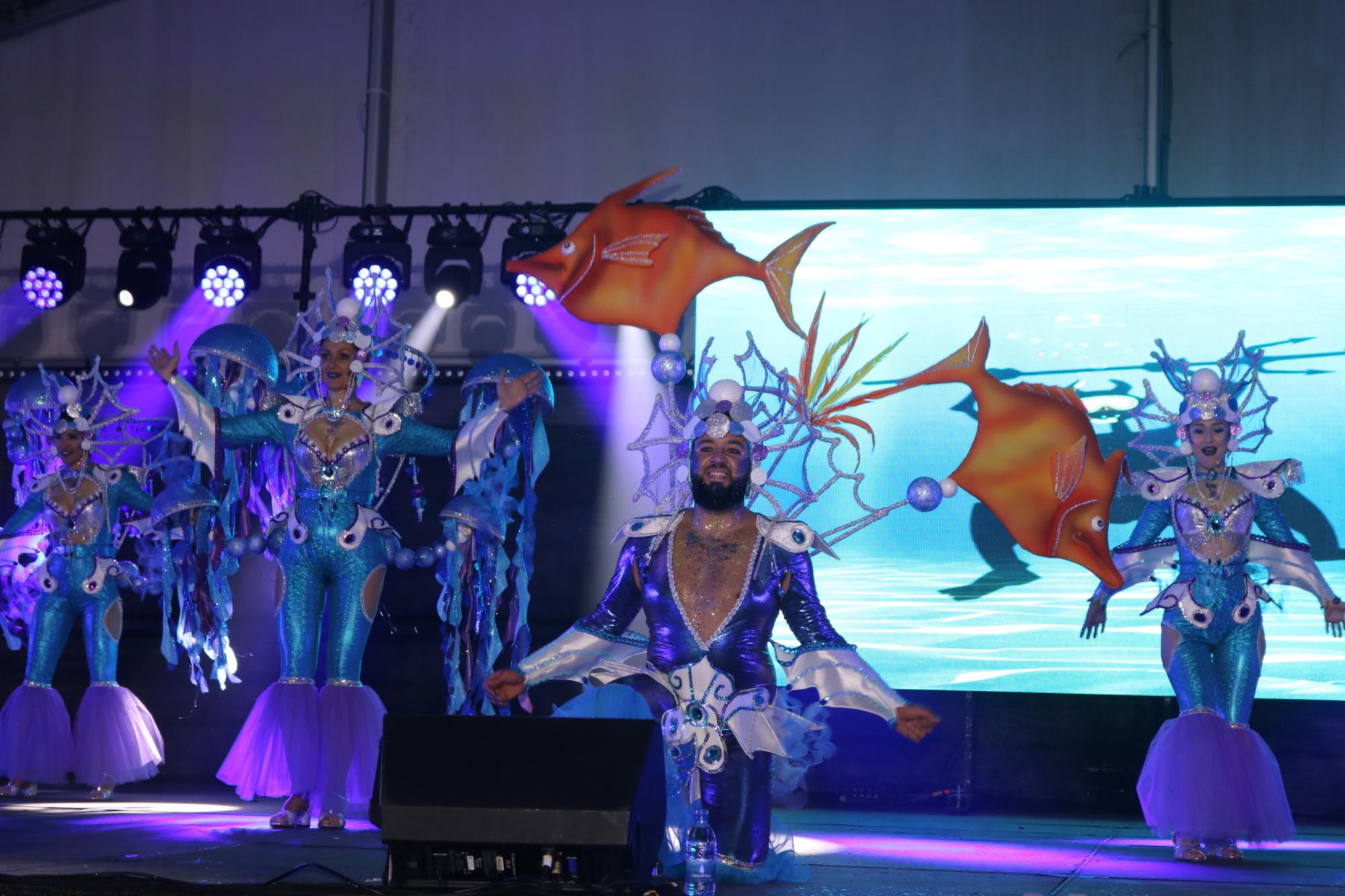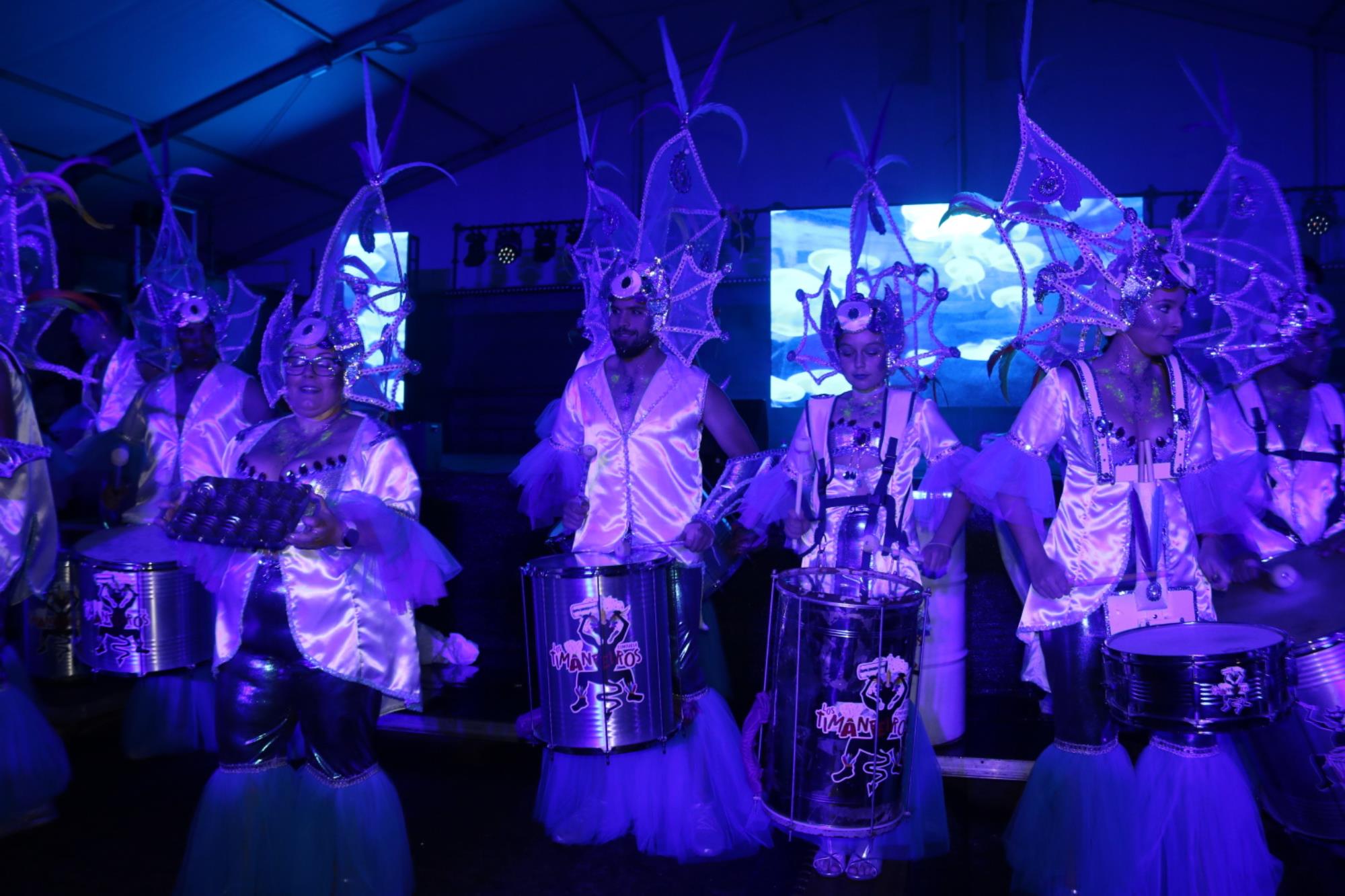 Predominio de tonalidades azules e imágenes de fondos marinos envolvieron la fantasía de creación colectiva a partir de una idea de Blas Noda. Vestuario y tocados pomposos, currados en el espacio taller de Los Timanfeiros por el mismo grupo, dan mayor brillo a la coreografía de Jonatan Gutiérrez que se paseó por el escenario, y también entre el público, a ritmo de la batucada dirigida por Willy Morales. Los Timanfeiros llevaron además una orquesta de 11 músicos para darle más fondo musical a su espectáculo.