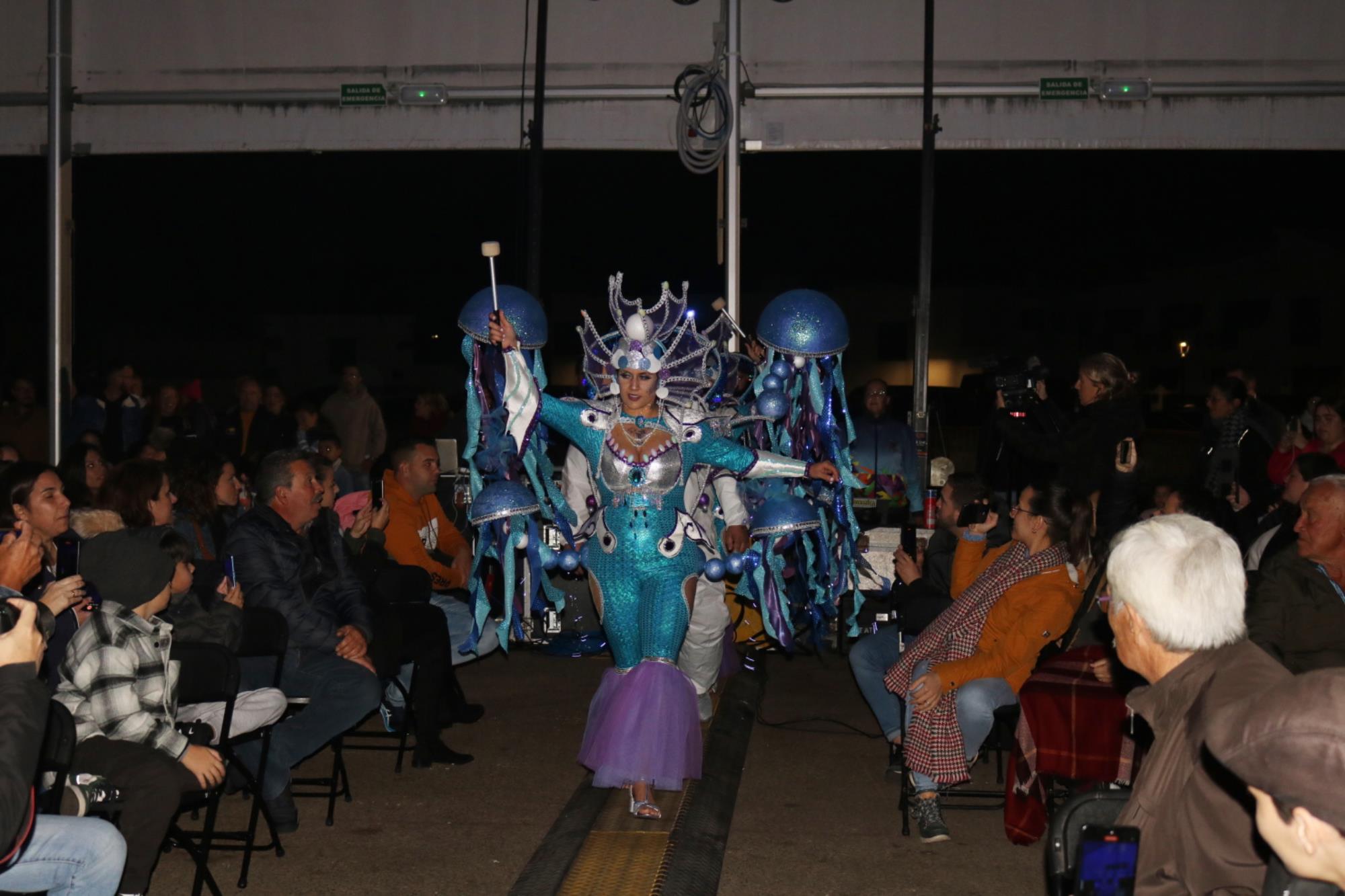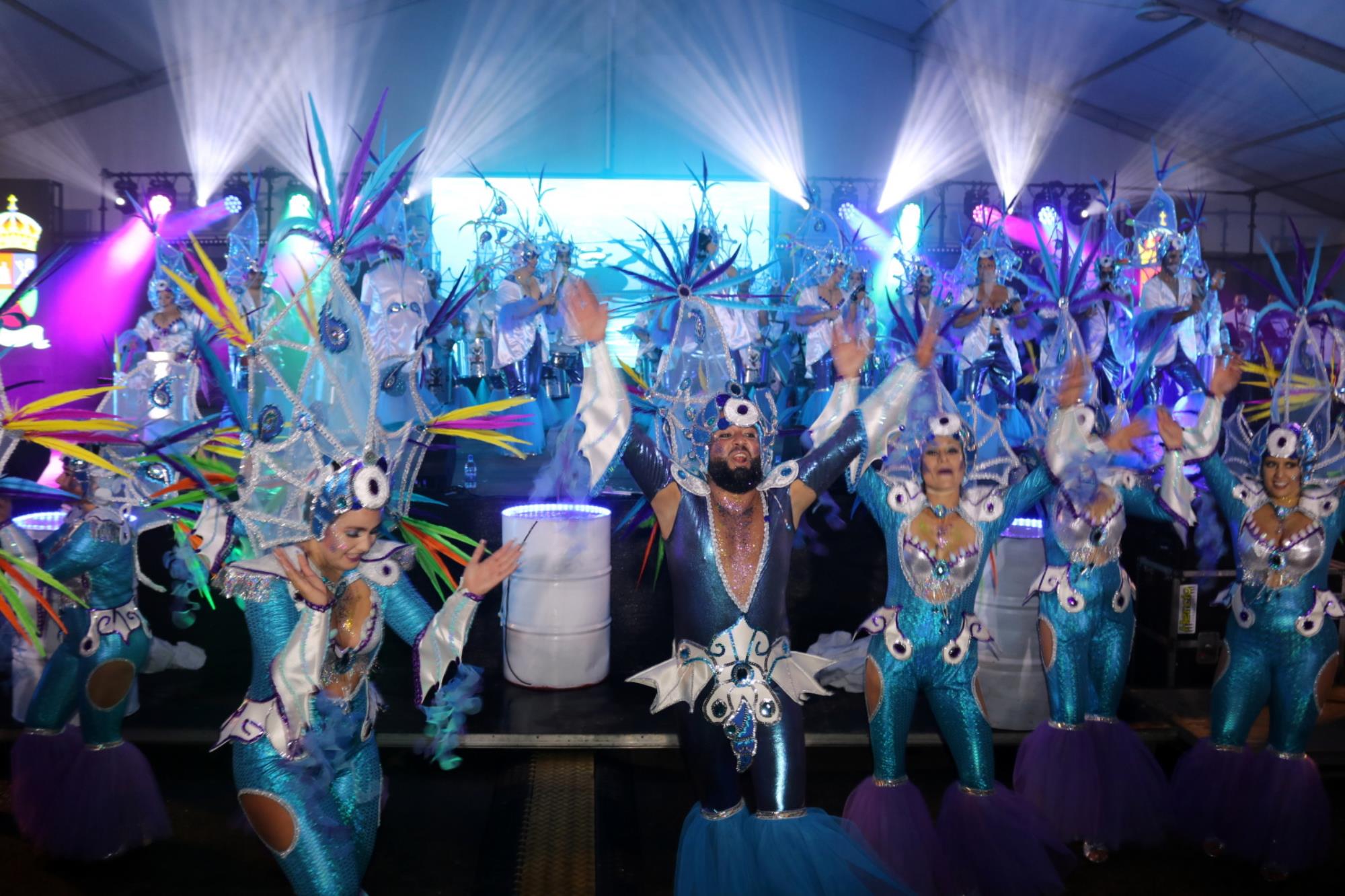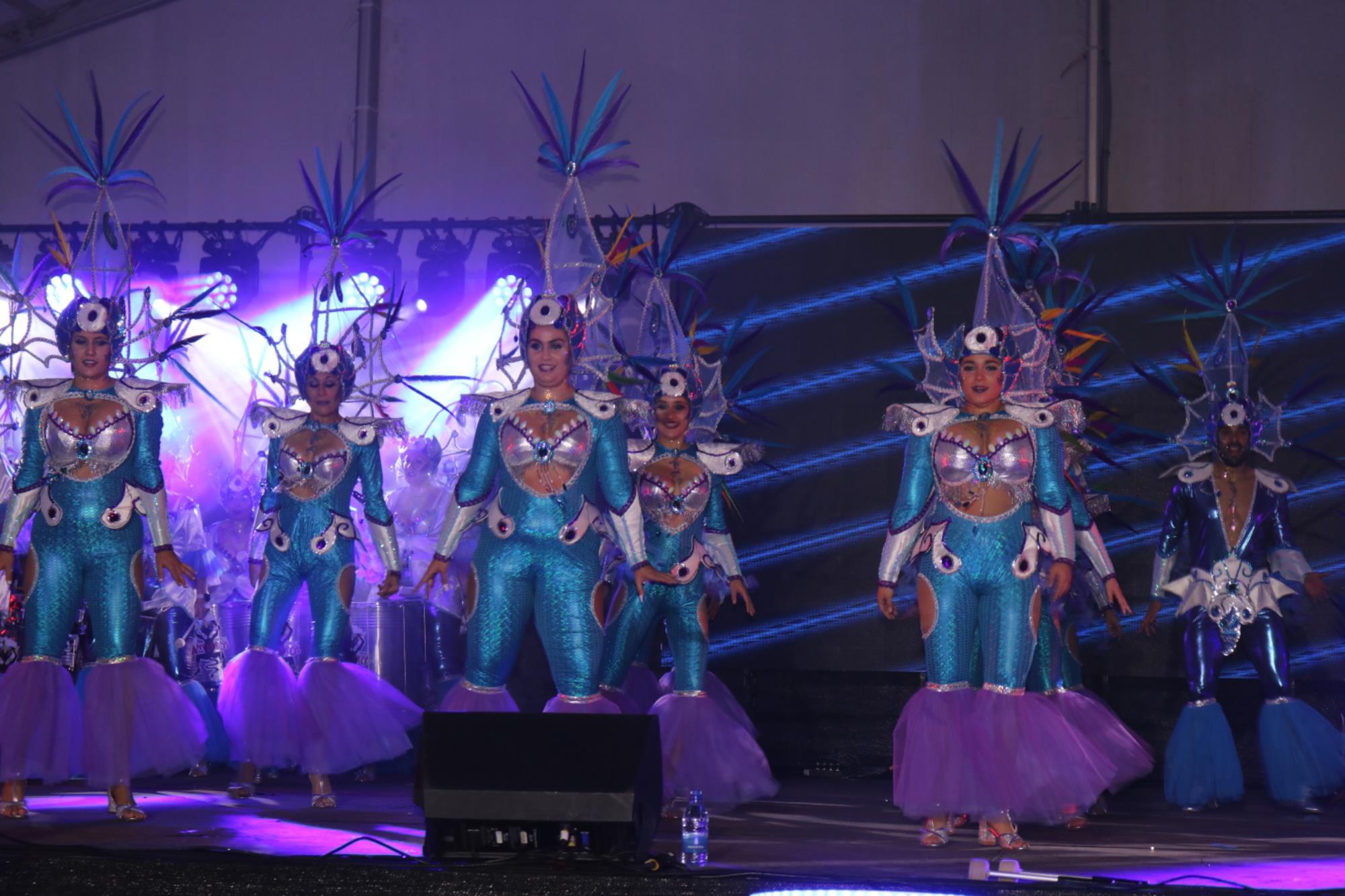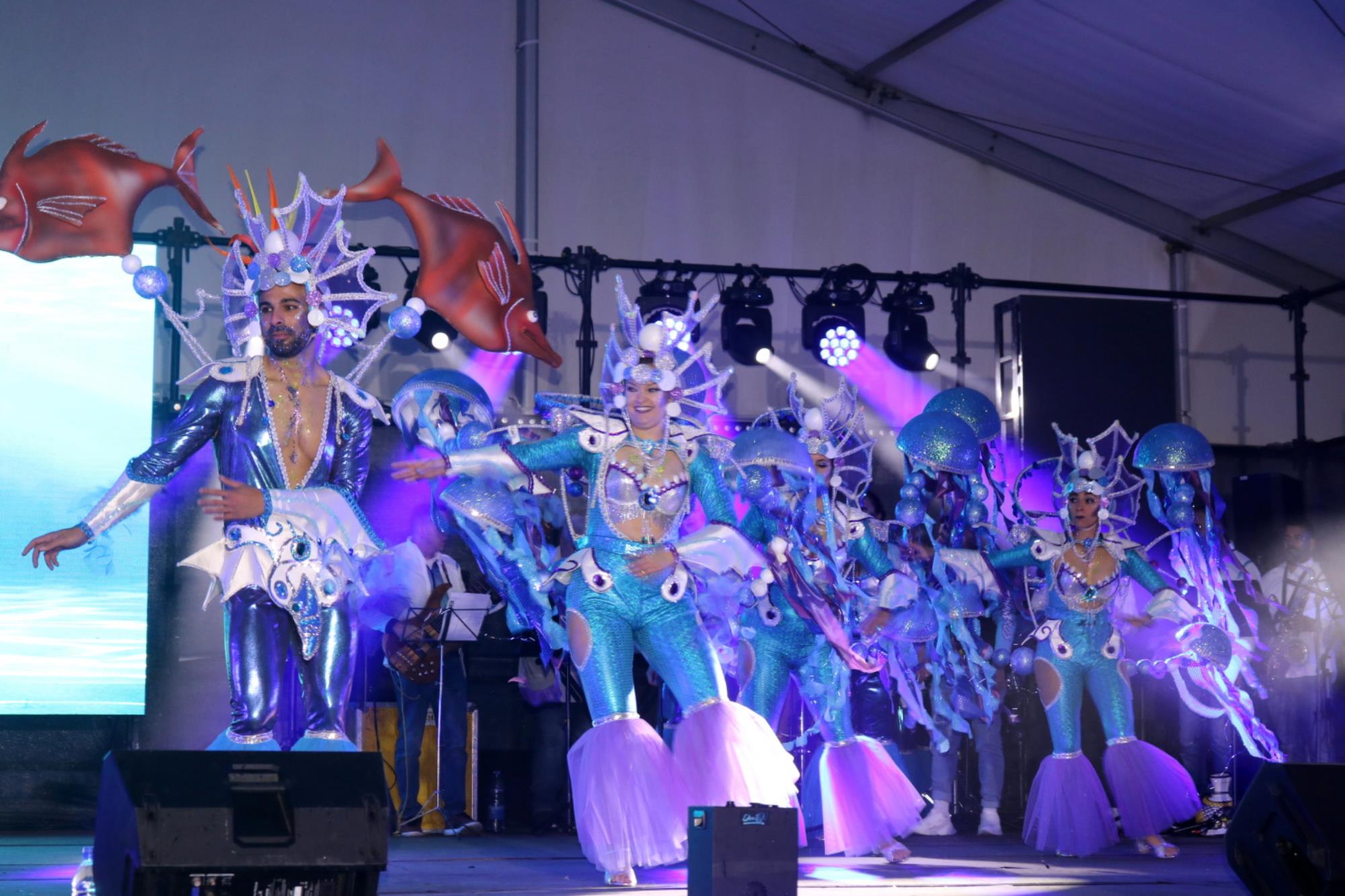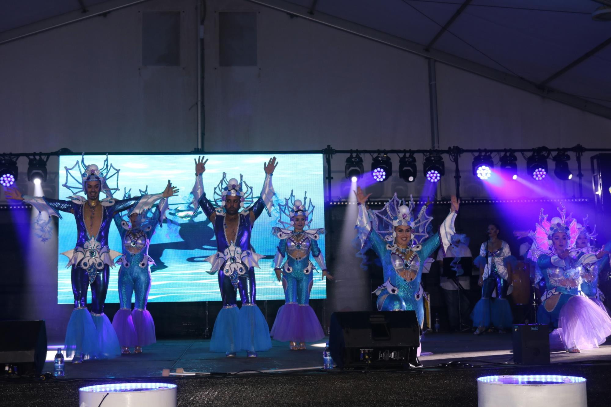 Predominio de tonalidades azules e imágenes de fondos marinos envolvieron la fantasía de creación colectiva a partir de una idea de Blas Noda. Vestuario y tocados pomposos, currados en el espacio taller de Los Timanfeiros por el mismo grupo, dan mayor brillo a la coreografía de Jonatan Gutiérrez que se paseó por el escenario, y también entre el público, a ritmo de la batucada dirigida por Willy Morales. Los Timanfeiros llevaron además una orquesta de 11 músicos para darle más fondo musical a su espectáculo.