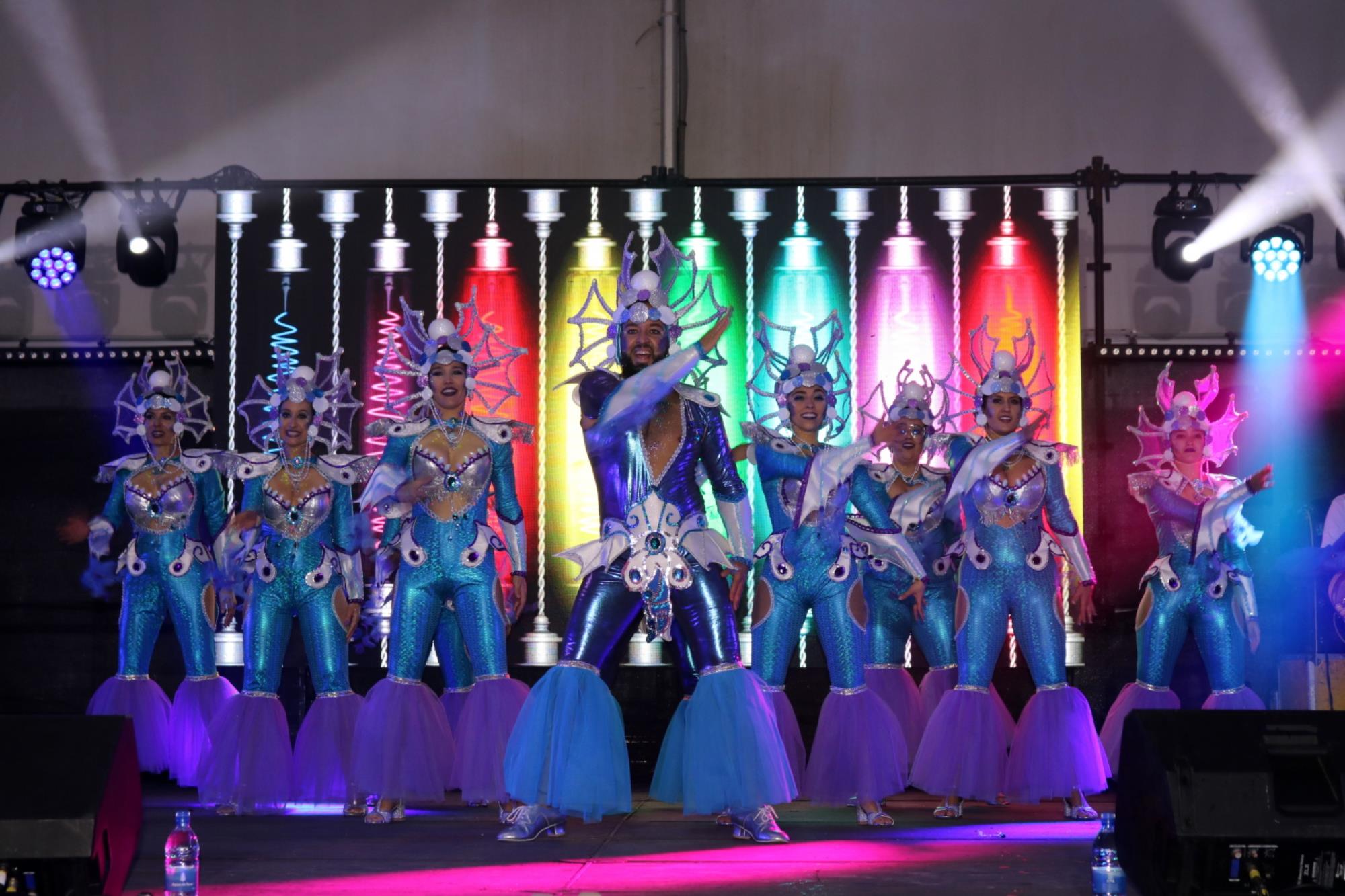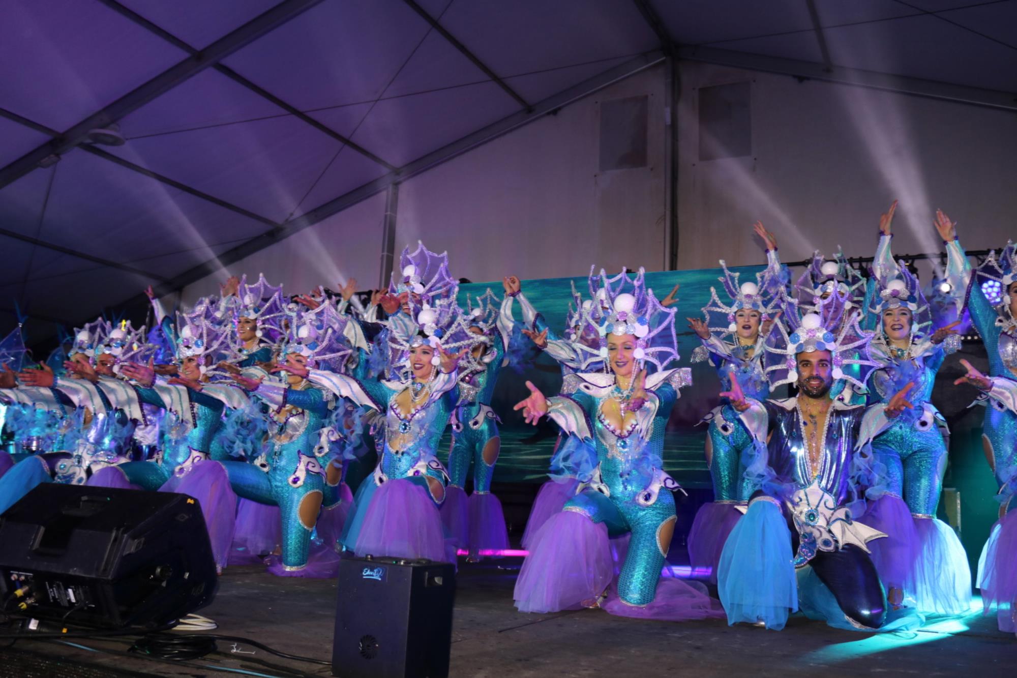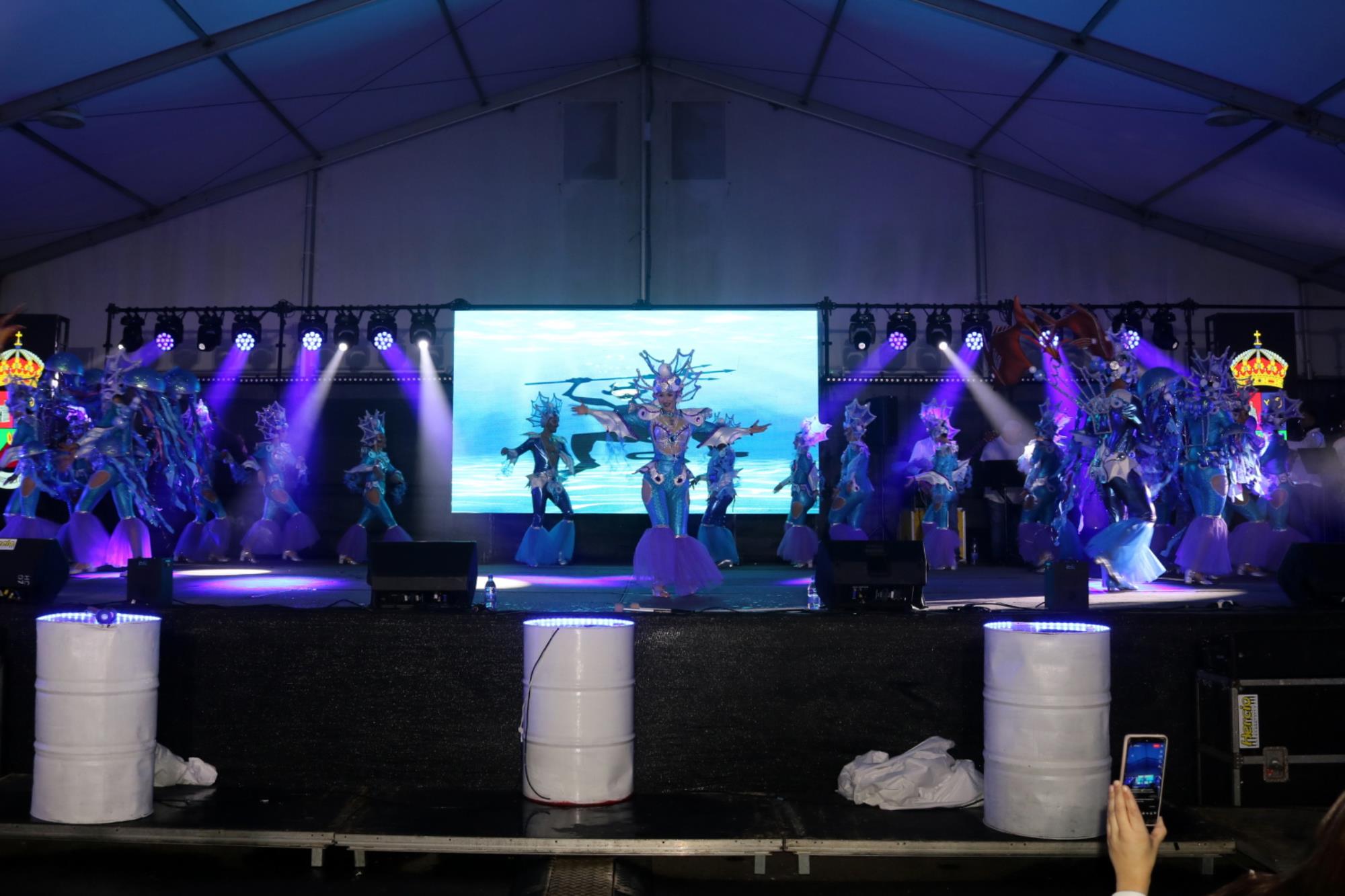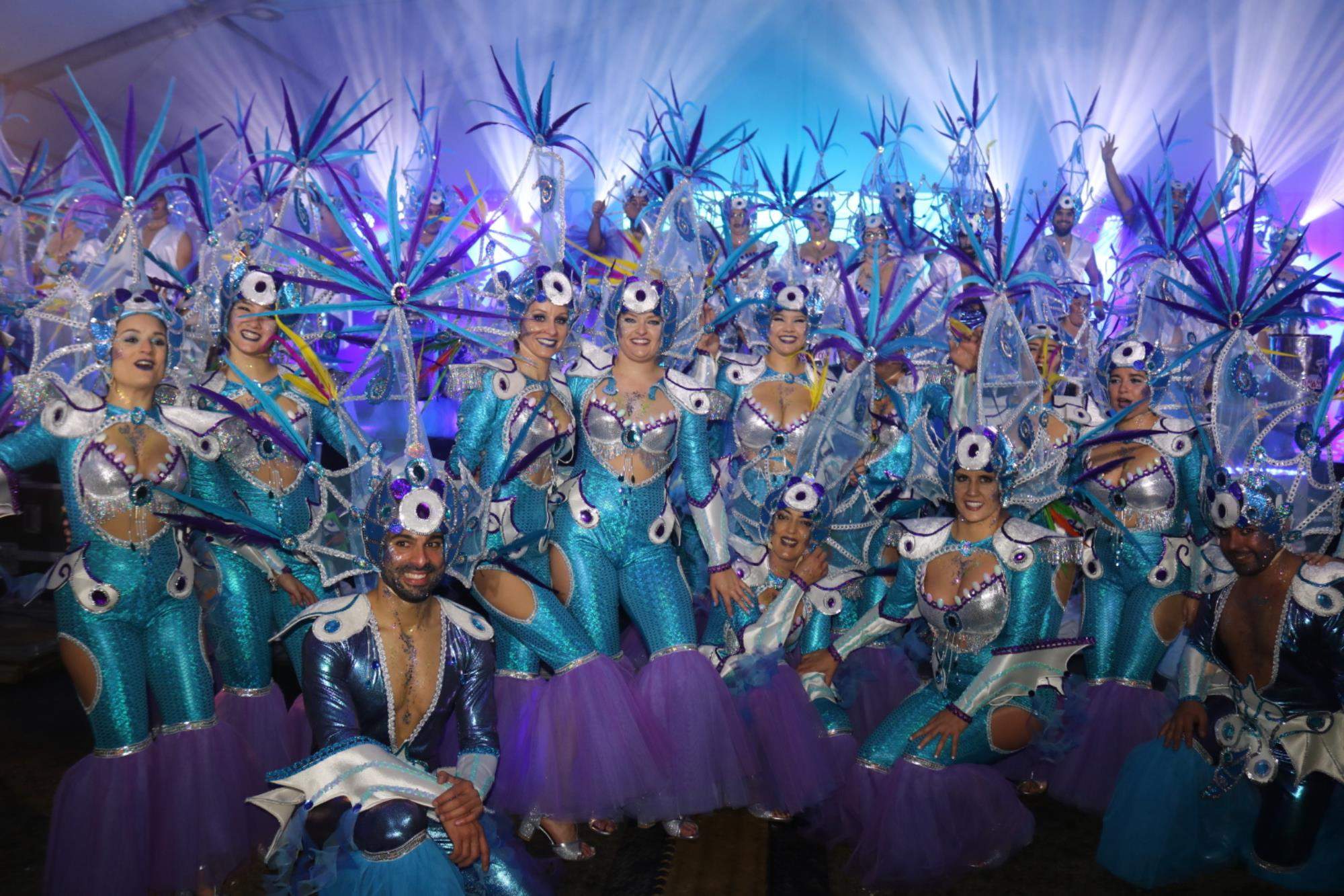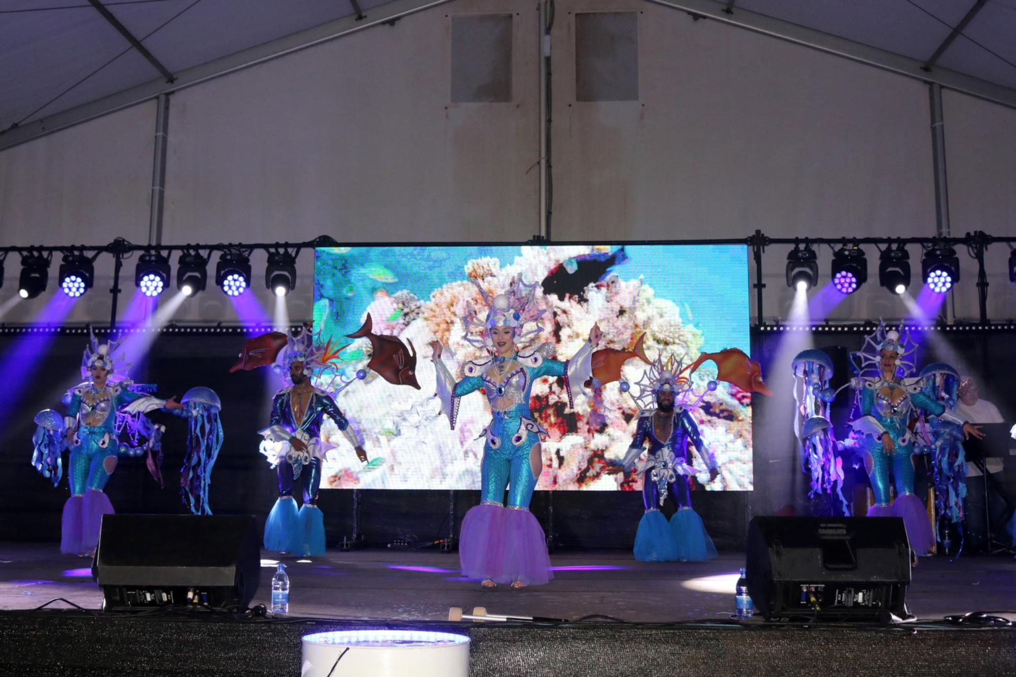 Predominio de tonalidades azules e imágenes de fondos marinos envolvieron la fantasía de creación colectiva a partir de una idea de Blas Noda. Vestuario y tocados pomposos, currados en el espacio taller de Los Timanfeiros por el mismo grupo, dan mayor brillo a la coreografía de Jonatan Gutiérrez que se paseó por el escenario, y también entre el público, a ritmo de la batucada dirigida por Willy Morales. Los Timanfeiros llevaron además una orquesta de 11 músicos para darle más fondo musical a su espectáculo.