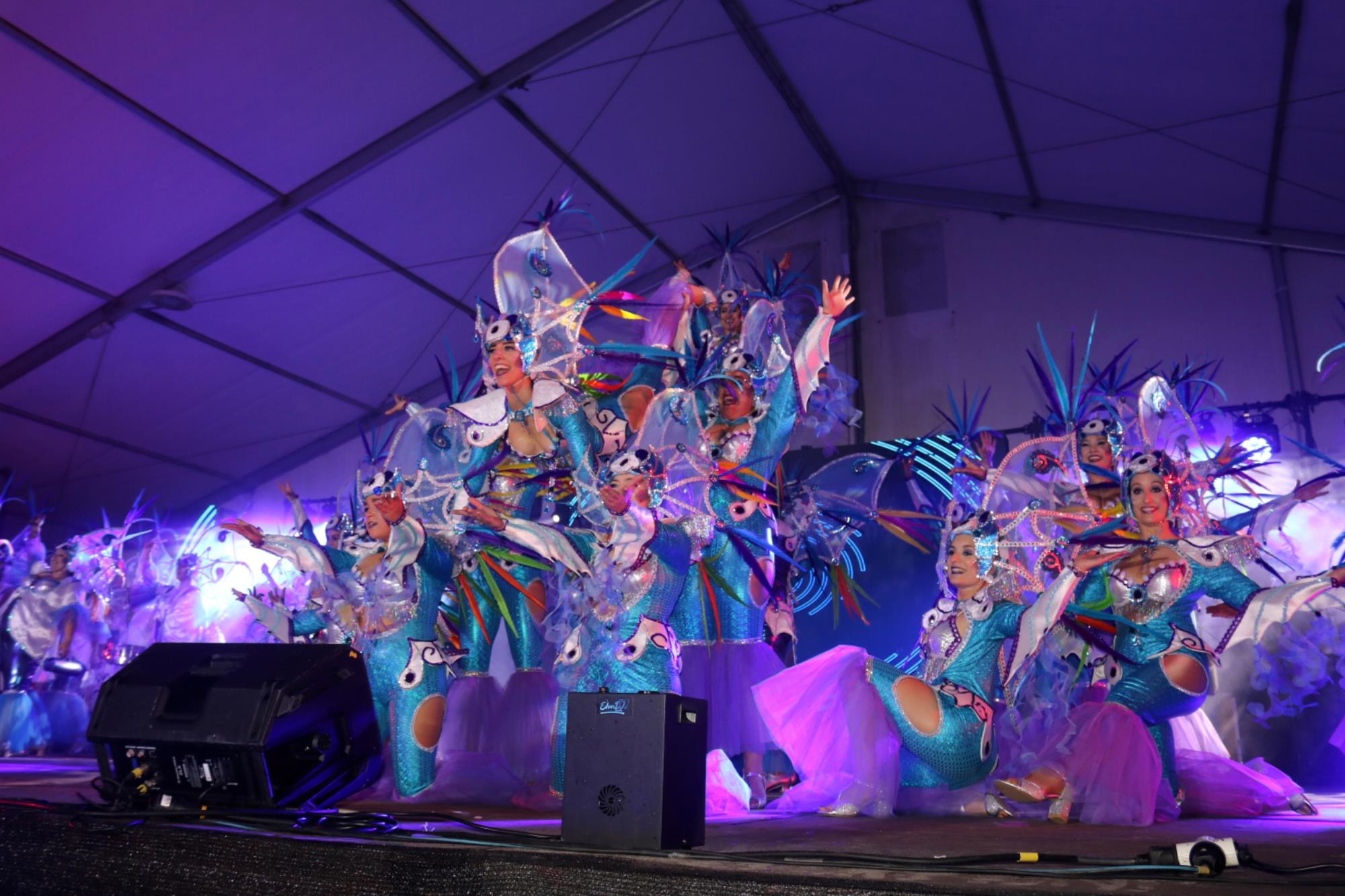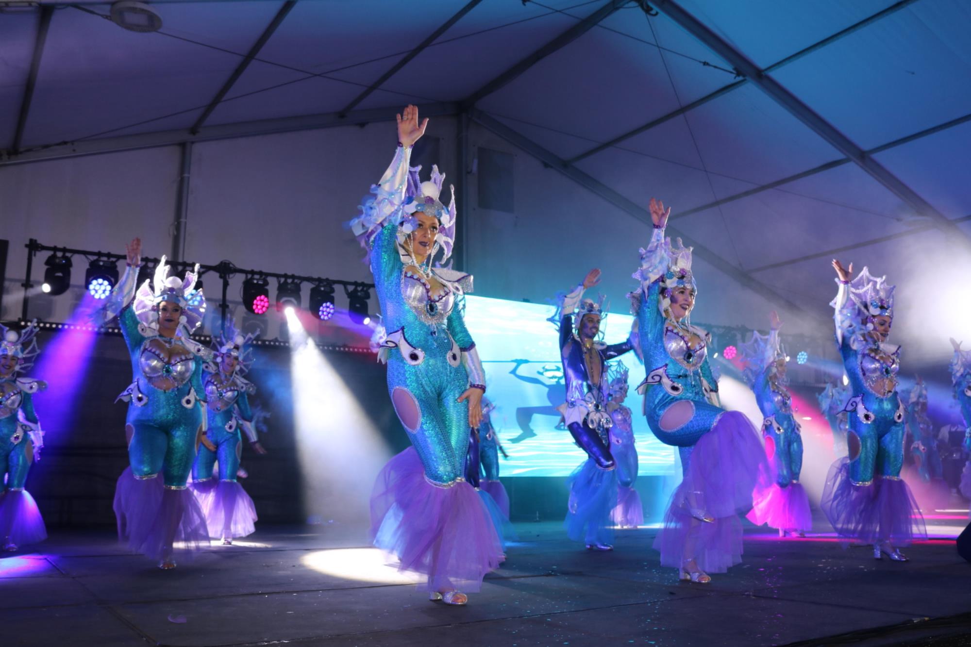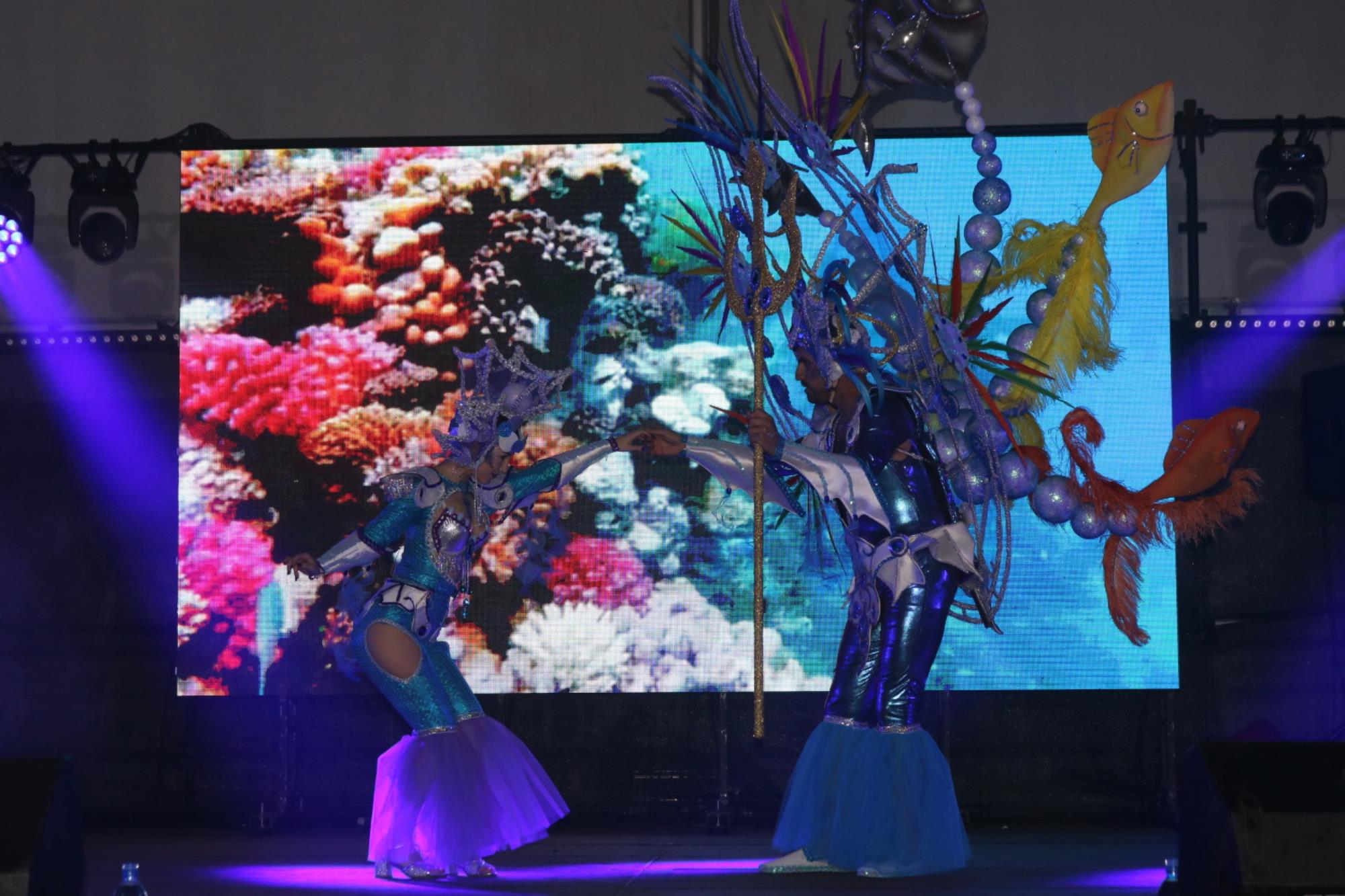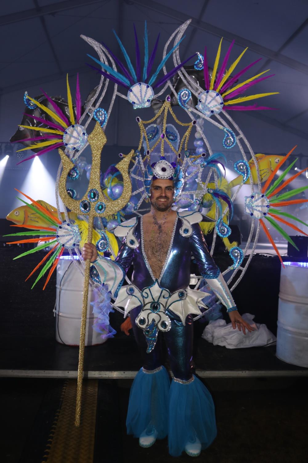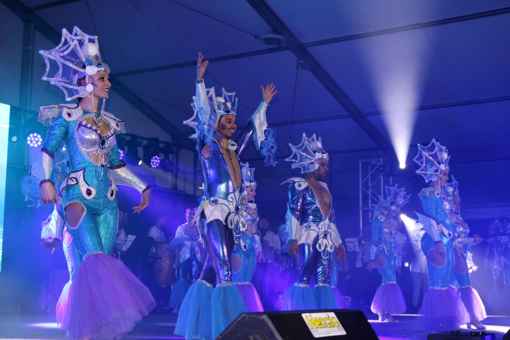 Predominio de tonalidades azules e imágenes de fondos marinos envolvieron la fantasía de creación colectiva a partir de una idea de Blas Noda. Vestuario y tocados pomposos, currados en el espacio taller de Los Timanfeiros por el mismo grupo, dan mayor brillo a la coreografía de Jonatan Gutiérrez que se paseó por el escenario, y también entre el público, a ritmo de la batucada dirigida por Willy Morales. Los Timanfeiros llevaron además una orquesta de 11 músicos para darle más fondo musical a su espectáculo.