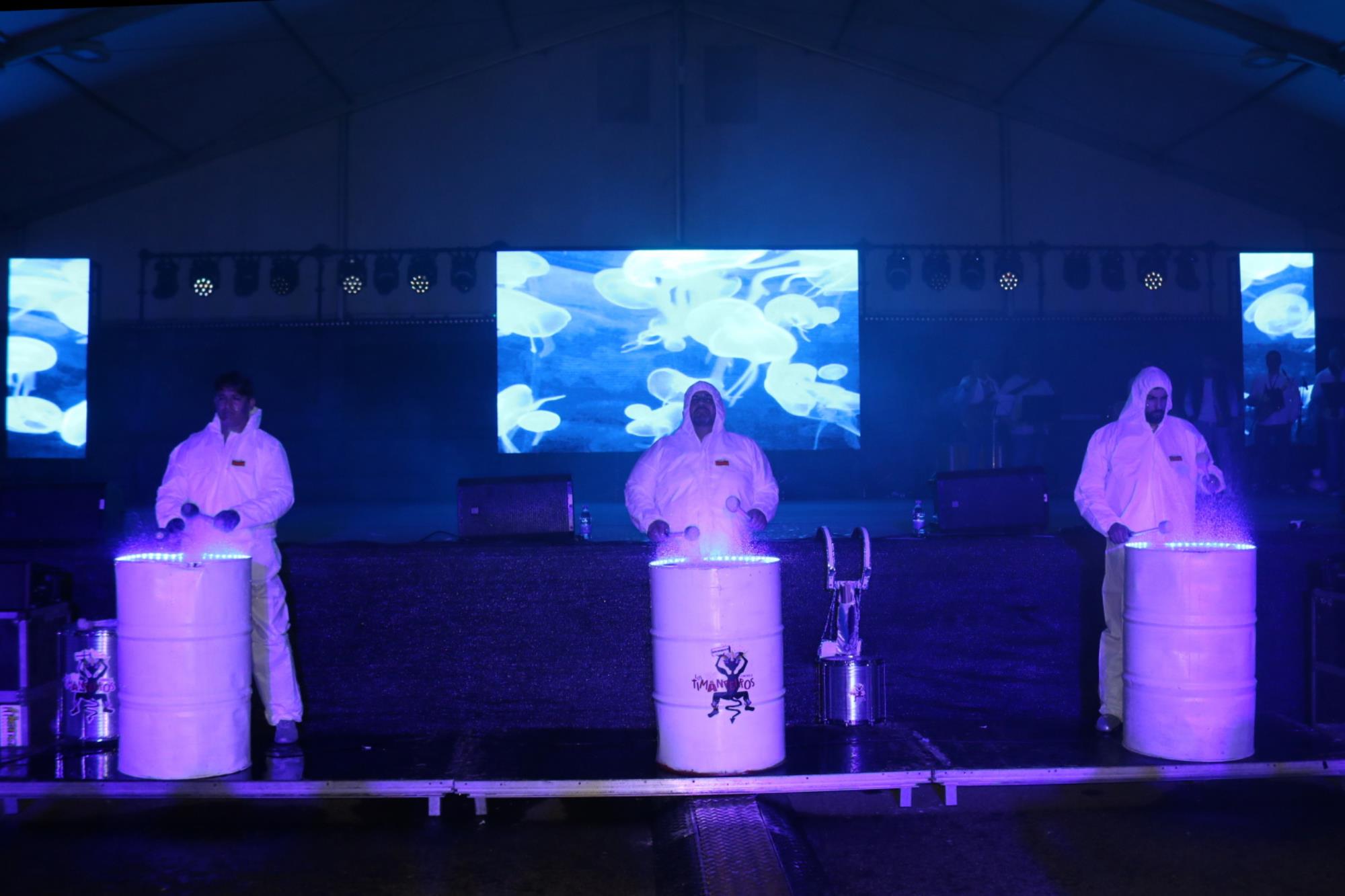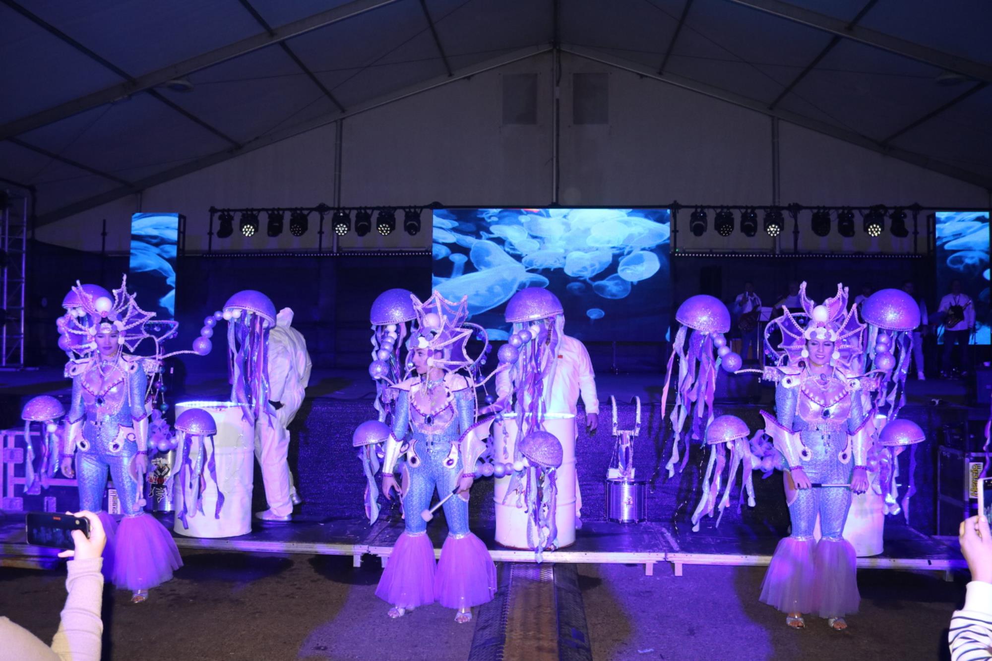 Acorde a su fantasía inspirada en el Dios del Mar de la mitología neozelandesa maorí, los sesenta y siete componentes de Los Timanfeiros, entre sus grupos de baile y percusión, ofrecieron un gran espectáculo que levantó de las sillas a las más de 500 personas que siguieron la actuación en la carpa de Uga.