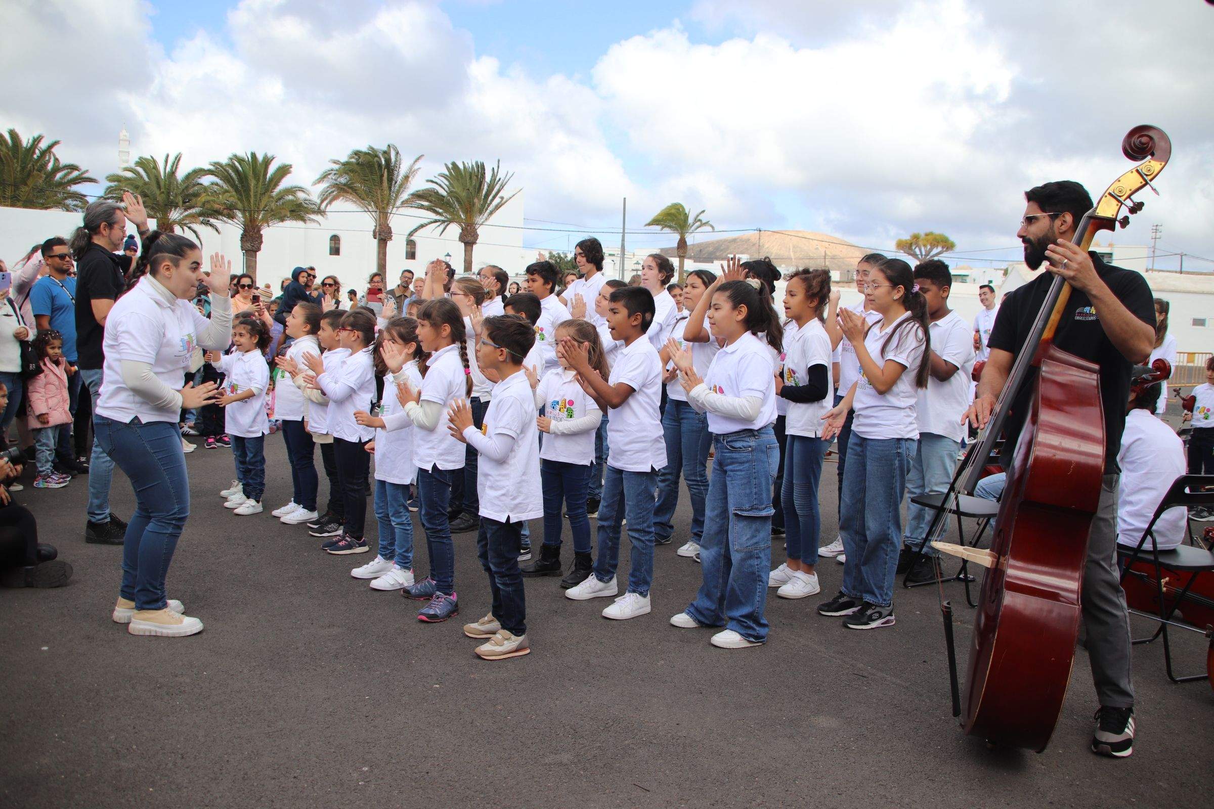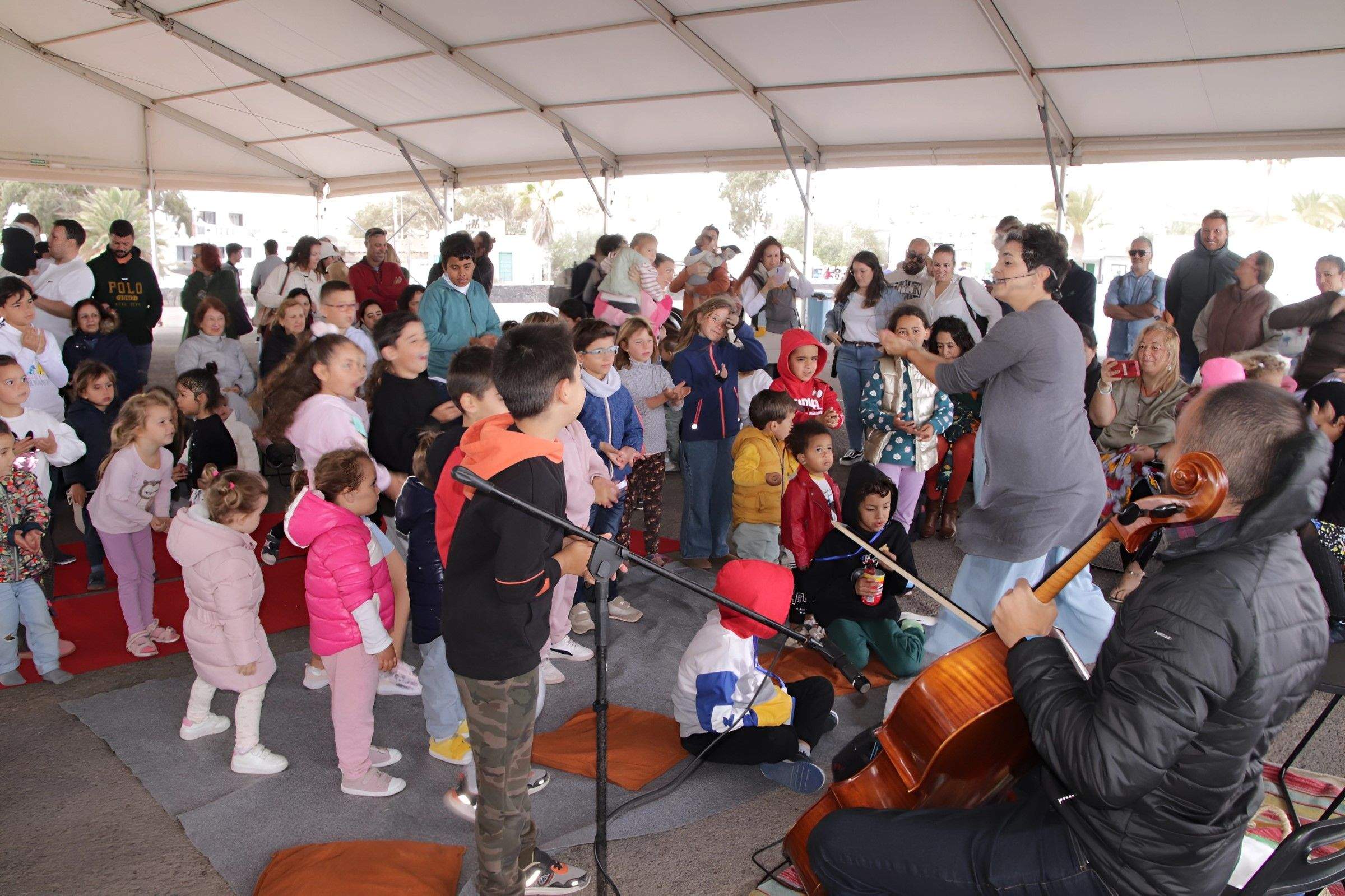 Niños y niñas disfrutaron en la carpa de Uga y su entorno de una amplia zona de juego con diversidad de propuestas creadas a partir de material cien por cien reciclable, también tuvieron la oportunidad de pintar un mural y participar junto a madres, padres y familiares de la actuación musical del grupo de niños, niñas y jóvenes de los barrios arrecifeños de Altavista y Argana Alta vinculados al proyecto ‘Barrios Orquestados’, de la sesión de cuentacuentos de la narradora Vicky Dos Santos y del concierto de cierre del grupo Sonambé, todo en una intensa jornada de 10.30 a 13.30 horas, que ni el viento ni algunas gotas de lluvia pudieron chafar.
