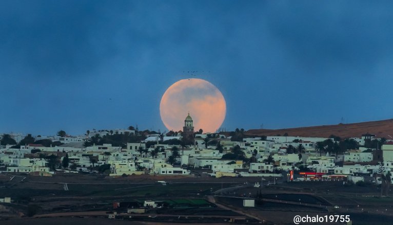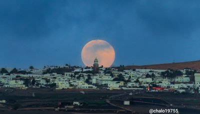 El fotógrafo Marcial Martín ha logrado captar con su cámara una impresionante imagen de la Luna llena que iluminó la noche en Lanzarote en la jornada de este miércoles. La fotografía, tomada desde el pueblo de Tao con un objetivo de 100mm40mm, muestra a la Luna saliendo detrás de Teguise con un contraste entre el color anaranjado del satélite y el blanco de las casas de la isla.