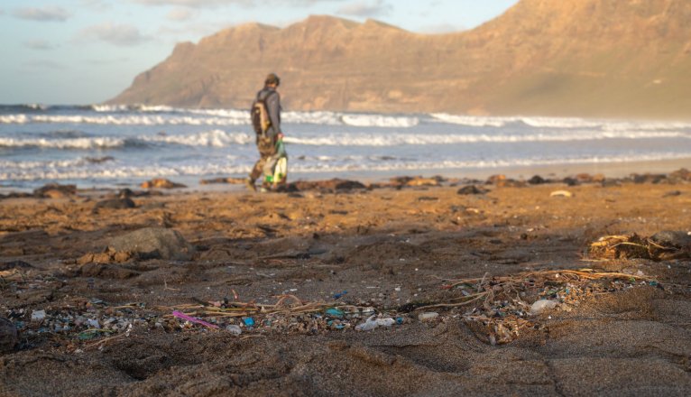 Los plásticos de colores arrastrados por el oleaje inundan las playas de Lanzarote. Trozos de tapones, botellas, colillas, cuerdas y aparejos de pesca se cuelan entre miles de microplásticos que marcan la forma de las olas en la orilla. Un paseo sobre arena y algunos callaos se convierte en un intento constante para no pisar restos de basura.