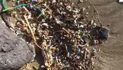 Todo tipo de materiales como 'pellets' de plástico, microplásticos, tapones de botellas, trozos de cuerdas, etc. es lo que recubre la arena de la playa, haciendo un recorrido en fila que ocupa gran parte de ella. Una imagen que advierte de la contaminación y suciedad que se va acumulando con el paso del tiempo.