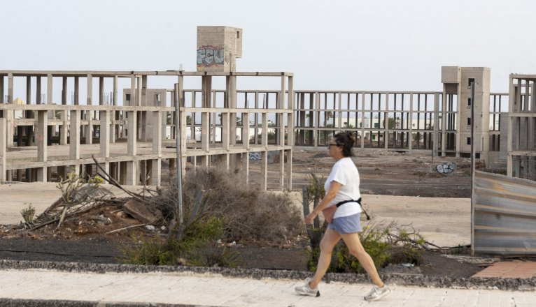 La Avenida de Las Palmeras de Costa Teguise, la vía neurálgica de esta localidad turística, sigue guardando recuerdos urbanísticos de su época más voraz. A unos metros de donde decenas de familias viven esperando una orden de desahucio de viviendas inacabadas se levanta un esqueleto de hormigón, el de la parcela 216, que resiste al paso del tiempo entre establecimientos turísticos que cumplen con la legalidad.