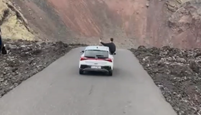 Un turista ha vuelto a grabarse mientras sacaba medio cuerpo fuera del coche mientras circulaba dentro del Parque Nacional de Timanfaya. Los hechos han ocurrido sobre las 10.00 horas de este lunes, momento en el que alguien que viajaba en una guagua pudo inmortalizar este peligroso comportamiento.