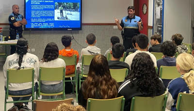 Agentes de la Guardia Civil del Puesto Principal de Tías y de la Jefatura de Policía Local de Tías impartieron esta semana ocho sesiones informativas al alumnado del Instituto de Enseñanza Secundaria (IES) Puerto del Carmen sobre Seguridad Vial en el uso de los Vehículos de Movilidad Personal, en su variante conocida popularmente como patinetes eléctricos.