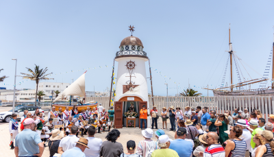 Además, durante el homenaje, los miembros de la parranda depositaron una ofrenda a los pies de la imagen de Nuestra Señora del Carmen, situada en la capilla instalada en el interior del monumento.