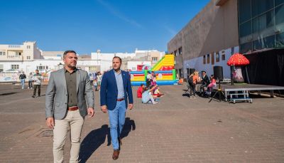 El vicepresidente y consejero de Obras Públicas del Cabildo de Lanzarote, Jacobo Medina, junto al alcalde y responsable de Obras, Yonathan de León, visitaron el evento que tuvo lugar por la mañana en el local y la plaza anexa del Pabellón de Argana Alta.