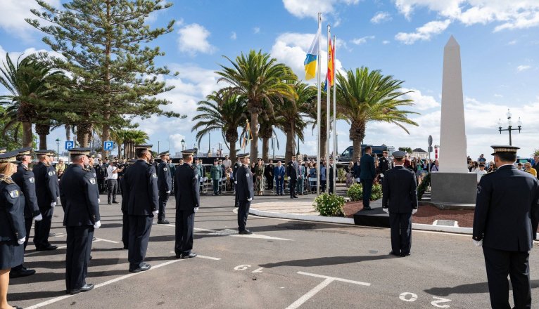 Durante el acto, el alcalde invitó al subcomisario jefe de la Policía Local de Arrecife, José Antonio Lasso Tabares, y al propio escultor a descubrir la placa situada en la base del obelisco, que permanecía cubierta con la bandera de España. En ella puede leerse el mensaje: “Todos damos algo, algunos lo dieron todo. En memoria perenne a todos los compañeros que ya no están y todos los policías caídos en acto de servicio”.