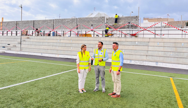 El alcalde de Arrecife, Yonathan de León, el consejero insular de Obras Públicas, Jacobo Medina, y la concejal de Deportes, Eli Merino, visitaron este martes las obras que permitirán estrenar en el segundo semestre de este año la nueva la visera en el campo municipal de fútbol del Puerto del Arrecife, junto a las piscinas municipales.