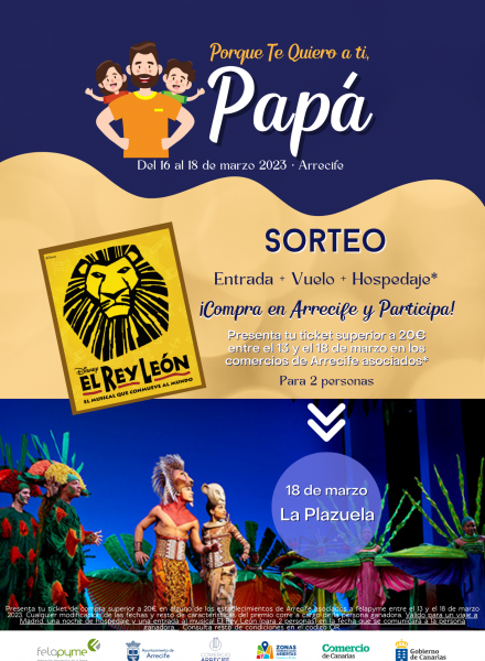 Las personas que compren en Arrecife entre el 13 y el 18 de marzo podrían acceder a un sorteo de dos entradas para el musical del Rey León en Madrid, con viaje y hospedaje incluidos. Los requisitos son: realizar compras en los comercios adheridos y superar a 20 euros.