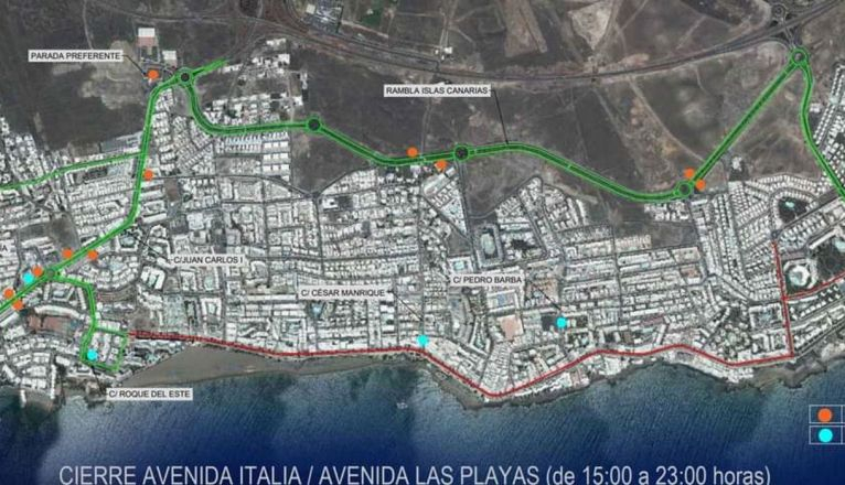 Los accesos al tráfico de vehículos, así como las paradas de guaguas y taxi se verán afectados debido a la celebración del Gran Coso Carnavalero de Puerto del Carmen el sábado 25 desde las 15 horas hasta las 22:00 horas. En los planos pueden verse los cortes más importantes y las ubicaciones de las paradas de los transportes públicos.