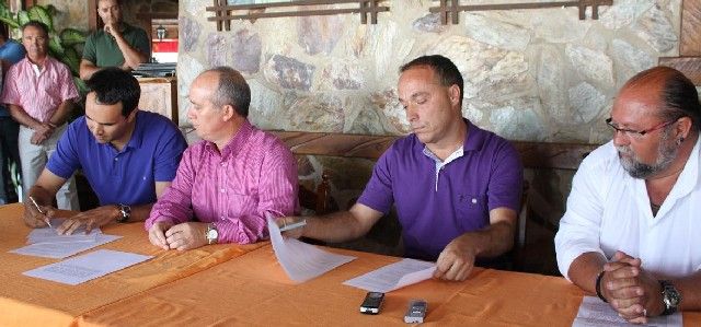 El presidente del Comité Local del PP de Tías, Pancho Hernández, y el secretario general y el portavoz de la formación política San Borondón, Jerónimo Robayna Hernández y Nicolás Saavedra San Ginés, respectivamente, han firmado este martes un acuerdo para la gobernabilidad en el Ayuntamiento de Tías.