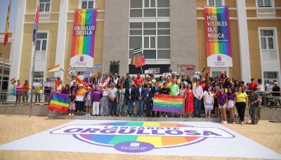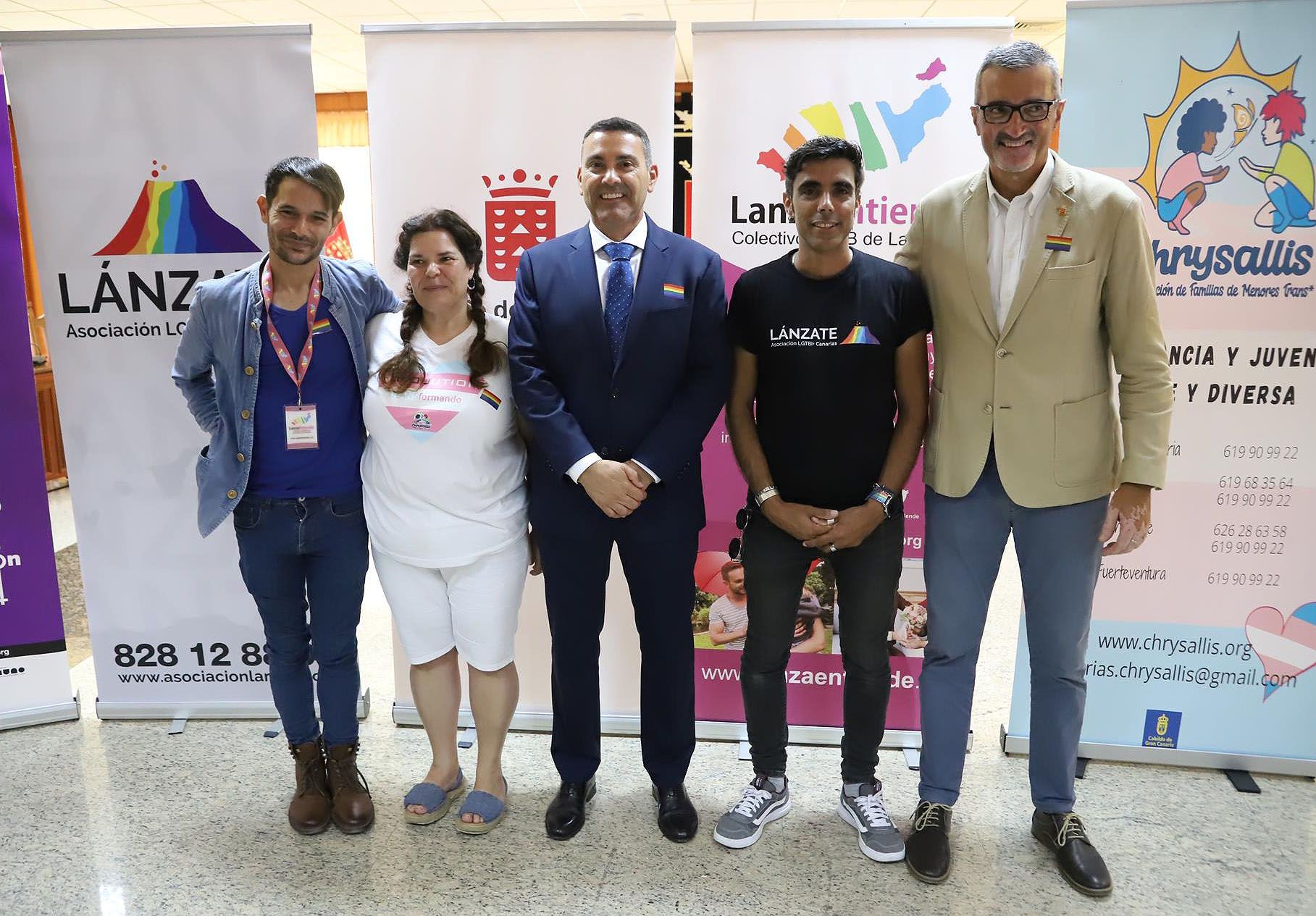 El acto ha acabado con una foto de grupo de todos los colectivos en la fachada del Cabildo, con una lona de siete metros sobre la explanada con un eslogan que rezaba "Lanzarote Orgullosa" y una bandera humana con camisetas con los colores del arcoíris, que representan al colectivo.